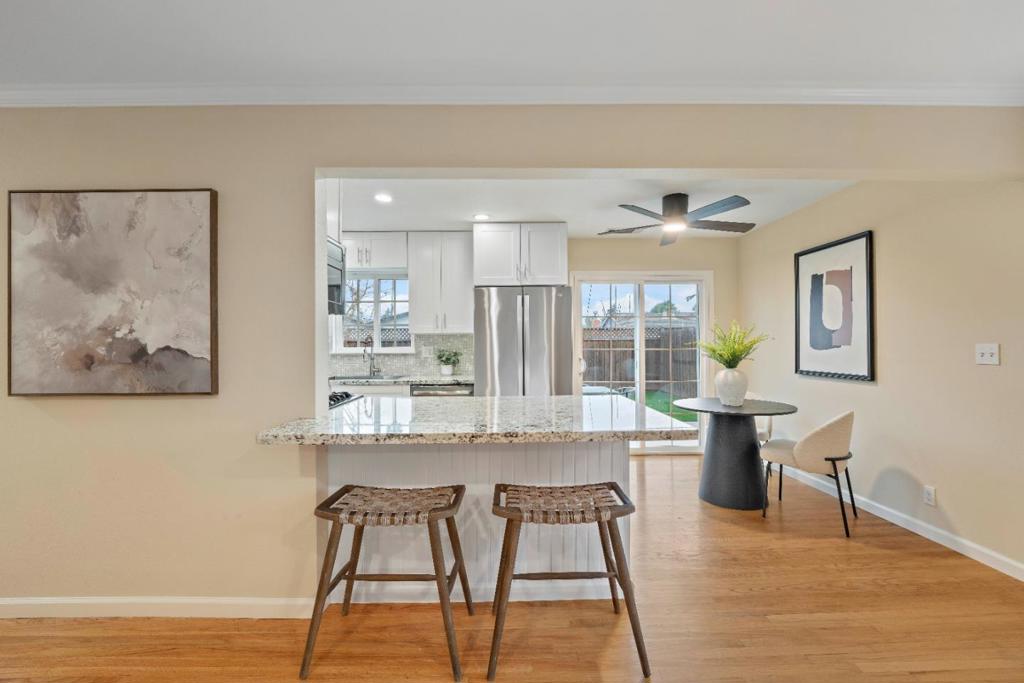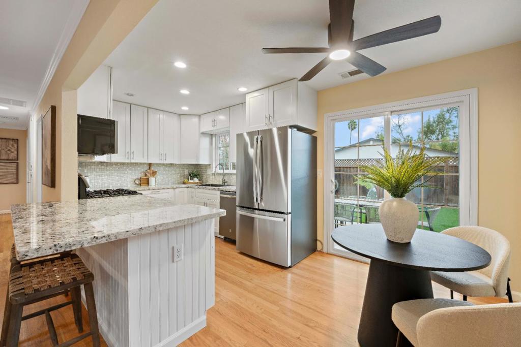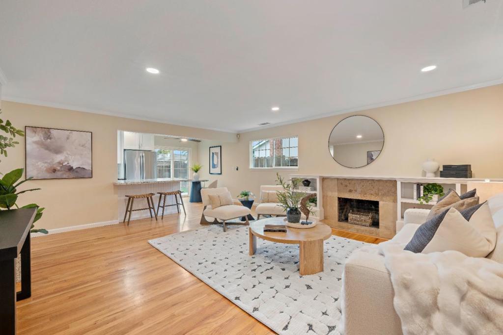 Welcome to 963 Connie Drive, a beautifully updated Campbell retreat blending modern style with effortless indoor-outdoor living. Step inside to warm hardwood floors, recessed lighting, and a light-filled living room with a cozy fireplace. The refreshed kitchen features white shaker cabinetry, granite countertops, stainless steel appliances, and a breakfast bar that flows seamlessly into the dining and living areas - perfect for everyday living and entertaining. The spacious primary suite offers direct backyard access and a remodeled bath, while two additional bedrooms provide flexibility for guests, a home office, or growing needs. Both bathrooms showcase tasteful updates and clean, contemporary finishes. Outside, enjoy your own private oasis. The low-maintenance front yard features striking drought-tolerant landscaping and excellent curb appeal, while the backyard offers a large patio, lush turf, and space to relax, play, or host gatherings under the palms. Located on a quiet street just minutes from downtown, parks, shopping, and major commute routes, this move-in-ready home delivers style, comfort, and convenience. Don't miss your opportunity to make it yours.