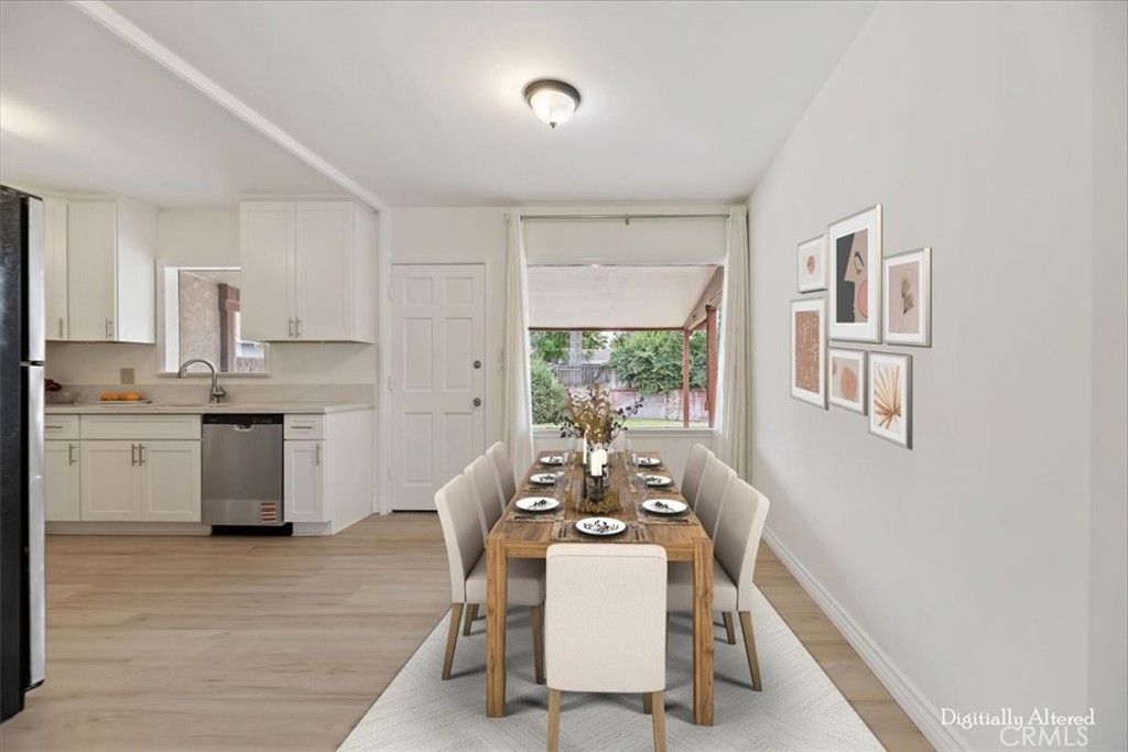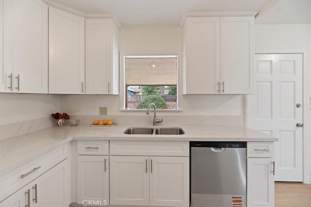 This beautiful home is move in ready with new exterior and interior paint; upgraded kitchen & bath; new carpeting in living room, dining area and two bedrooms. The sparkling bathroom has a separate tub and a separate shower and a vanity. The bright remodeled kitchen has new white counters and cupboards with self-closing drawers. Automatic sprinklers front and back. Great curb appeal. The garage is a 2-car attached garage with rollup door. The garage might be a good option and consideration for a conversion to an ADU (Accessory Dwelling Unit). This is a fantastic opportunity for a first-time buyer to own a well-maintained 1950's home with two bedrooms; and a spacious yard. This home offers close freeway access and is close to schools, shopping, medical facilities and minutes away from two major golf courses. Metrolink commuter rail is within 7 miles. Don't miss out on this property. NOT FOR RENT OR LEASE.