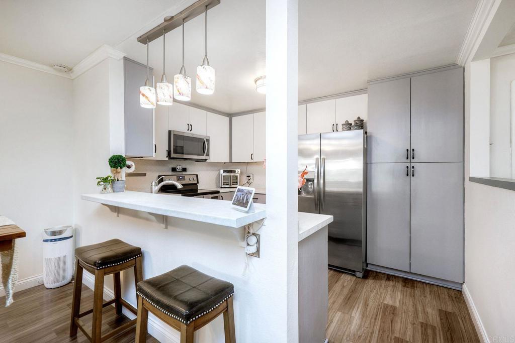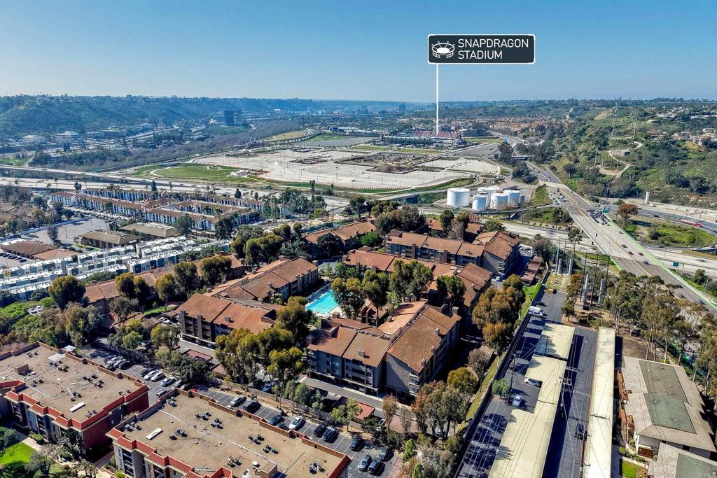 Step inside through a beautifully designed entryway that sets the tone for this stylish and inviting condo in the sought-after community of Mission Ridge in the heart of Mission Valley! This 2 bed 2 bath single-level living end unit is a generous 1,153 est sq ft and anchored by a stunning electric fireplace with heat control, creating the perfect ambiance for cozy evenings at home. The kitchen shines with stainless steel appliances, a convenient breakfast bar, and an easy, open flow ideal for both everyday living and entertaining. The home features dual-pane windows, coffee colored luxury vinyl plank flooring, in-unit stackable washer/dryer and AC. You’ll love the generous primary bedroom with an ensuite bath and a spacious walk-in closet plus a second closet for even more flexibility. Enjoy the convenience of assigned covered parking with a large private storage cabinet, and elevator access within the building. (Bonus: if two people occupy the condo, a second unassigned parking space is permitted.) Guest parking is also available. A sliding glass door leads to your outdoor patio – perfect for morning coffee or evening relaxations – complete with an oversized walk-in storage room for added functionality. The community offers lush tropical grounds, a dog play area, incredible pool, hot tub, BBQ area, lighted tennis courts, fitness center, racquetball and sauna — giving you that resort-style feel right at home. And let’s talk about location… Location. Location. Location. Just minutes from Snapdragon Stadium, major freeways, Mission San Diego Transit Station, premier shopping, dining, and all of Mission Valley’s hottest spots. This complex is VA & FHA approved
