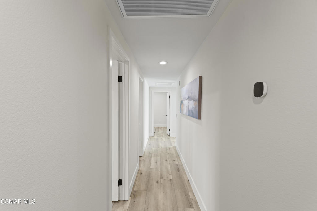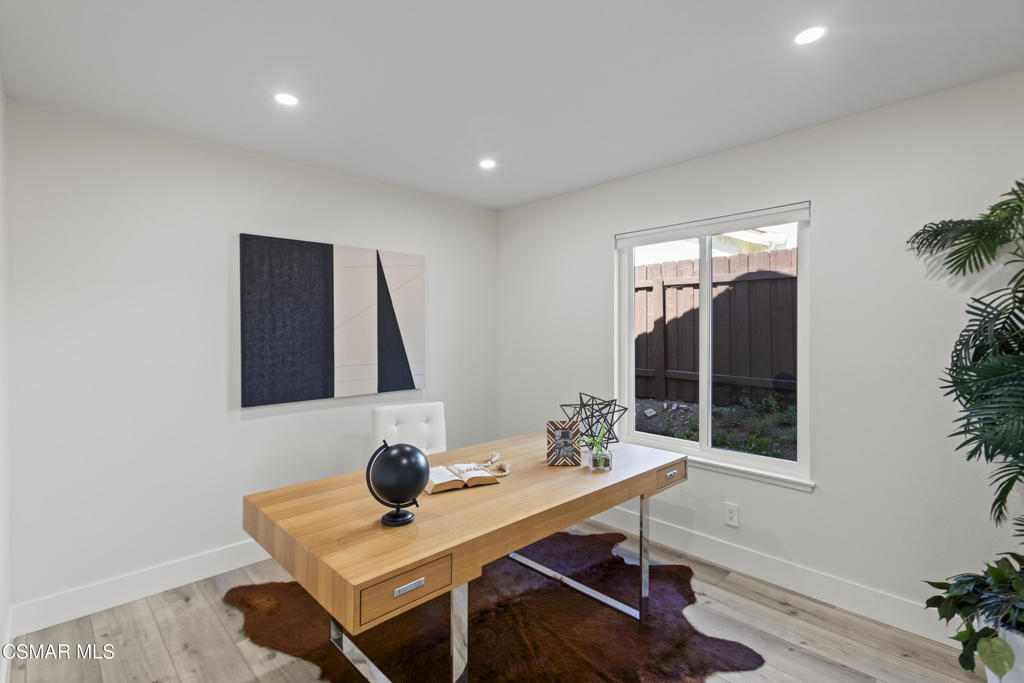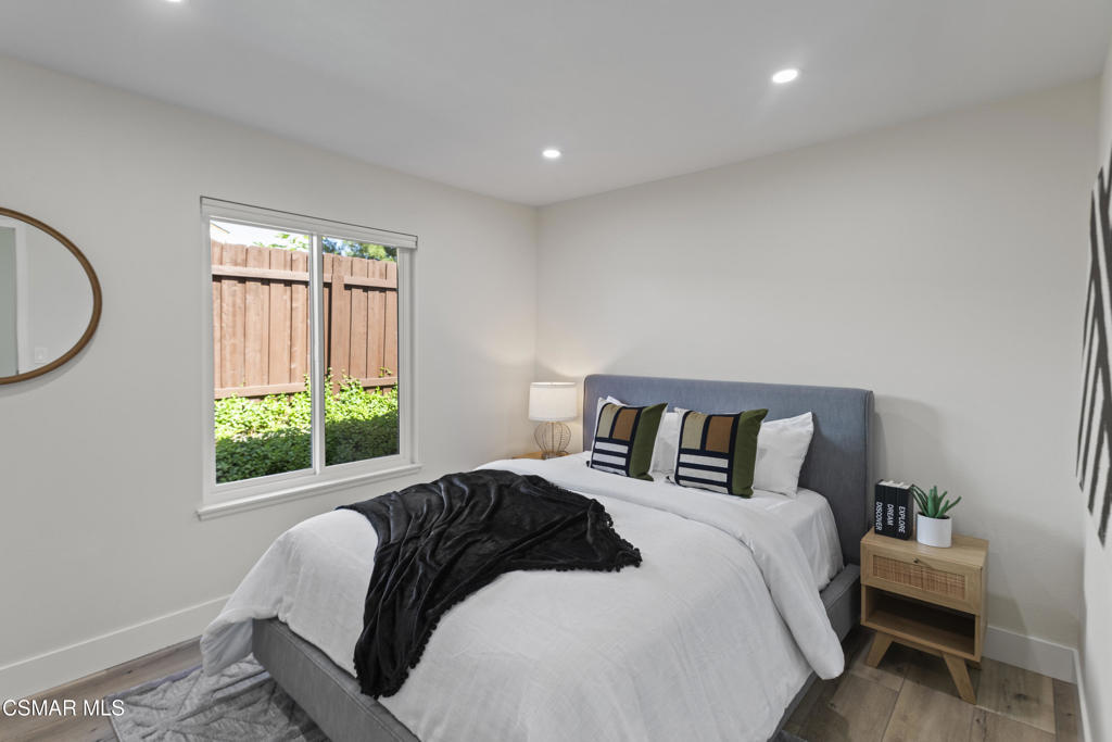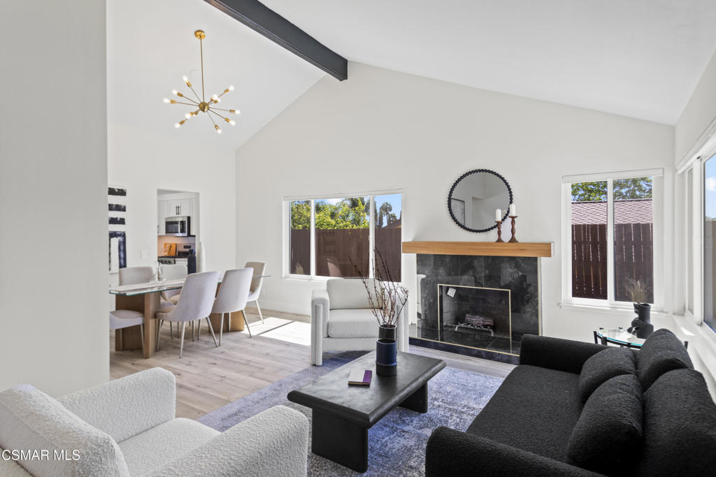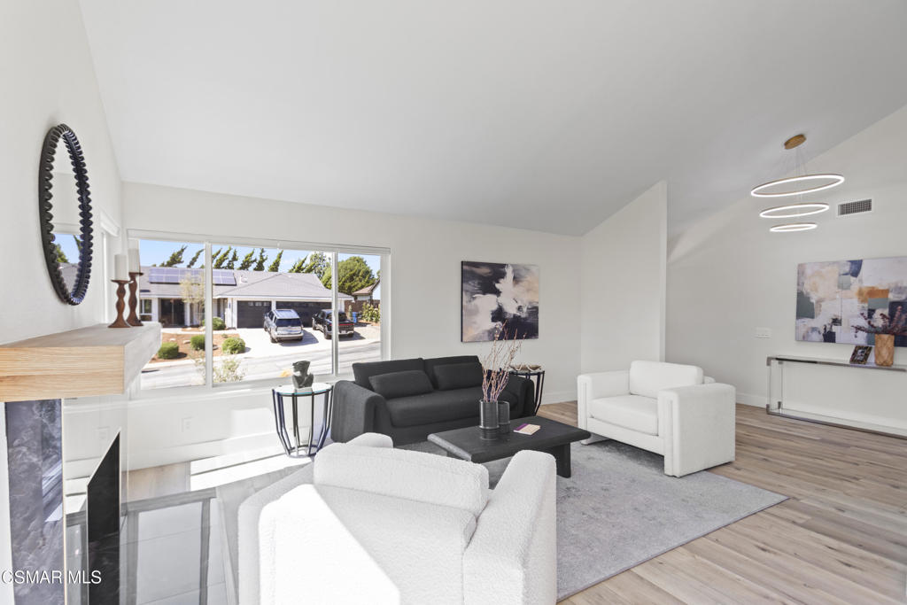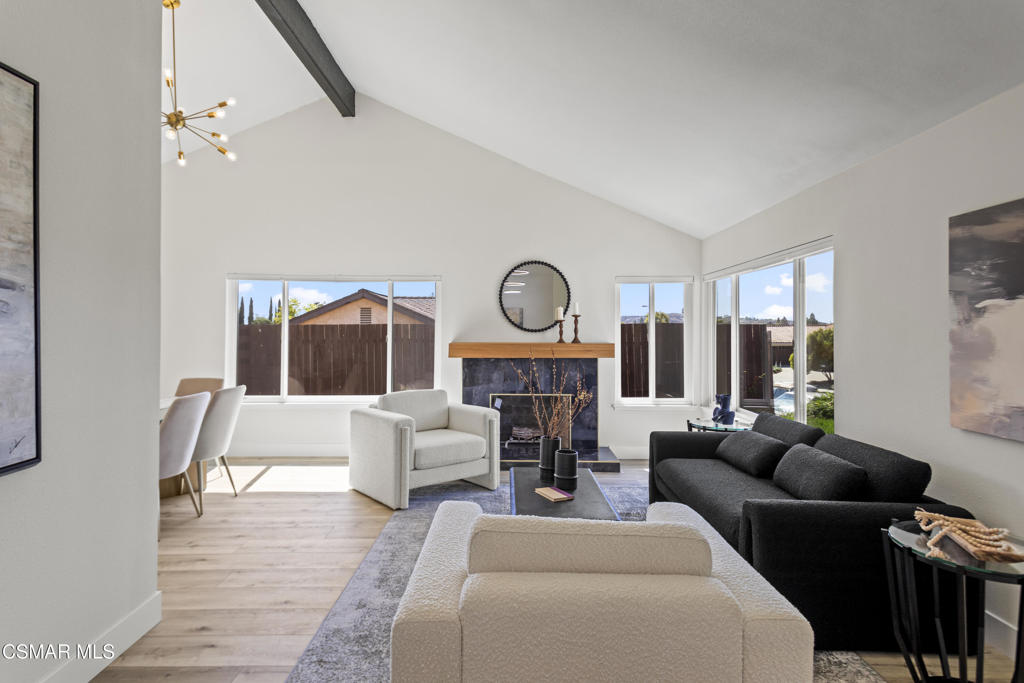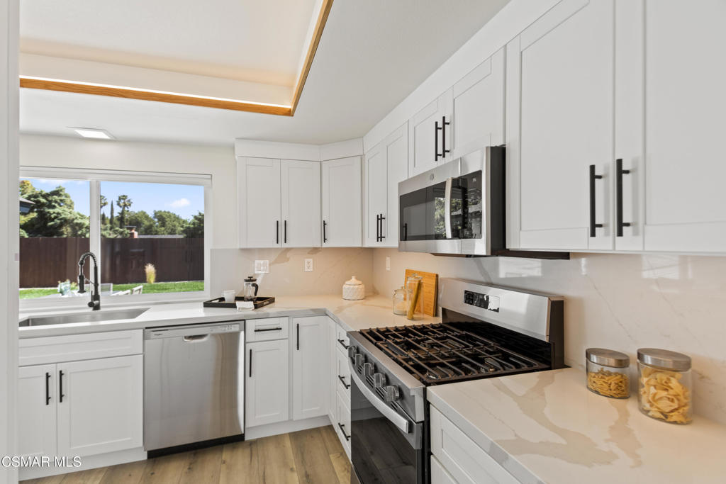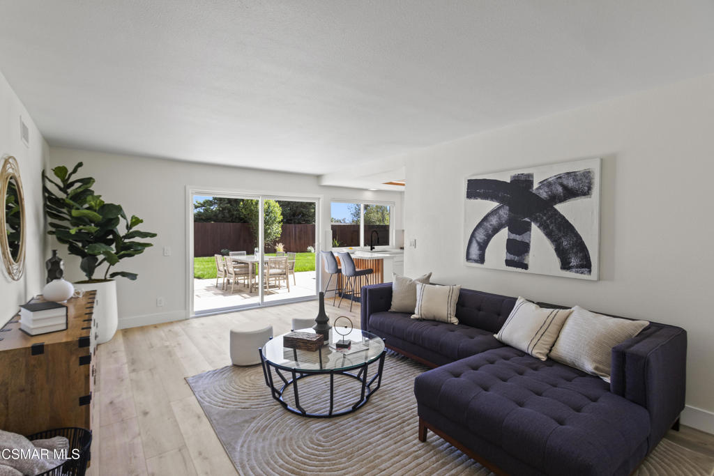 Welcome to this beautifully reimagined single-story home in the heart of Thousand Oaks. Thoughtfully redesigned from top to bottom, this unique gem blends modern style with everyday comfort, offering the feel of a brand-new home. Step inside to the bright living room with vaulted ceilings and a cozy fireplace that flows into the dining area. The family room opens to a modern kitchen featuring a custom wood-detailed peninsula illuminated by accent lighting, quartz countertops, brand-new cabinetry, stainless steel appliances, and serene views of the backyard and distant mountains. Outside, the private, tree-lined yard offers a peaceful escape, perfect for relaxing and enjoying the sound of the breeze through the trees. The spacious primary suite includes sliding glass door to the backyard, generous closets, and ensuite bathroom. All new Milgard dual-pane windows and sliders provide abundant natural light and a seamless indoor-outdoor flow. The garage has been upgraded with epoxy floors, drywall and paint, and new LG front-loading washer and dryer. Additional upgrades include fresh interior and exterior paint, recessed LED lighting, drought-tolerant landscaping with resort-style lighting, a new 200-amp electrical panel, a 40-gallon Bradford White water heater, and a powerful 4-ton Goodman furnace and AC condenser. And so much more! Top-rated CVUSD, close to schools, shopping, and Wildwood hiking. Expertly crafted by One Eleven Designs, this home is a one-of-a-kind treasure just waiting to be discovered!
