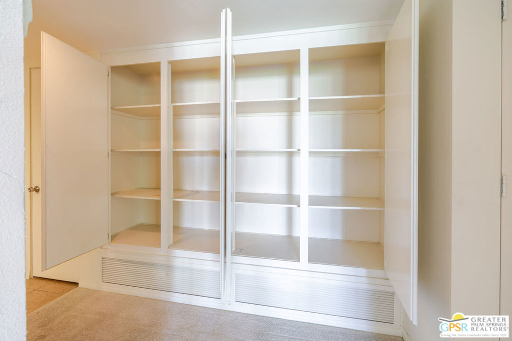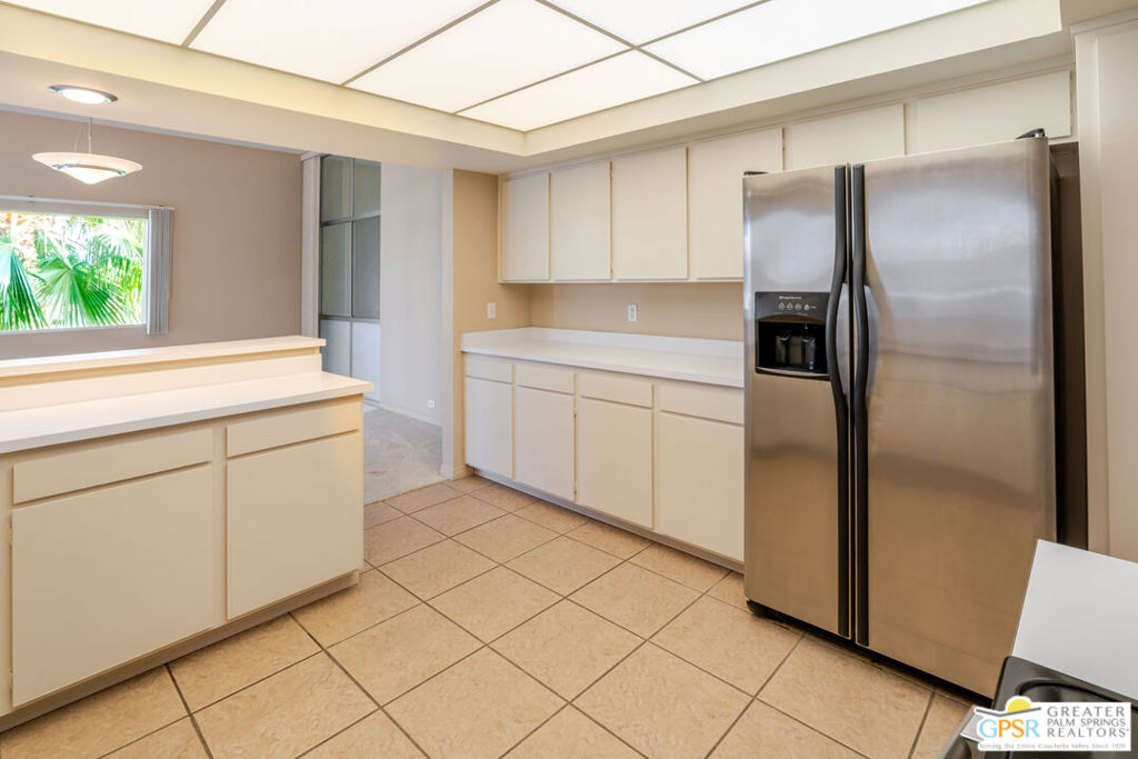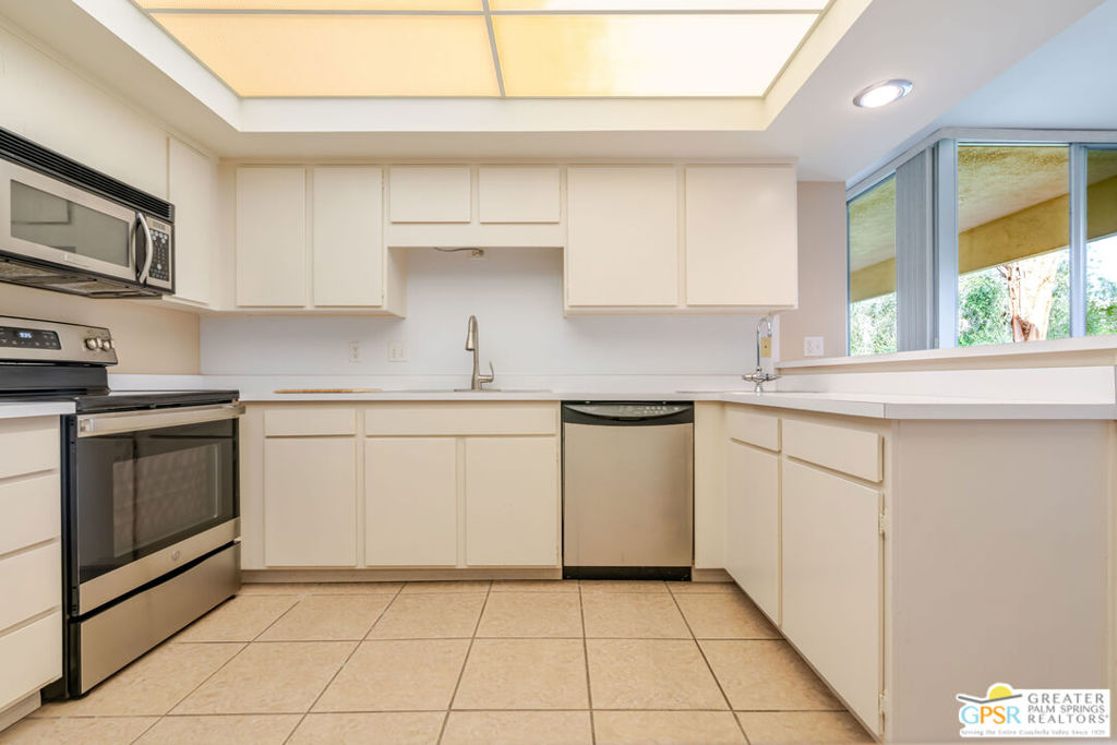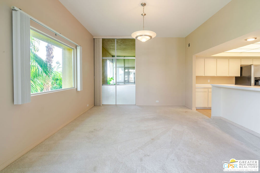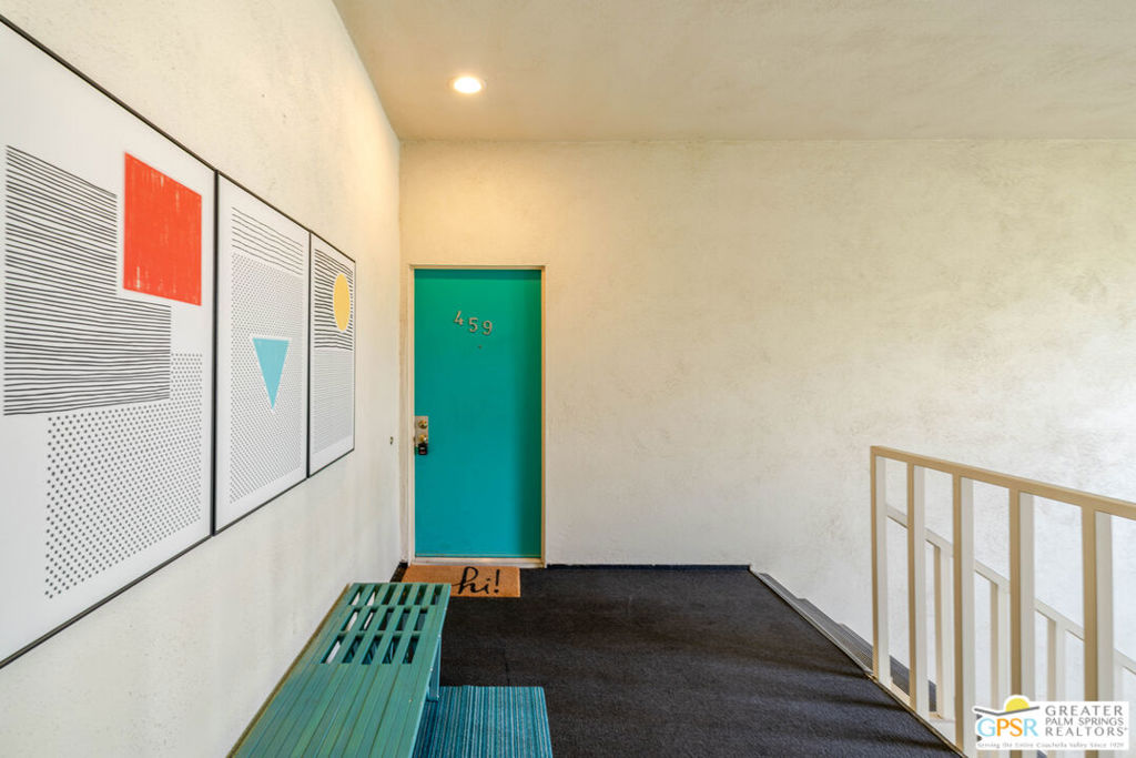 Welcome to 459 Desert Lakes Drive in the iconic Seven Lakes Country Club, where space, light, and classic Palm Springs style come together. This second-floor residence offers 3 bedrooms, 3 bathrooms, and approximately 2,452 square feet of living space, highlighted by a massive private balcony overlooking a lush central greenway and one of the community's sparkling pools - perfect for indoor-outdoor desert living. The home is clean and well maintained, making it move-in ready, while also presenting an exceptional opportunity to reimagine the space into a true mid-century modern dream. The spacious primary suite enjoys its own large balcony facing the greenbelt, while the second bedroom lives like a second primary with a large mirrored reach-in closet, private ensuite bath, and access to the rear enclosed sun-porch. The third bedroom features a walk-in closet with a full bath just off the front hall that also functions as a powder room for guests, along with direct access to the rear sun-porch with windows and a washer/dryer closet for added flexibility and year-round use. A generous dining room sits just off the kitchen, which includes a breakfast bar for casual seating and entertaining. A private two-car garage adds rare convenience. Seven Lakes is a 24-hour guard-gated architecturally significant community featuring an 18-hole golf course, clubhouse with dining, 15 pools (11 with BBQ and ramada areas), 2 tennis courts, 2 EV charging stations, and beautifully landscaped grounds set against dramatic mountain views just minutes from downtown Palm Springs.