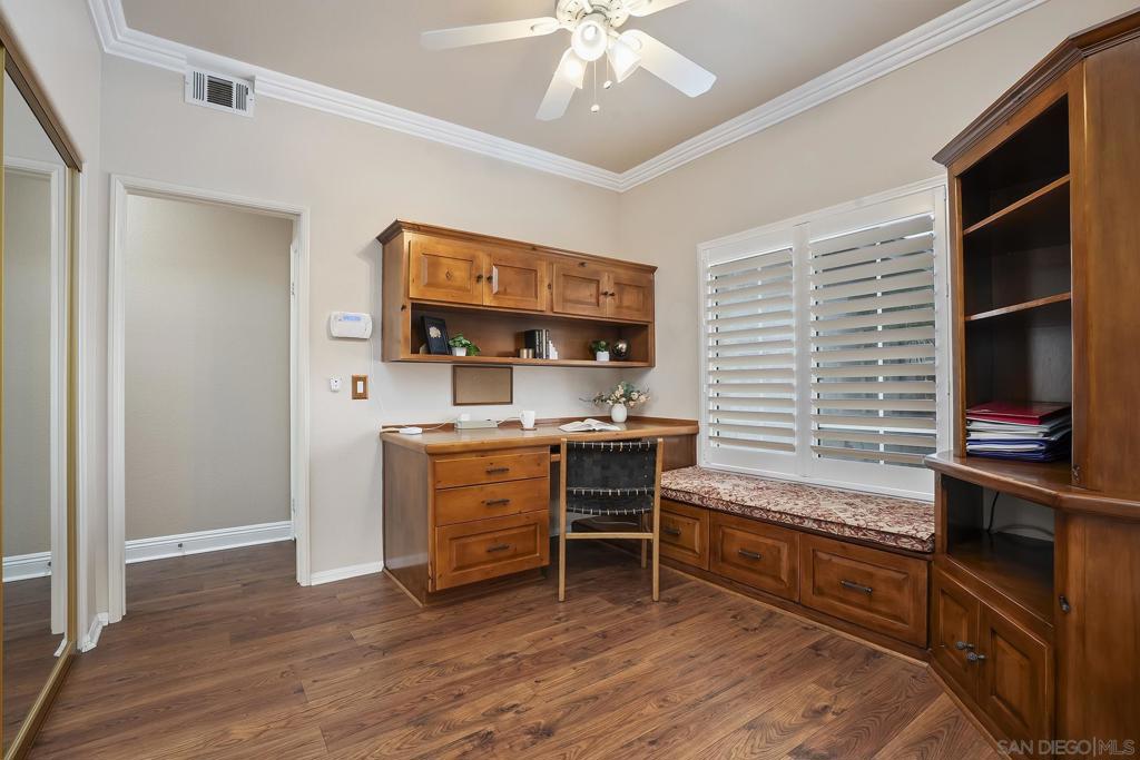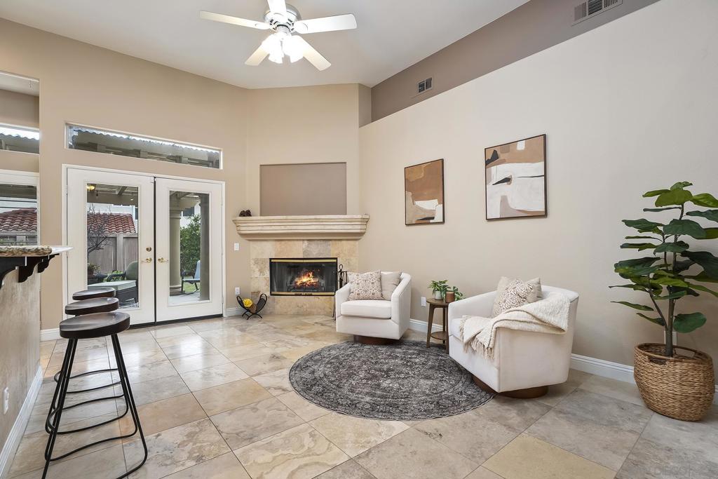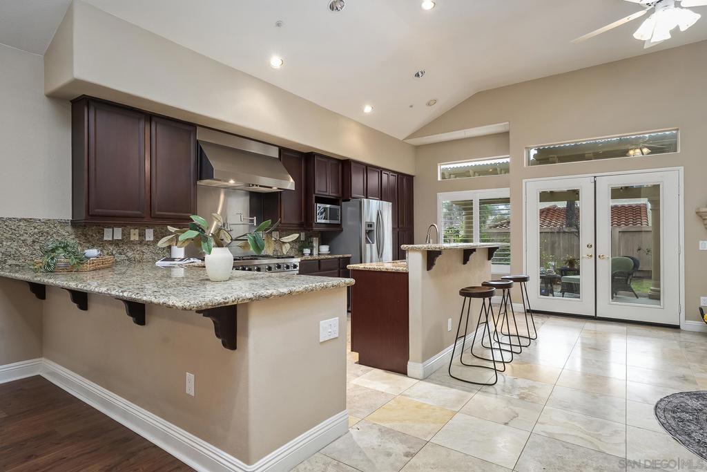 Located in the coveted gated Monarch Ridge community, this single-story corner-lot home offers an open concept layout with a three-car garage. The upgraded kitchen features granite countertops, stainless steel appliances, including a Professional Series Viking gas range with high-performance burners, steel griddle, pot filler, and dual-oven configuration. A cozy fireplace anchors the seating room just off the kitchen, and plantation shutters add a finished look throughout the home. The floor plan includes four bedrooms and two bathrooms. The fourth bedroom is currently configured as a home office with built-in desk and cabinetry. The primary suite includes a spacious bathroom with dual vanity counters, soaking tub, separate shower, walk-in closet, along with French doors leading directly to the backyard patio. Additional features include vaulted 12-foot ceilings, an interior laundry room, ample storage, and a wrap-around backyard with multiple seating areas and dedicated gardening space. Monarch Ridge residents enjoy access to just under 100 acres of open space with walking, hiking, and equestrian trails, as well as community amenities including a pool, spa, cabana, basketball court, pickleball courts, and tennis courts.