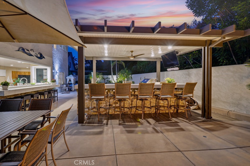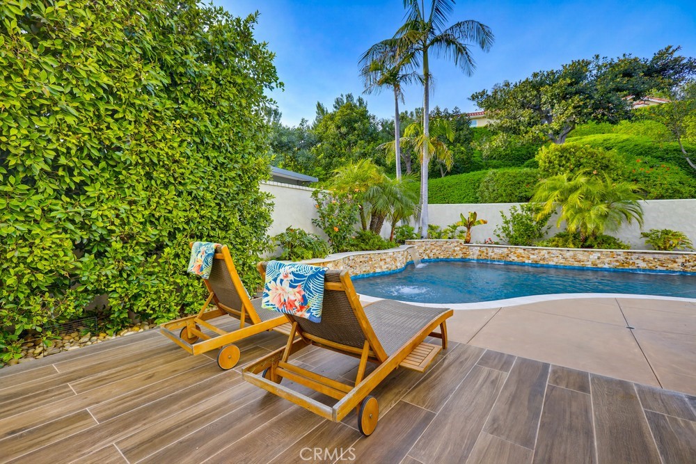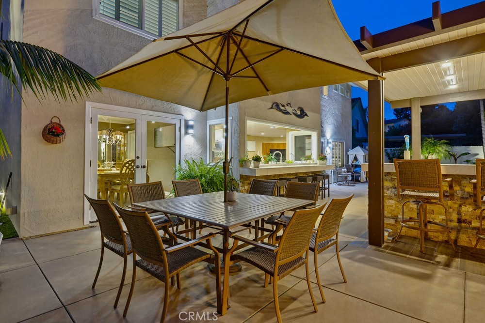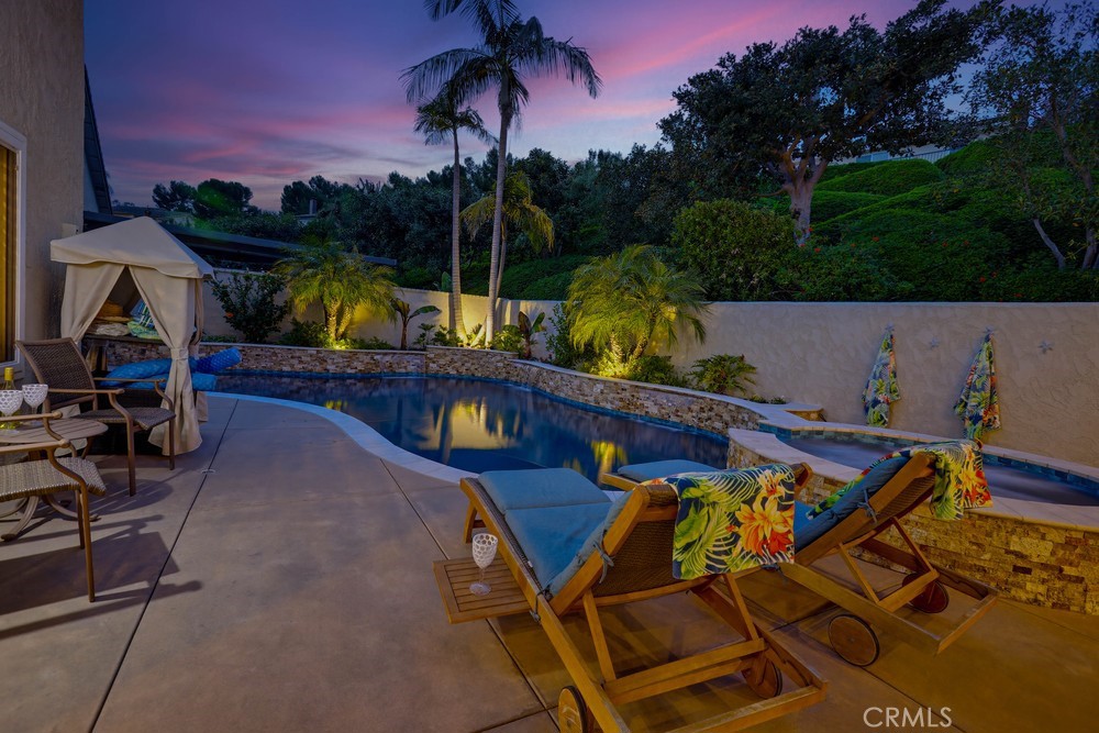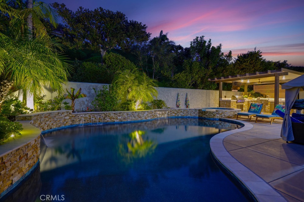 YOUR PRIVATE SANCTUARY AWAITS! Tucked into a tranquil cul-de-sac, this exceptional residence unveils a resort-inspired outdoor oasis unlike anything else on the market. Designed for both grand entertaining and intimate relaxation, the expansive backyard centers around a breathtaking 22,000-gallon custom pool and spa, framed by lush landscaping and serene hillside views. The pool’s deep-blue PebbleTec finish, infinity-edge Jacuzzi, sheer-descent waterfalls, and oversized Baja shelf with bubbler and umbrella sleeve create a true luxury retreat. A fully appointed outdoor kitchen—featuring a 3-burner Delta grill with a sear zone and rotisserie, an additional gas burner, a refrigerator, a kegerator, and elegant travertine counters—sits beneath a sophisticated Alumawood patio cover. A gas firepit, outdoor shower, and private putting green complete this extraordinary space. Inside, the home continues to impress with a gourmet kitchen showcasing quartz countertops, custom European cabinetry, and premium stainless-steel appliances. The spacious primary suite overlooks the pool and rolling hills, while the fully reimagined primary bath offers custom cabinetry, an exquisite flagstone shower with three shower heads, radiant onyx counters, and matching flagstone flooring. The secondary upstairs bath features granite counters, a quartz shower, and radiant floor heating. Four generous secondary bedrooms, including one conveniently located downstairs, provide comfort and versatility, with the guest room enhanced by a built-in Murphy bed. Additional upgrades include new LVP flooring downstairs, newer carpet upstairs, vinyl windows, custom interior doors, and French doors opening from the dining room to the outdoor dining area. Residents enjoy access to exceptional community amenities, including scenic walking trails, a premier tennis center, and coveted Lake Mission Viejo membership. This is a rare offering—an extraordinary home that blends luxury, comfort, and resort-style living in perfect harmony.