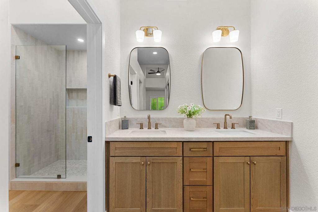 Dwell West proudly presents this exceptional Ocean Hills residence. Welcome to elevated resort-style living in one of North County’s most vibrant and socially active 55+ communities. Thoughtfully redesigned with professional designer guidance, this fully renovated home blends timeless finishes with high-impact upgrades that truly matter. Enjoy peace of mind with a FULL PEX REPIPE with lifetime warranty and a brand-new 4-ton furnace for year-round comfort. The interior showcases fresh paint, luxury vinyl plank flooring throughout, updated doors and hardware, mirrored closet doors, and all-new lighting including recessed lights, modern fixtures, and ceiling fans. The designer kitchen features white oak shaker cabinetry, quartz countertops, a custom tile backsplash, and brand-new stainless steel appliances—ideal for both entertaining and everyday living. The spacious primary suite offers a spa-inspired retreat with a dual white oak shaker vanity, quartz counters, upgraded fixtures, private water closet, and beautifully tiled walk-in shower. The secondary bath includes convenient Jack-and-Jill access. Located within the highly sought-after Ocean Hills Country Club, a premier 55+ community set across 350 acres, residents enjoy an 18-hole executive golf course, Jr. Olympic solar-heated saltwater pool, tennis, pickleball, bocce, paddle tennis, shuffleboard, croquet, a dog park, and a scenic 2¼-mile walking path. The clubhouse features a full fitness center, locker rooms, billiards, computer lounge, and numerous hobby and social clubs—making every day feel like a getaway.