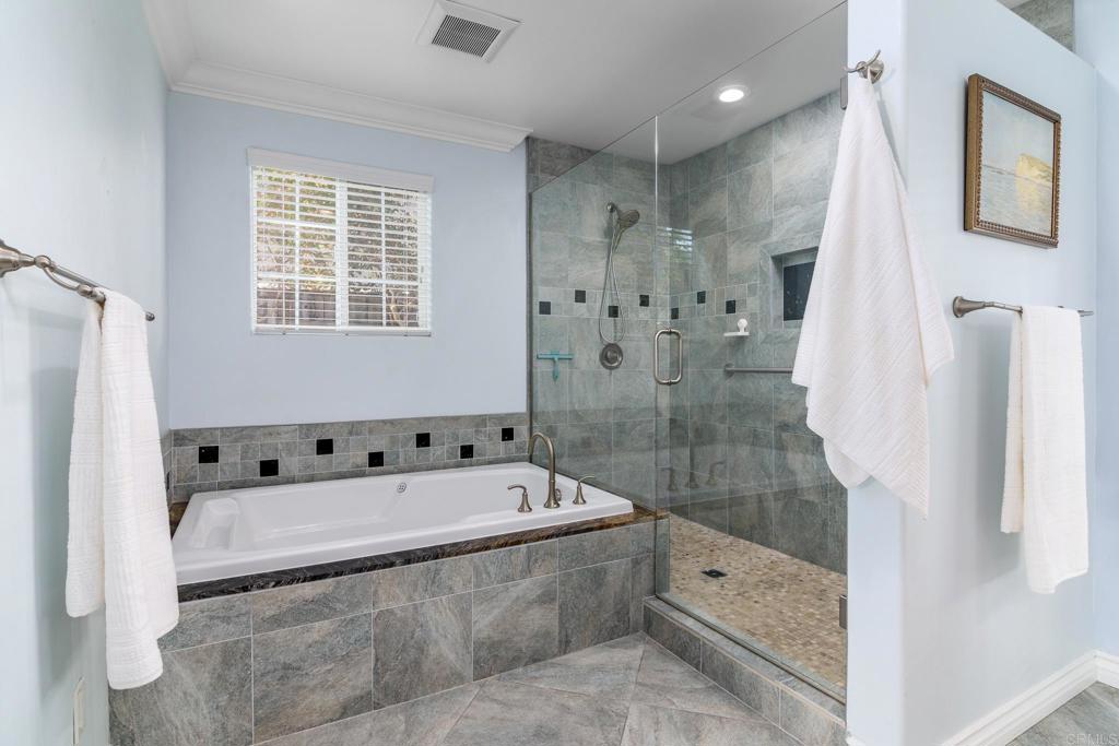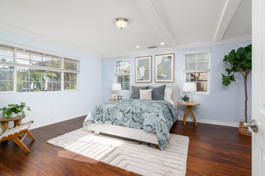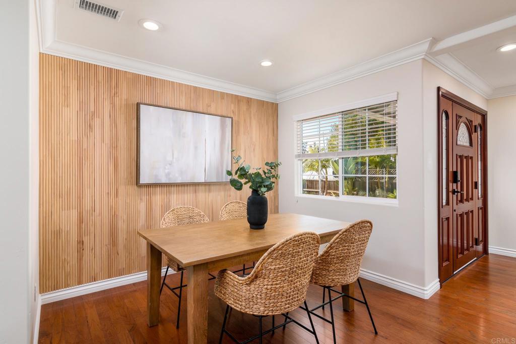 Welcome to this beautifully remodeled and thoughtfully designed 4-bedroom, 4.5-bath residence offering an exceptional blend of comfort, flexibility, and seamless indoor-outdoor living in one of Oceanside’s most desirable neighborhoods. A charming picket fence and cheerful turquoise front door create unforgettable curb appeal, setting the tone for the character and warmth found throughout. Inside, warm hardwood floors, recessed lighting, and clean architectural lines create a bright yet inviting atmosphere. The updated kitchen is both stylish and functional, featuring quartz countertops, blonde cabinetry, stainless steel appliances (including a refrigerator, microwave, oven, range, and wine fridge), a walk-in pantry, and a built-in desk area. The space flows effortlessly into the dining area, highlighted by a striking wooden accent wall that adds warmth and texture. Designed for flexibility, the home offers four bedrooms, including two primary suites, and four-and-a-half bathrooms. The downstairs primary suite features a spacious walk-in closet and a luxurious ensuite bath with dual vanities, an oversized standalone shower, and a built-in soaking tub. Upstairs, the second primary suite also includes a walk-in closet and a recently updated ensuite bathroom with dual vanities and an oversized shower with a built-in bench. Each additional bedroom is generously sized with its own bathroom, while a convenient powder room serves guests. The private backyard is beautifully landscaped and designed for both relaxation and entertaining, with a covered patio, multiple seating areas, and mature greenery creating a peaceful, resort-like setting. Solar panels add energy efficiency and long-term savings. Ideally located near beaches, shopping, dining, and everyday conveniences, this move-in-ready home offers comfort, character, and thoughtful upgrades throughout.