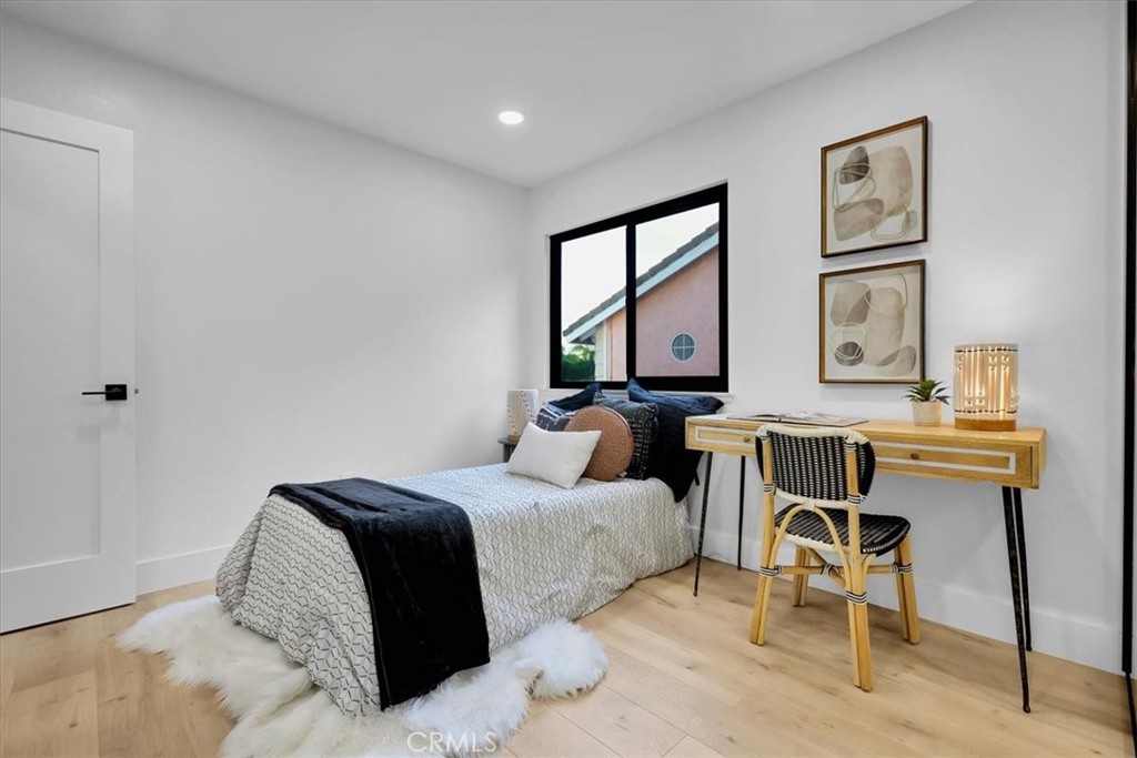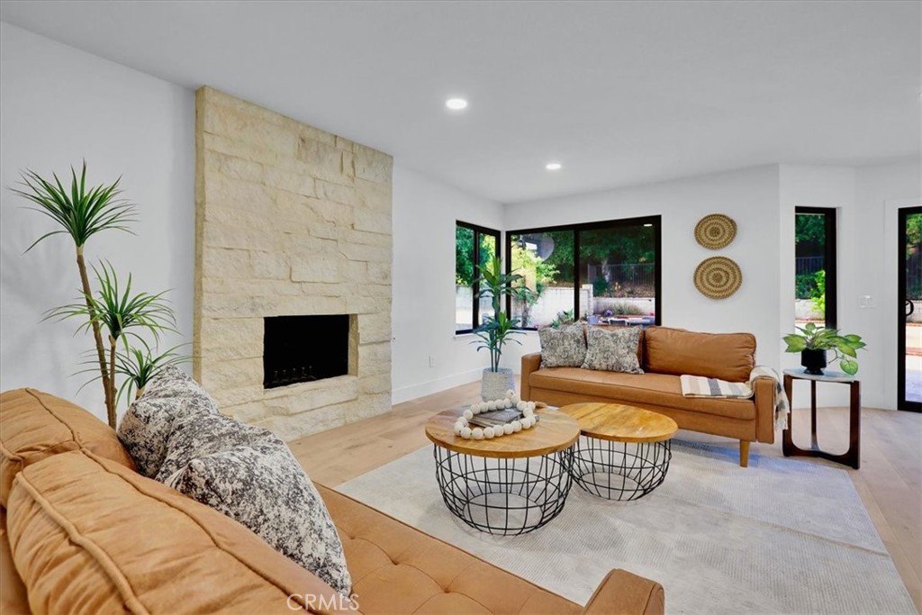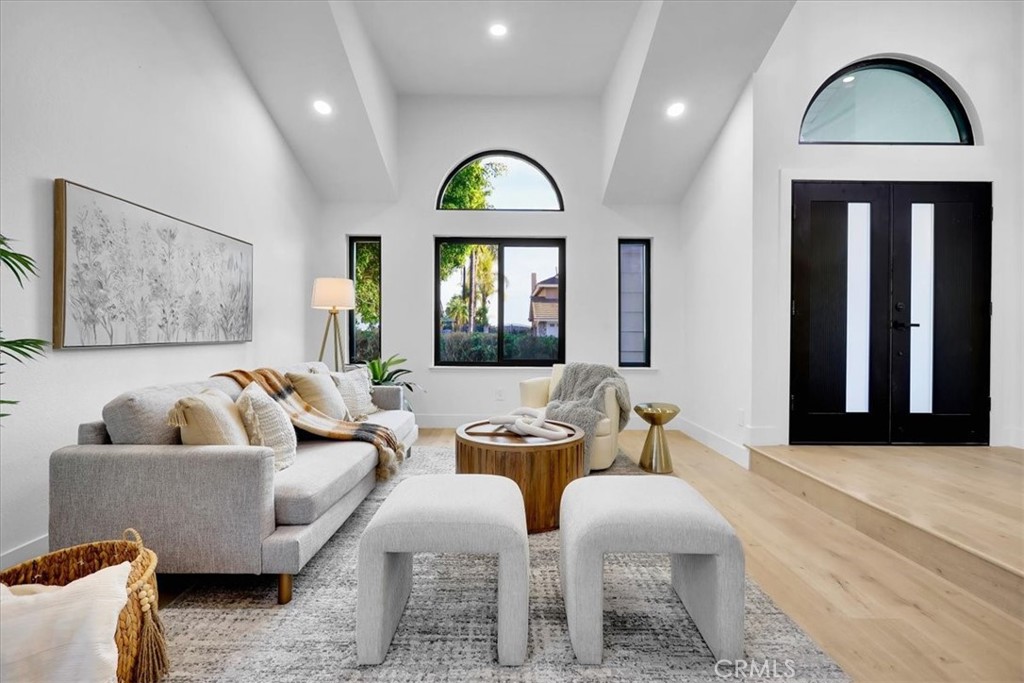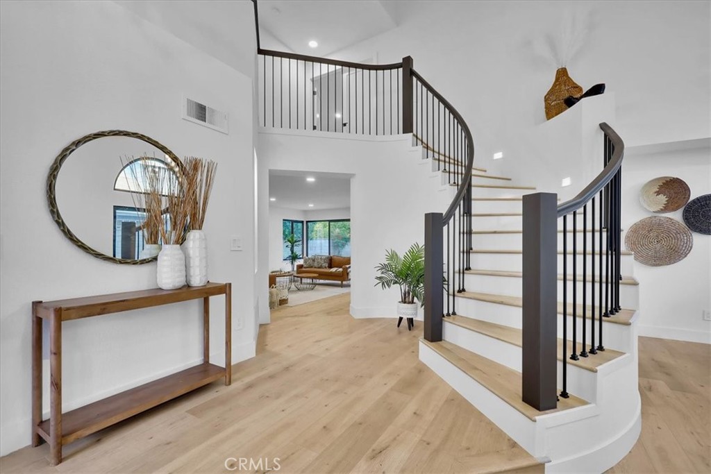 Situated on a spacious lot within a quiet cul-de-sac, this thoughtfully updated residence blends elevated curb appeal with cohesive design. Slightly set above street level, the home makes a strong first impression with a brick-accented driveway and walkway that complement the Spanish tile roof and freshly painted white exterior with contrasting black trim. Manicured landscaping, turf areas, and two usable side yards frame the property, while a prepaid solar lease through 2030 adds long-term efficiency. Double entry doors open to soaring ceilings and a spiral staircase that immediately establish scale. Light wood flooring and recessed lighting unify the main living spaces, where a formal living and dining area sit just off the entry, anchored by a statement chandelier and an open, connected layout. The fully remodeled kitchen flows naturally into a breakfast nook and a secondary living room featuring a fireplace and wet bar. New windows throughout invite abundant natural light, and sliding doors extend the living space outdoors. A half bathroom with a smart toilet and a dedicated laundry room with direct garage access complete the main level. Upstairs, the expansive primary suite offers a true retreat with dual closets and a generously sized en-suite bathroom featuring dual vanities and an oversized walk-in shower with an integrated soaking tub. Three additional well-proportioned bedrooms share a fully updated bathroom. Nearly every interior element has been modernized, from bathrooms and fixtures to windows and smart features, reinforcing the home’s cohesive renovation. An attic space accessed via pull-down ladder provides an additional bonus area for flexible use. Outdoors, the backyard continues the home’s balance of function and lifestyle, centered around a pool and spa. Two side yards add further versatility, while the epoxy-finished garage completes the property’s polished presentation. Designed with both scale and livability in mind, this residence delivers a fully updated interior, purposeful layout, and seamless indoor-outdoor flow in the well-established Walnut neighborhood.