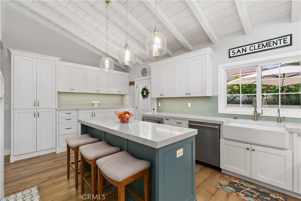 Beautiful Completely Remodeled Southwest San Clemente Home! An amazing custom home, just a short walk to the steps that lead down to "Lost Winds" beach and Leslie Park overlook. Remodeled with the finest of finishes! Open floor plan upstairs with 3 bedrooms, 2 baths and a downstairs bonus room. Very spacious floor plan with nice natural lighting throughout the home and two fireplaces, one of which is double-sided. Recent luxurious upgrades include but are not limited to: Natural wood beamed, high vaulted ceilings throughout the main floor. White maple natural wood cabinets. The gourmet chef's kitchen is equipped with nearly new Viking Professional Grade stainless steel built-in refrigerator, four burner range, dishwasher, microwave and food warmer. Newport Brass and Shaws sink, plus water filtration system. Marble countertops, an oversized center island, and lighting create an ambiance that will attract all to the kitchen. The bathrooms have recently been upgraded throughout. Main floor bedrooms have lovely beamed, vaulted ceilings. One downstairs bedroom with a separate entrance could be a teen or mother-in-law suite, or even an ADU with some minor modifications. Partial canyon view out of the custom bay windows with a peekaboo of the ocean. Additional features include luxury wood look plank flooring and French doors that lead out to a nice front deck. Additional upgrades include new exterior paint, lighting, plumbing (including a tankless water heater), electrical, gas lines, roof and central air conditioning. Outdoor spaces include 2 outdoor showers, a nice backyard with beautiful landscaping as well as a grassy front yard with a built-in fire pit. This prime location is close to beaches as well as downtown restaurants and shopping. Your coastal home awaits.