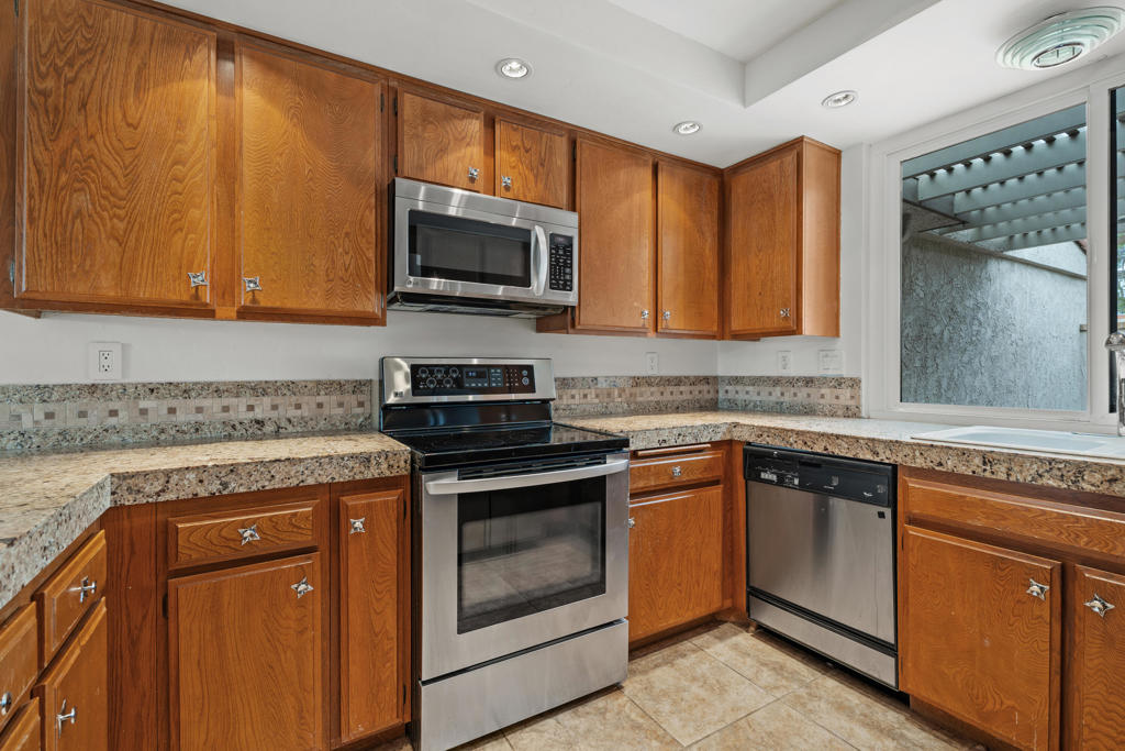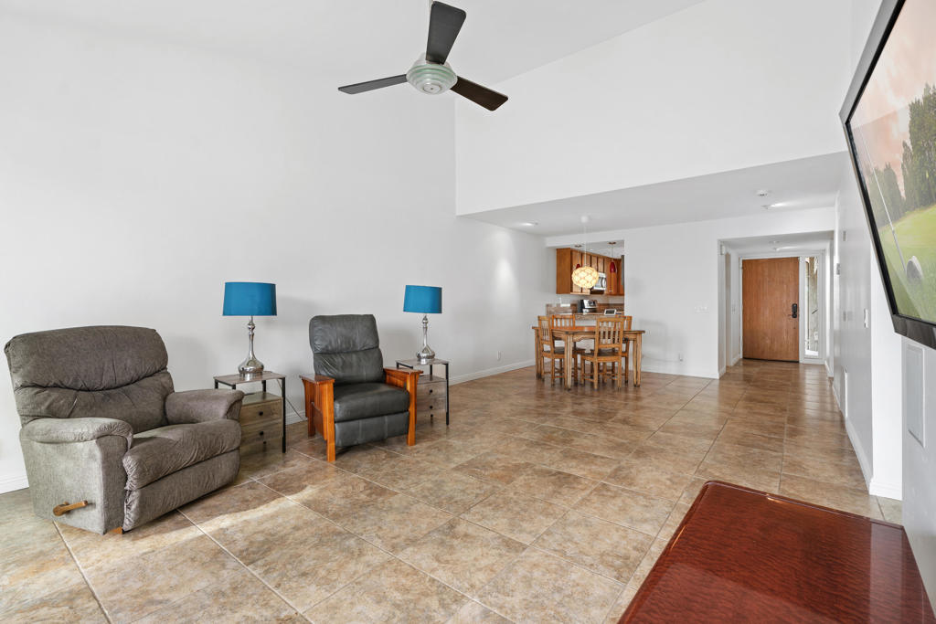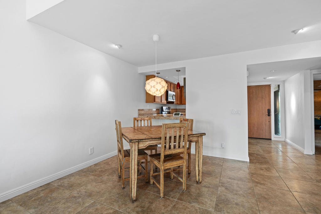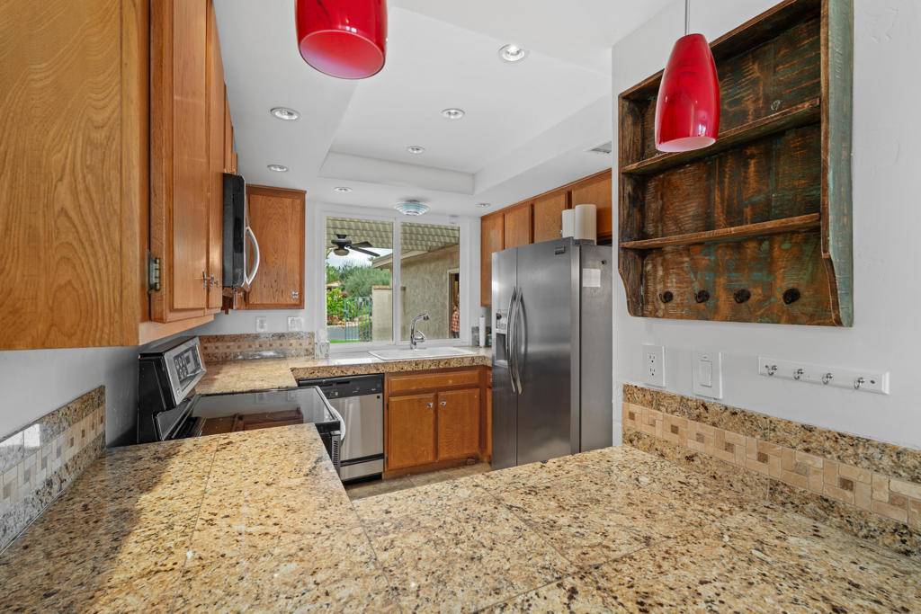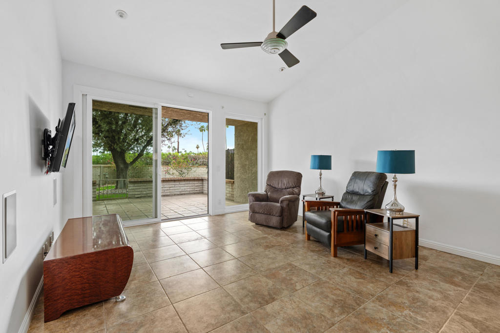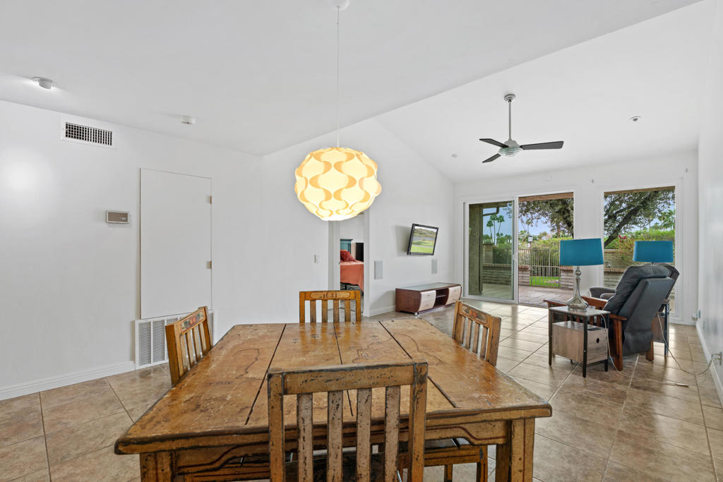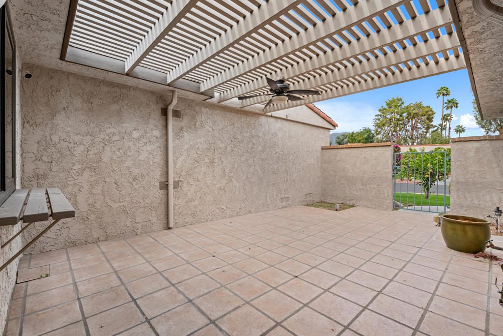 Location! Location! Located in the desirable Sunrise Racquet Club. Step inside this 2 bed, 2 bath condo to see fresh new paint, tile floors, granite countertops, stainless appliances, built-in microwave and custom pendant lighting in the kitchen. Smart split floorplan for privacy; guest bedroom boasts custom bamboo wallpaper. Mirrored wardrobes in both bedrooms, ceiling fans, newer sliding windows, newer a/c, upgraded bathrooms with custom wood vanities. Private patio is just steps from the pool with lovely mountain views. Sunrise Racquet Club amenities include 6 pools/spas, tennis, pickleball, racquetball courts and a clubhouse. Enjoy 43 acres of lush grounds with ponds, lakes and walking trails. Whether you are looking for a vacation getaway or for a fulltime residence, this is perfect desert retreat. Sunrise Racquet Club allows 14-day minimum rentals.