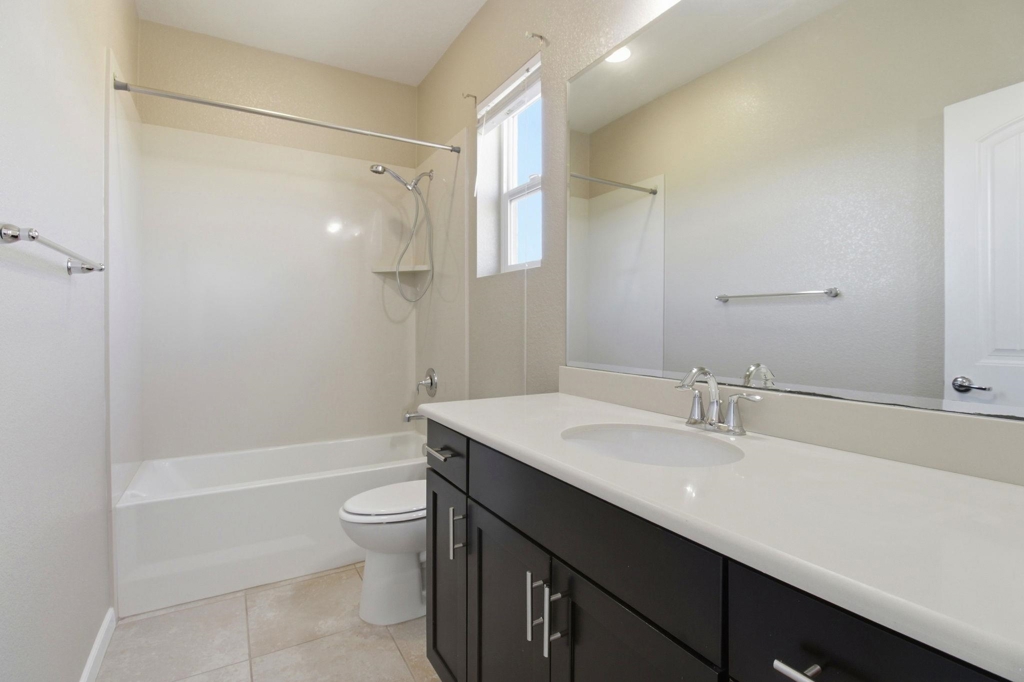 Beautiful two-story, 3 Bed, 2.5 Bath home AVAILABLE in Mountain House! This home has a large backyard, House is painted 2-tone interior, laminate flooring, slab granite counters, island, stainless appliances, gas cooktop, stainless refrigerator, pantry. Cozy living room gas fireplace, upstairs laundry washer & dryer. Backyard has colored stamped concrete patio, arbor with wisteria, pergola, rosebushes, orange and lemon trees! Forced air heating and central cooling system. 2- car attached garage.