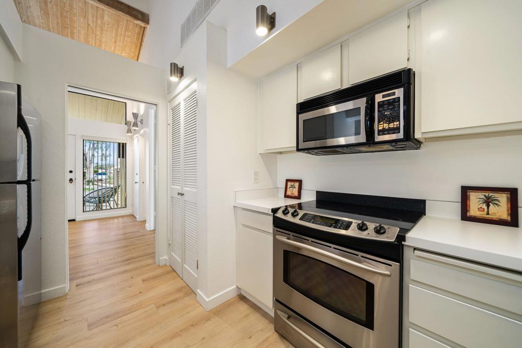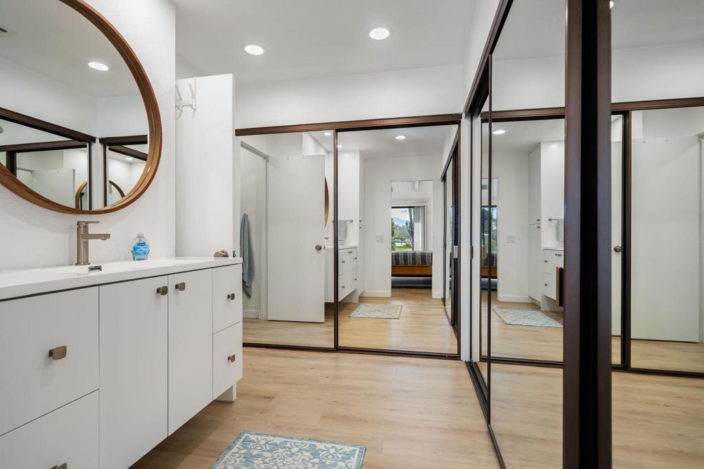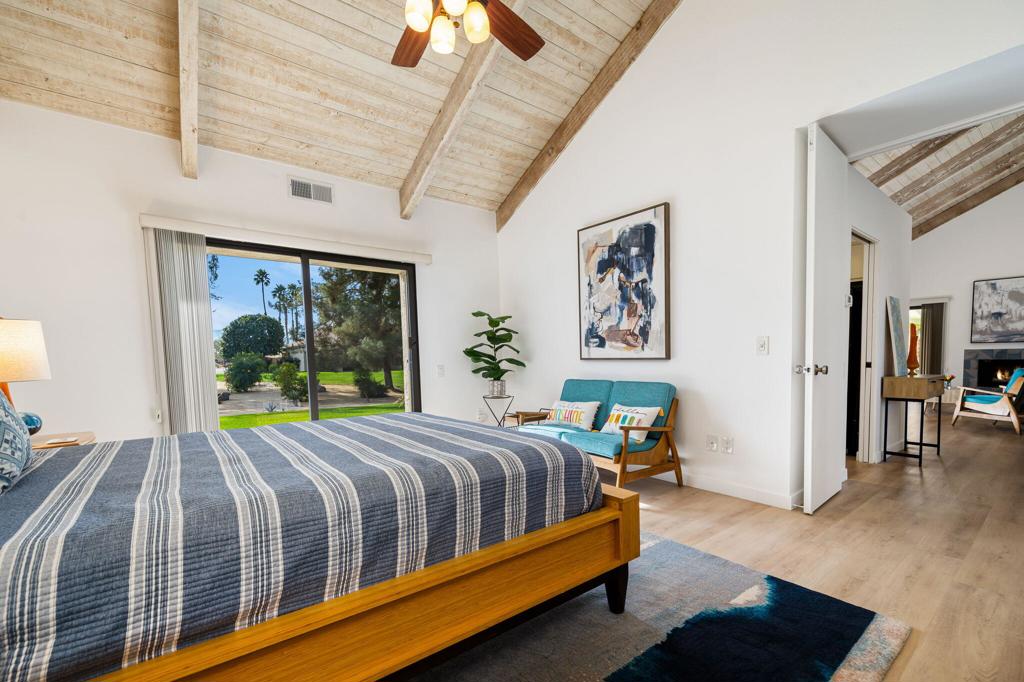 Discover this beautifully maintained one-bedroom condo set along a tranquil lake with stunning views of the San Jacinto Mountains, located within the highly sought-after guard-gated Mission Hills Country Club. The home features luxury vinyl plank flooring throughout with a sun-filled interior highlighted by vaulted wood-beam ceilings. The inviting living space includes a fireplace and opens to two private patios, offering seamless indoor-outdoor living with scenic lake and mountain backdrops. The bedroom retreat also enjoys its own patio overlooking the greenbelt and water feature. Perfect for both relaxing and hosting guests, residents can enjoy five solar-heated pools and spas. Mission Hills Country Club offers exceptional amenities including three private golf courses, 27 tennis courts, croquet courts, a premier fitness center, and optional golf, tennis, and social memberships.