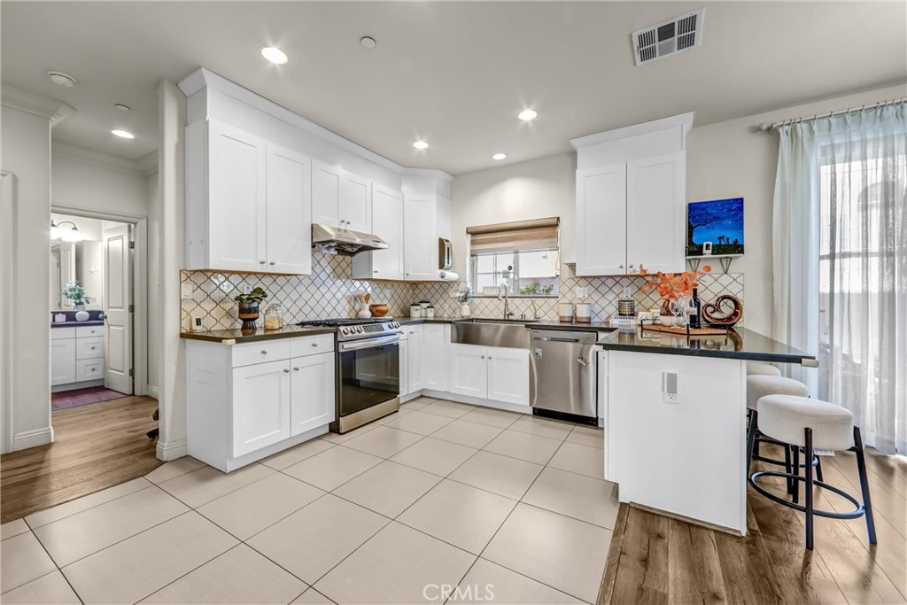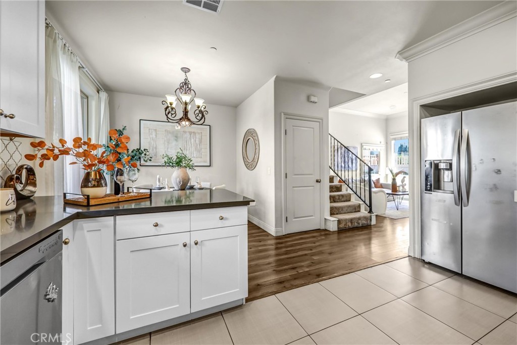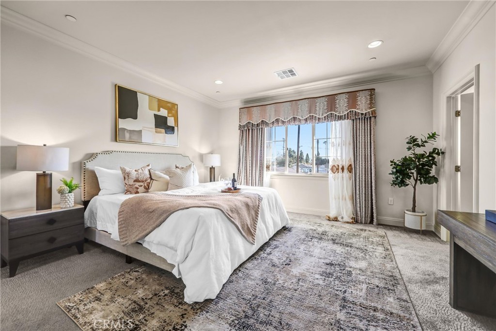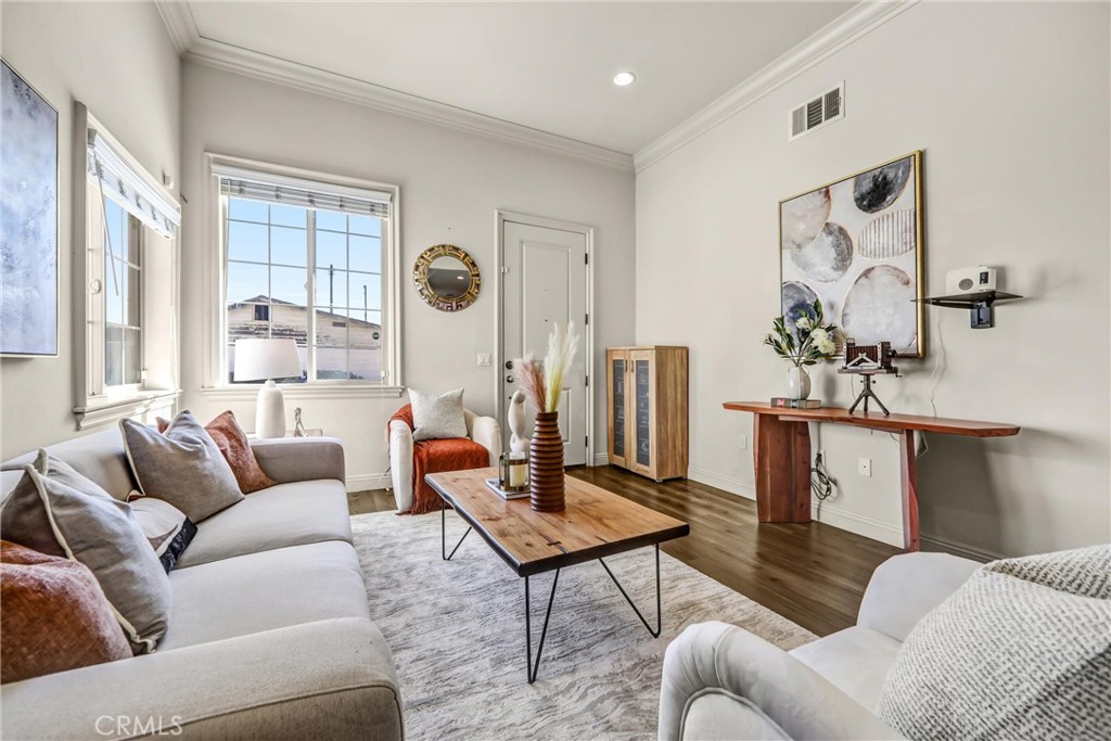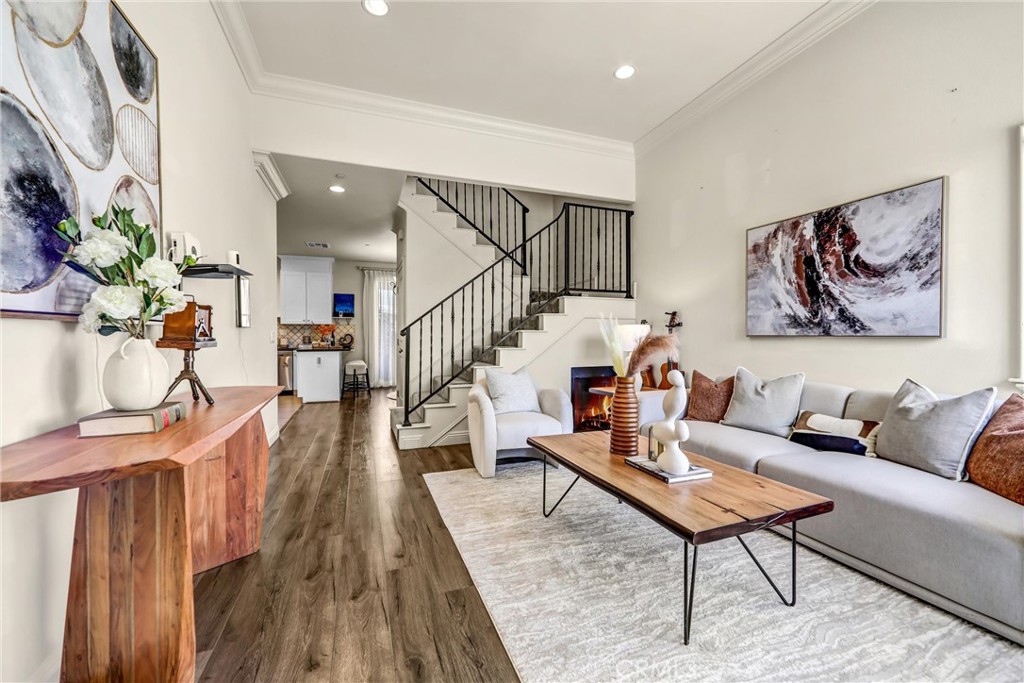 First time offered to the public! Built in 2015 by Sun Homeland, this south-facing single-family detached PUD is located in a gated community and offers a prime location close to restaurants, shopping, and convenient freeway access. This spacious 4 bedroom / 3 bathroom home is filled with natural light and refreshing breezes. The home features a fireplace in the living room, formal dining area, downstairs guest bedroom, upstairs family room, and a luxury oversized primary suite large enough for a king-size bed. The primary bathroom is beautifully appointed with a 6-jet spa tub, frameless shower, dual vanities, and a separate toilet room. The designer kitchen is a must-see—fully equipped with stove, oven, dishwasher, garbage disposal, custom cabinetry with soft-close drawers, quartz and imported tile countertops, and a matching glass tile backsplash. Additional upgrades include wide-plank rich wood flooring, recessed lighting, crown molding, and a decorative hand railing that enhances the home’s elegant interior. Enjoy excellent privacy with a 20-foot-wide driveway, plus assigned guest parking for each unit, creating extra space and distance from neighboring properties. The home also offers a private fenced yard, perfect for relaxing or entertaining.