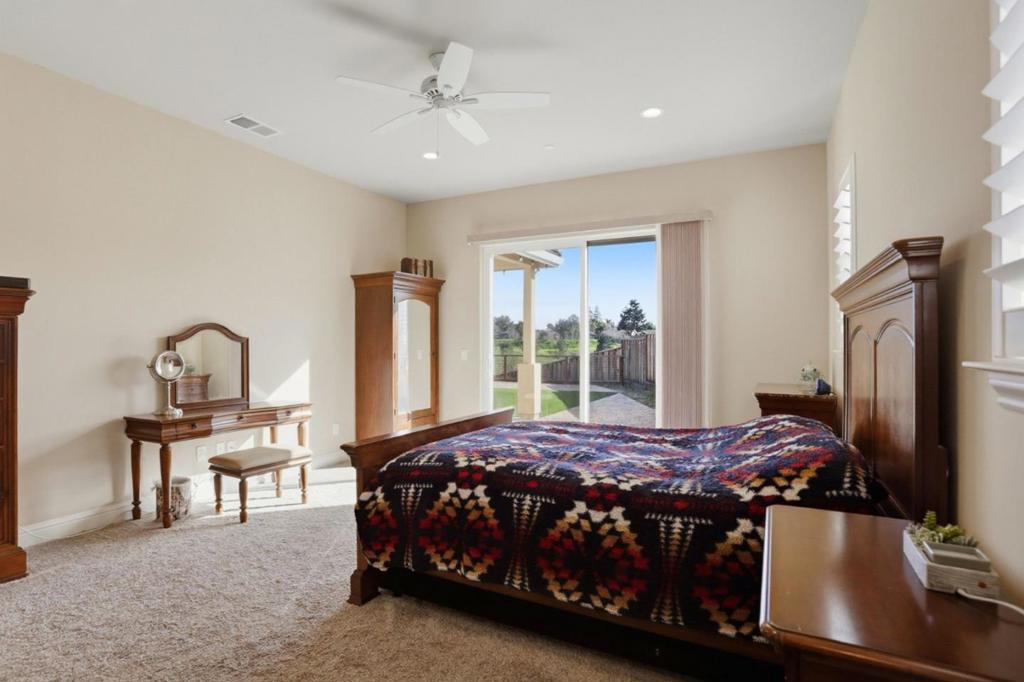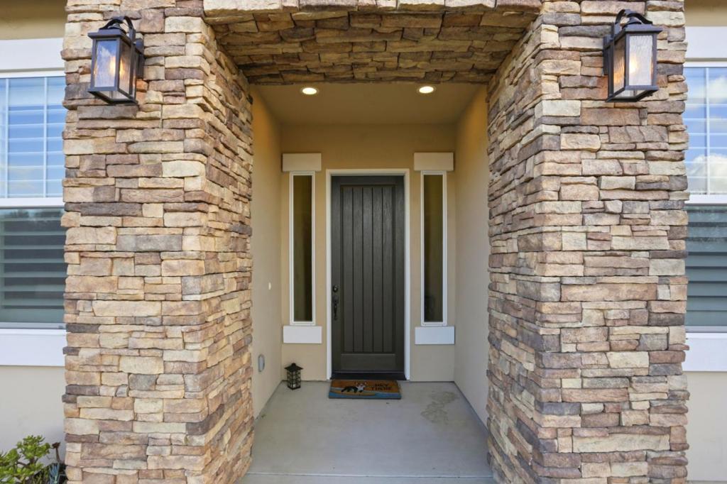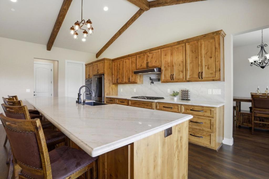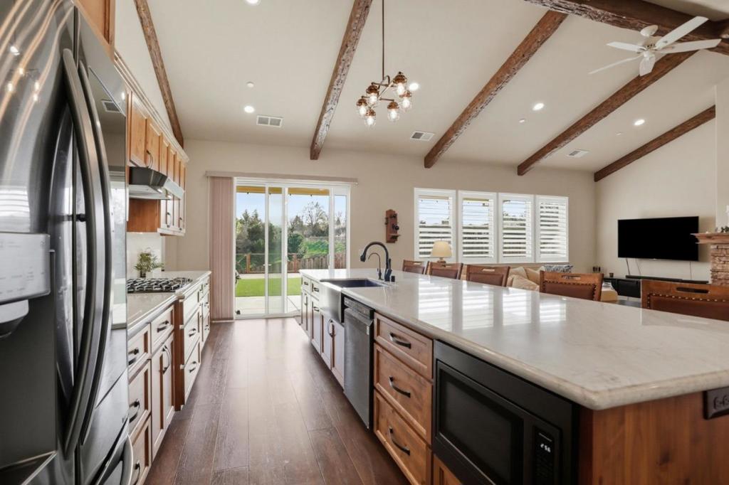 Beautiful 2,536 sq. ft. 4 bed, 3 bath home on a 10,032 sq. ft. lot backing to a peaceful drainage pond with no rear neighbors, offering privacy and open views. Wood laminate flooring throughout the main living areas. The gourmet kitchen features quartz countertops and backsplash, pot filler, 5-burner gas cooktop, dual ovens, stainless steel appliances, and an oversized island with farmhouse sink ideal for entertaining and an open floor plan lifestyle. Abundant cabinetry with under-cabinet d upper accent lighting. Formal dining room with custom-built-ins and glass display cabinets. Living room features vaulted open-beam ceilings and a stone gas fireplace. Estate shutters throughout. Spacious primary suite with backyard access and a luxurious bathroom including a stone walk-in shower with three shower heads. Low-maintenance backyard with artificial turf and pavers, perfect for outdoor living. Smart home includes fire sprinklers, reverse osmosis and whole-house water filtration. Finished 3 car garage with ample storage and room for golf cart parking.