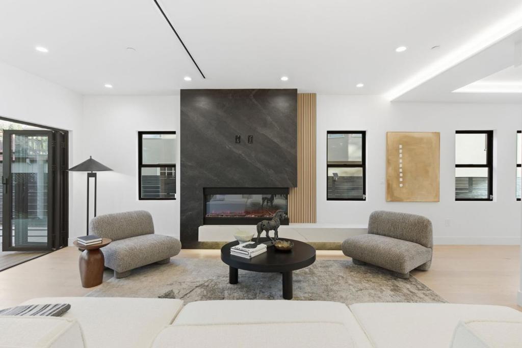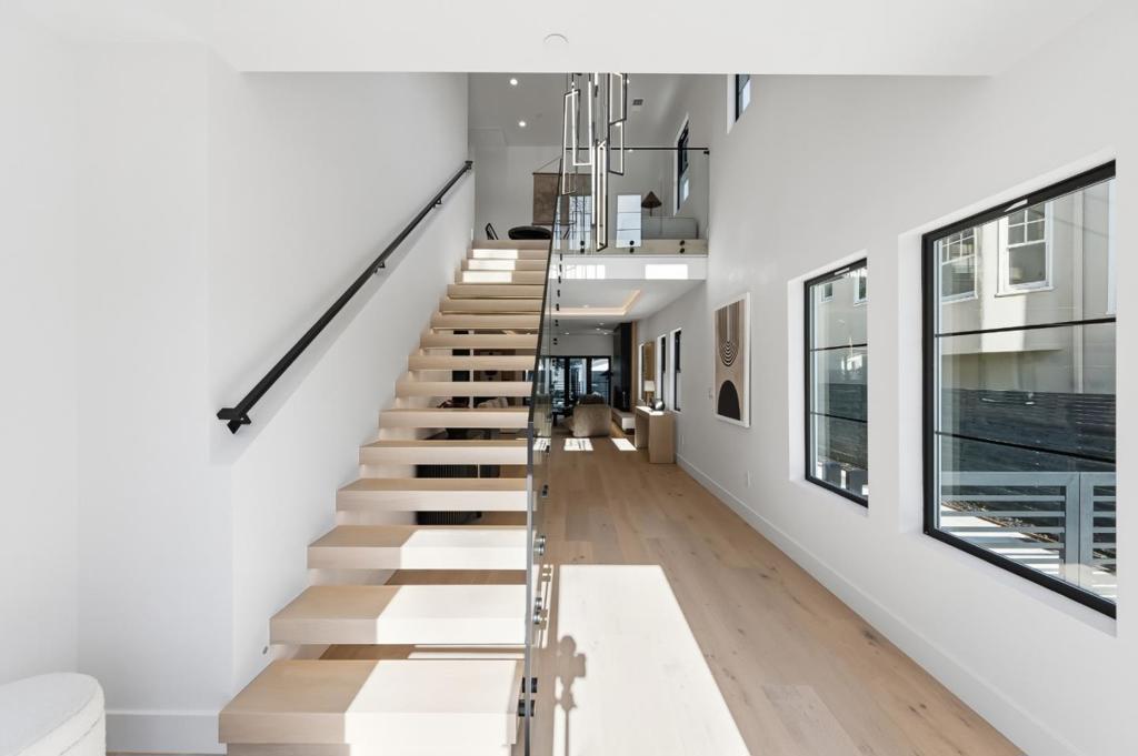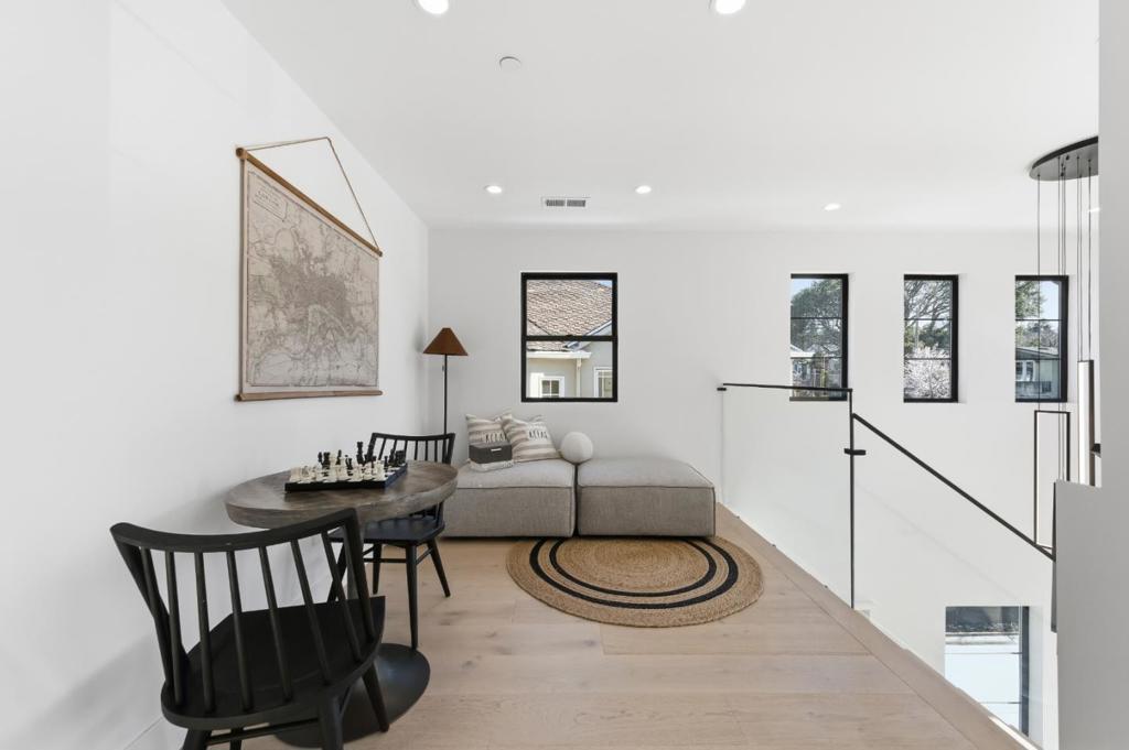 Fully renovated, this modern Burlingame home blends clean architectural lines with warm natural materials and thoughtful functionality. A floating staircase, white oak flooring, and custom linear lighting set the tone for open-concept living spaces that flow effortlessly to the outdoors. The chefs kitchen features porcelain slab surfaces, a waterfall island, dedicated pantry, and a full suite of Miele appliances. Sliding glass doors connect the living area to a private rear deck and landscaped yard, ideal for indoor/outdoor living. The main level includes a guest ensuite bedroom and stylish powder room. Upstairs, a flexible loft space is perfect for an office or lounge. The primary suite offers a private balcony, custom walk-in closet, freestanding soaking tub, oversized shower, and dual vanities with heated and lighted mirrors. Two additional ensuite bedrooms and an upstairs laundry room complete the upper level. Additional features include central heating and cooling, tankless water heater, energy-efficient upgrades, and a detached two-car garage. Located on a tree-lined street close to parks, schools, shops, and dining, this is modern Burlingame living at its finest.