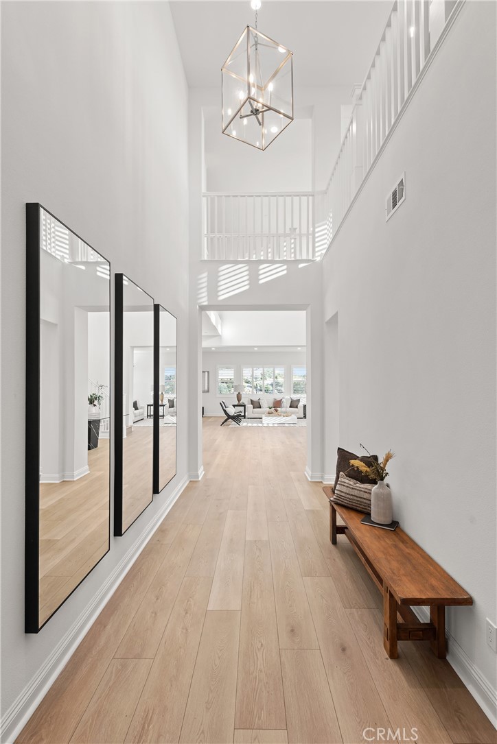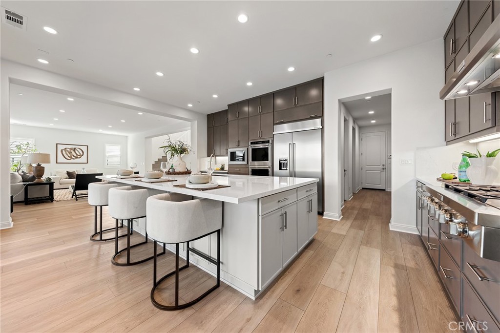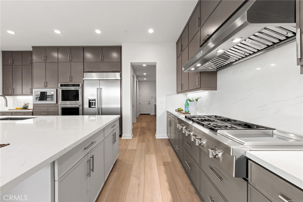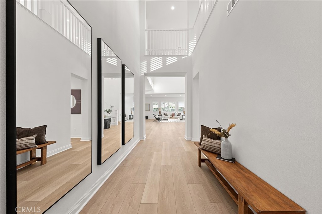 New construction completed in 2025 and never lived in, this exceptional luxury estate within the prestigious gated enclave of The Oaks at Portola Hills captures sweeping panoramic city light views and offers approximately 4,754 Sq Ft of refined living on an expansive 8,984 Sq Ft lot, featuring 5 bedrooms and 4.5 bathrooms. Fully paid-off solar panels with Tesla battery and nearly $300,000 in thoughtfully curated upgrades elevate the home with a sophisticated blend of modern design and timeless comfort. Premium finishes include a designer-appointed kitchen and baths, upgraded wide-plank flooring throughout, plantation shutters, custom chandeliers and statement lighting, and epoxy flooring in the three-car garage, creating a polished and cohesive interior aesthetic. A dramatic two-story foyer introduces the home’s architectural presence, leading to a gracious formal dining room and an elegant staircase ascending to the second level. The main living space expands into a grand great room with 11-foot ceilings, offering a light-filled, airy environment ideal for both upscale entertaining and everyday living. The kitchen serves as the centerpiece of the home, seamlessly extending to the California room through expansive stacking sliding doors that enhance the indoor-outdoor lifestyle. Designed with both beauty and function in mind, the kitchen showcases ceiling-height cabinetry, designer countertops with full-height backsplash, high-end appliances, an oversized island, and a spacious walk-in pantry. The main level includes a private en-suite bedroom and powder room, ideal for guests or multigenerational living. Upstairs, a spacious loft enjoys city views, while the primary suite offers a private view balcony and a spa-inspired bath with freestanding soaking tub, dual vanities, oversized walk-in shower, and an expansive closet. A second en-suite bedroom with its own view balcony and two additional well-proportioned bedrooms complete the upper level. The courtyard-style backyard wraps around the home and enjoys captivating city light views, while the extended driveway accommodates three to four vehicles alongside the three-car garage. Life at The Oaks is complemented by resort-style amenities, featuring a pool, clubhouse, BBQ areas, dog parks, sports courts, and more than 1.5 miles of scenic trails overlooking Lake Forest and Trabuco Canyon. Easy access to the 241 Toll Road and proximity to Irvine Spectrum ensure both privacy and everyday convenience.