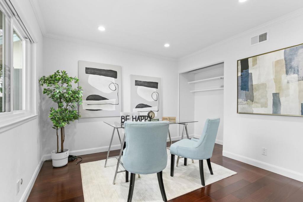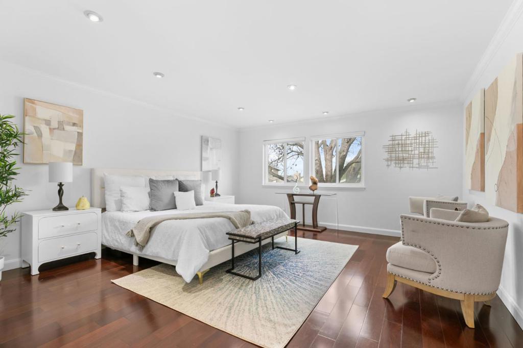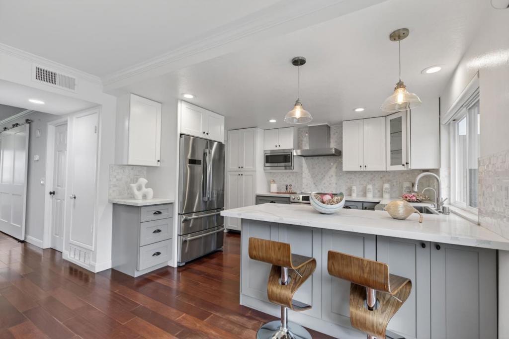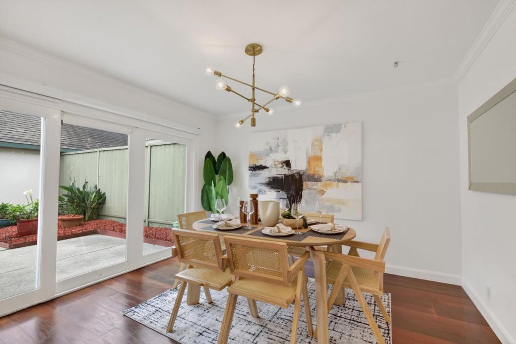 Bright and spacious two-story townhouse in one of the communitys best locations, overlooking the greenbelt. The main level features a generous living room, a versatile den that can serve as a bedroom or office, and a fully updated kitchen with custom cabinetry, quartz countertops, and high-end Bosch Benchmark appliances. The adjacent dining area opens to a private backyard patio, perfect for entertaining. Upstairs, the grand primary suite offers a spa-like bath with dual sinks and a large walk-in closet, while two additional bedrooms share a full hall bath. Additional features include wood flooring throughout, a first-floor powder room, laundry room with washer and dryer, dual-pane windows, and a spacious two-car garage with ample storage. Enjoy resort-style amenities and a prime location in walking distance to seven parks, playgrounds, top-rated schools, The Bay Trail, restaurants, and the Ranch 99 shopping center.