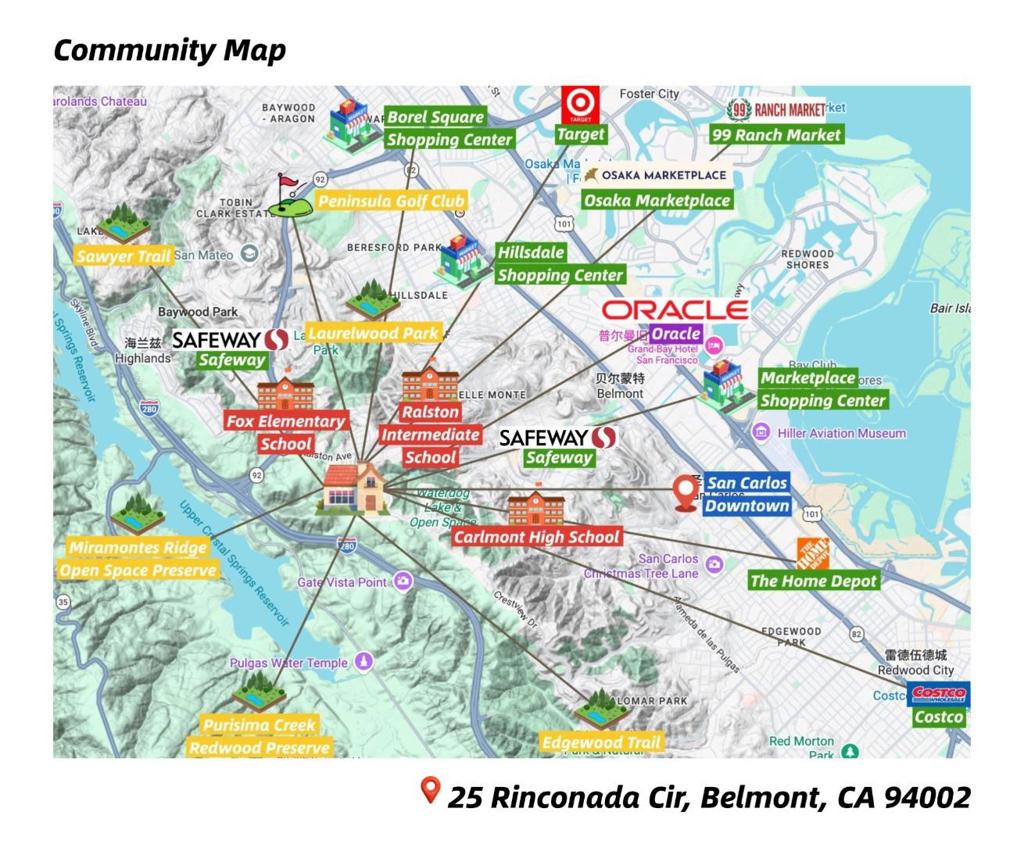 Breathtaking Bay Views in Belmonts Sought-After Hallmark Neighborhood! This beautifully upgraded 3 bedroom and office, 2.5 bath home offers an exceptional blend of comfort, light, and location. Soaring ceilings and an open floor plan create a bright and airy living and dining space, complemented by a spacious kitchen designed for everyday living and entertaining. The oversized primary suite serves as a private retreat featuring scenic windows, a cozy fireplace, and its own private deck to take in the stunning views. Additional highlights include an indoor garden and thoughtfully designed living spaces throughout. Ideally situated near top-rated schools (Fox Elementary, Ralston Intermediate, and Carlmont High, buyer to verify), scenic parks and hiking trails, as well as convenient access to Highways 92, 280, and 101 for easy commuting to San Francisco, the East Bay, and Silicon Valley. A rare opportunity to own in one of Belmonts most desirable neighborhoods.
