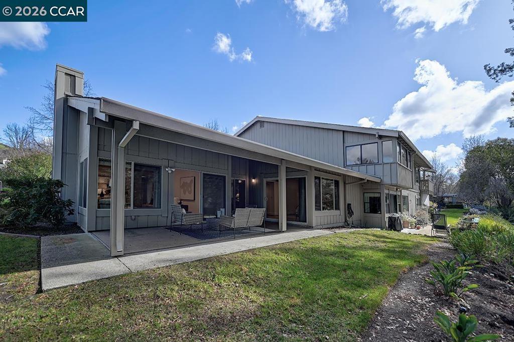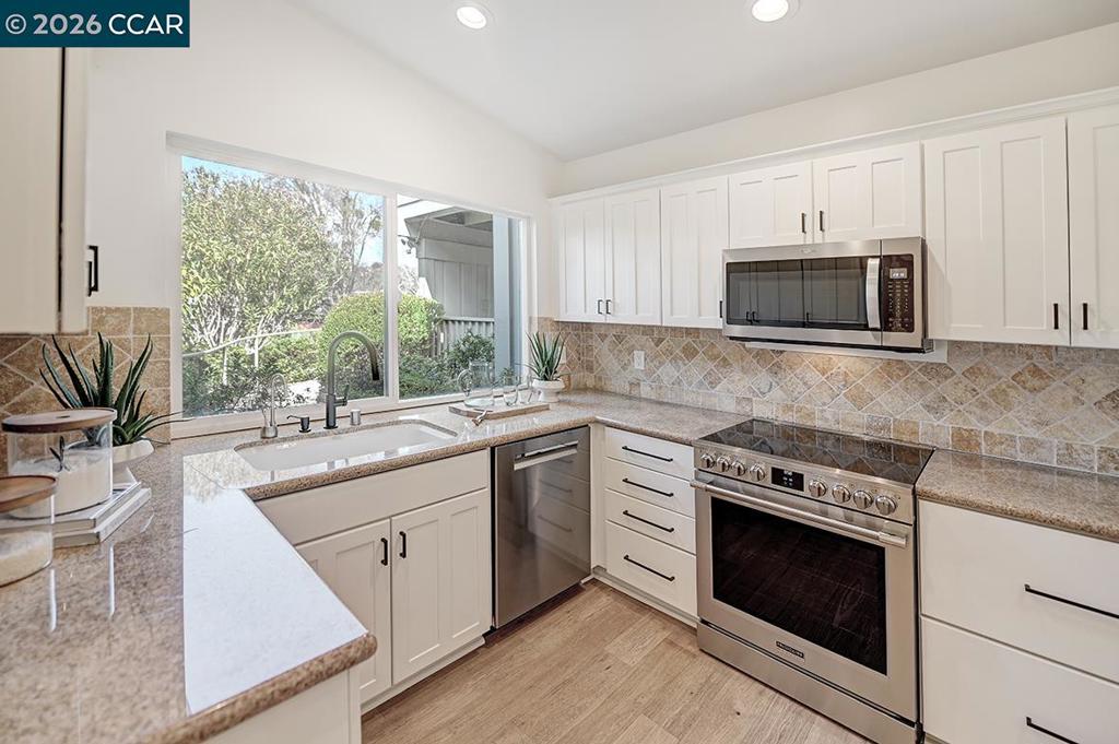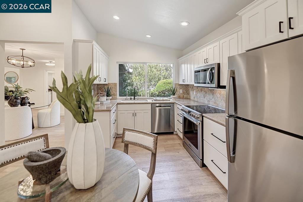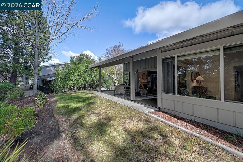 Spectacular LEVEL IN single story, end unit Whitney! Lights galore, recently added MANY overhead lights in the Garage, Kitchen, Dining Room, Living Room and Primary Bedroom. A spacious grand Living Room features a stone fireplace and provides access to a private, extremely wooded quiet back patio. Cozy Den or 3rd bedroom located near the entrance with double doors for privacy. The kitchen shines with white cabinets and black handles, stainless steel appliances, an oversized skylight, room for a table and chairs afford in room dining. Radiant floors in the Primary Bathroom with a curb-less walk in shower. Solar tubes in the bathrooms for natural light, a separate room for an interior washer/dryer and engineered hardwood floors throughout. Attached garage with adjacent carport. Highly desirable area, close to Rossmoor's Event Center, Dollar Clubhouse, the New Rossmoor restaurant and two well maintained golf courses.