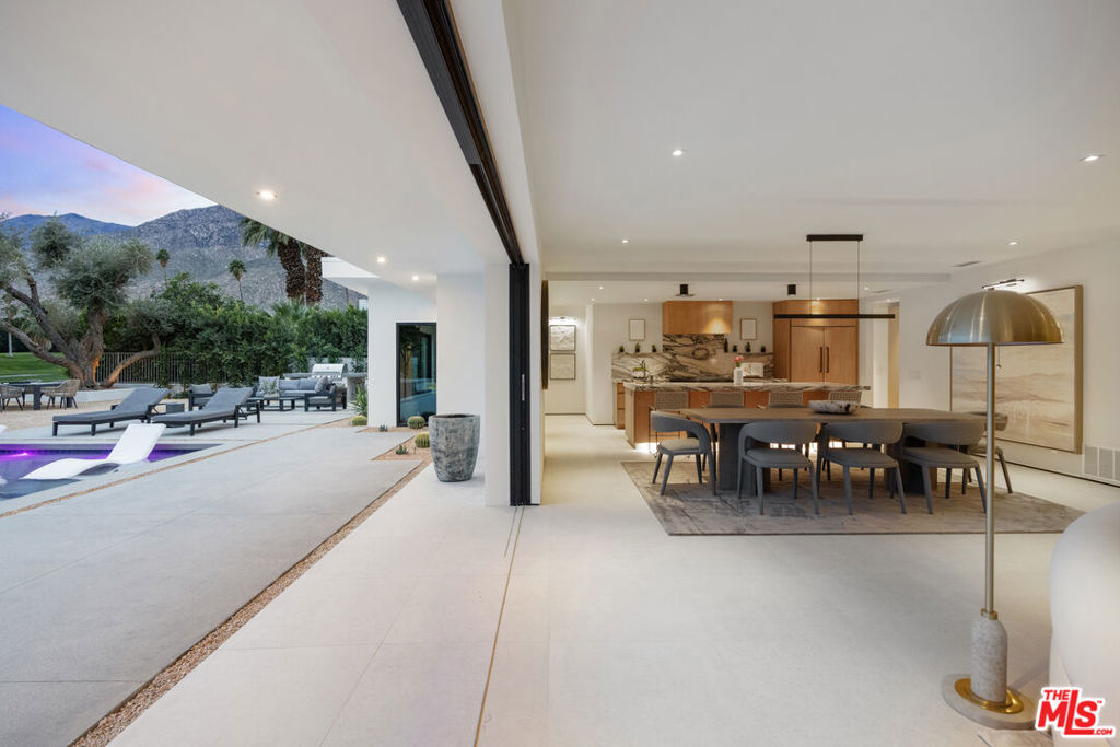 Located within the coveted Indian Canyons enclave of Palm Springs, this newly reimagined residence occupies an exceptional golf course setting with sweeping views of the San Jacinto Mountains. Reconstructed through a comprehensive 12-month structural renovation, the four-bedroom, four-bath home showcases warm natural materials, sculptural stone detailing, and pocketing glass walls that seamlessly extend the interiors into the surrounding desert landscape. A dramatic glass pivot entry opens to light-filled living spaces featuring solid oak doors, custom oak cabinetry, skylights, and a volcanic stone fireplace that anchors the main living area. Exterior stone elements continue into the entry garden, creating a seamless indoor-outdoor transition. The chef's kitchen is appointed with a full Dacor appliance suite anchored by a 48-inch professional range, complemented by Sub-Zero refrigeration, an integrated Sub-Zero ice maker, dual dishwashers, a dedicated prep sink, and a walk-in pantry designed for both function and presentation. Curated Italian marbles and rare quartzites define the home's material palette, while spa-inspired bathrooms feature distinctive marble finishes accented by indoor succulent garden shower elements that introduce natural texture and a calming connection to the outdoors. An entertaining bar finished in rare, striking stone incorporates built-in wine refrigeration, serving as a visual focal point within the main living spaces. Each of the two primary suites features spacious custom walk-in closets, while subtle under-cabinet and wardrobe illumination throughout the home creates a warm, inviting ambient glow. All major systemsincluding roof, framing, electrical, plumbing, and advanced heat-pump mechanical systemshave been newly completed. The residence is prewired for automated shade systems, and the two-car garage is EV-ready. Outdoor living is designed for entertaining, with a secured front-yard approach transitioning to a backyard that opens directly to the golf course for uninterrupted fairway and mountain views. Minimalist desert landscaping with mature palms and olive trees frames multiple lounge and fire-feature areas, enhanced by dramatic evening landscape lighting. A sculptural barbecue station anchors the outdoor living area. The resort-style pool features a dive-worthy deep end, expansive sun shelf, and an elevated spa with cascading waterfall, all finished in designer tile. Blending a comprehensive structural transformation, refined organic modern design, and an exceptional South Palm Springs golf course setting, this residence stands as a rare turnkey offering crafted for the sophisticated, design-driven luxury buyer.