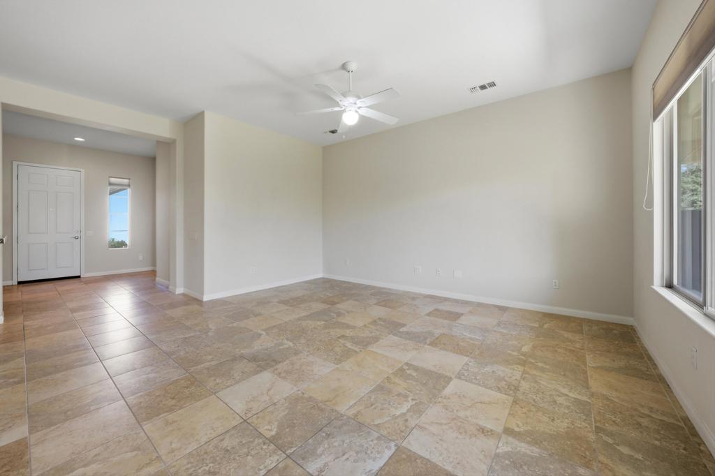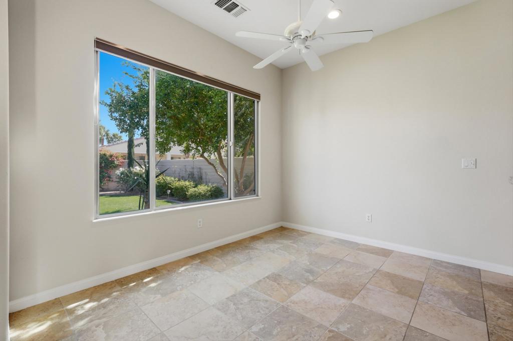 Located behind the gates of the esteemed 55+ community of Sun City Shadow Hills, this highly sought-after Avalino model offers a thoughtfully designed great room floor plan with two bedrooms, a dedicated den or office, and two full bathrooms. Designed for effortless desert living, the residence provides a seamless transition from the main living areas to a covered outdoor patio--ideal for al fresco dining, morning coffee, or evening gatherings in your private, landscaped backyard. The east-facing orientation offers comfortable year-round enjoyment and abundant natural light.Interior finishes reflect tasteful simplicity, with neutral tile flooring throughout the main living areas and plush carpeting in the bedrooms. The kitchen is appointed with slab granite countertops and stainless-steel appliances, creating a refined yet functional space for everyday living and entertaining. A desirable split-bedroom configuration ensures privacy for visiting family and guests.Notable upgrades include a newly installed air conditioning system and a Culligan water softener. Residents of Sun City Shadow Hills enjoy access to an impressive array of amenities, including two clubhouses, two golf courses, multiple pools, fitness centers, tennis and pickleball courts, along with an active calendar of social events and community activities. Conveniently located approximately 15 minutes from Acrisure Arena--home to AHL hockey, major concerts, and premier entertainment--as well as Costco, dining destinations, and shopping centers, this home presents an exceptional opportunity to enjoy comfort, convenience, and community in one of the desert's most desirable active adult neighborhoods.