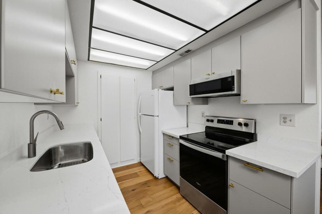 Fantastic 2 Bed 2 Bath upstairs property. Walk-in to your spacious living room/dining area combination with vaulted ceiling and skylights.. The Kitchen has been remodeled, 2022, with newer cabinetry, quartz countertops, oven and range, dishwasher and microwave. Both Baths have newer vanities, quartz counter tops, and flooring, with each having a shower over tub. There is a beautiful, engineered hardwood floor throughout, newer furnace and air conditioning unit as well as new water heater. The washer and dryer are included. One car garage and carport are near property. This is truly a property that you would love to call home located within one of the most desirable and centrally located communities, of 1600 Hamilton Place Corners.