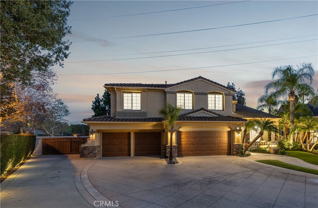 Positioned at the end of a cul-de-sac within the gated La Verne Heights community, this expansive residence blends architectural scale, refined detailing, and resort-inspired outdoor living. A four-car garage, dedicated RV parking, and approx. ten additional uncovered parking spaces provide exceptional flexibility. An artificial turf front lawn and a walkway lead through manicured landscaping with a fountain, and to a private front courtyard. The covered entry is framed by stone columns and double wood doors with iron and glass inlays. Inside, a two-story foyer showcases soaring ceilings, a chandelier, rich hardwood flooring, and a staircase with wood handrails and iron balusters. The formal living room features vaulted ceilings and a large window overlooking the front yard. The adjacent dining room offers crown molding, French doors to the backyard, and direct access to the kitchen. The remodeled kitchen is appointed with classic white cabinetry, granite countertops with full tile backsplash, stainless steel appliances, a center island with pendant lighting and seating, a walk-in pantry, a breakfast nook and a corner butler’s pantry. The family room includes LED lighting, crown molding, an elevated fireplace with custom carpentry detail, plantation shutters, and French doors providing backyard access. A downstairs bedroom, currently used as an office with double doors, offers direct access to the guest bathroom. The laundry room features cabinetry, a folding counter, utility sink, and garage access. Upstairs, a large bonus room offers vaulted ceilings, LVP flooring, and mountain views. The primary suite features French doors to a private view balcony and a two-sided fireplace shared with a retreat. The primary bath is separated by a barn door and includes dual sinks, a vanity counter, a custom tiled shower with frameless glass enclosure, a separate soaking tub, and two walk-in closets. Two secondary bedrooms share a remodeled Jack-and-Jill bathroom, while a third bedroom has direct access to an additional bath that also serves the loft. The private backyard is designed for entertaining, featuring a pool and spa with custom stone and tile work, a spa with an elevated spillway, a spanning covered patio with tongue-and-groove ceiling and recessed lighting, a built-in BBQ with seating and stone finish, an outdoor fireplace with matching stone, concrete decking with stone inlay, mature perimeter landscaping, turf, lighting, privacy hedges, and stucco walls.