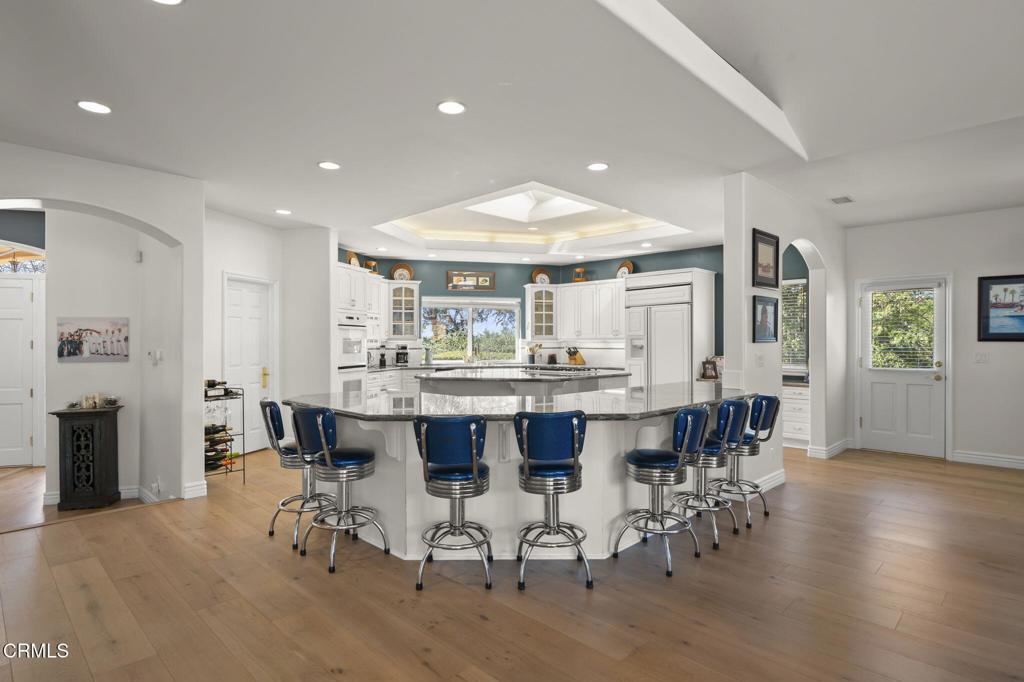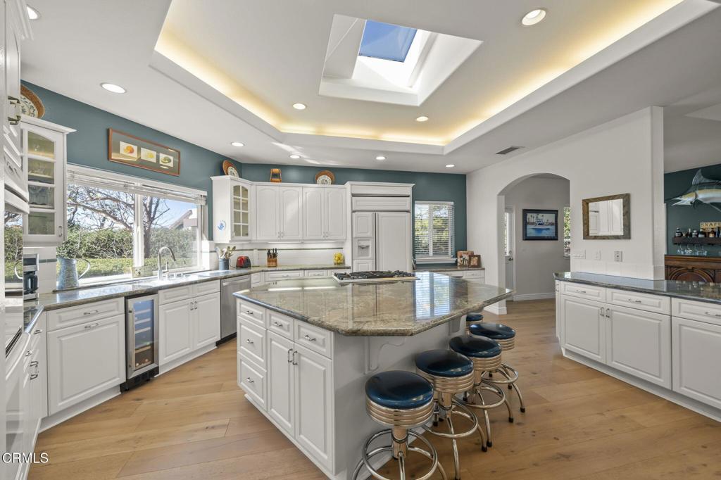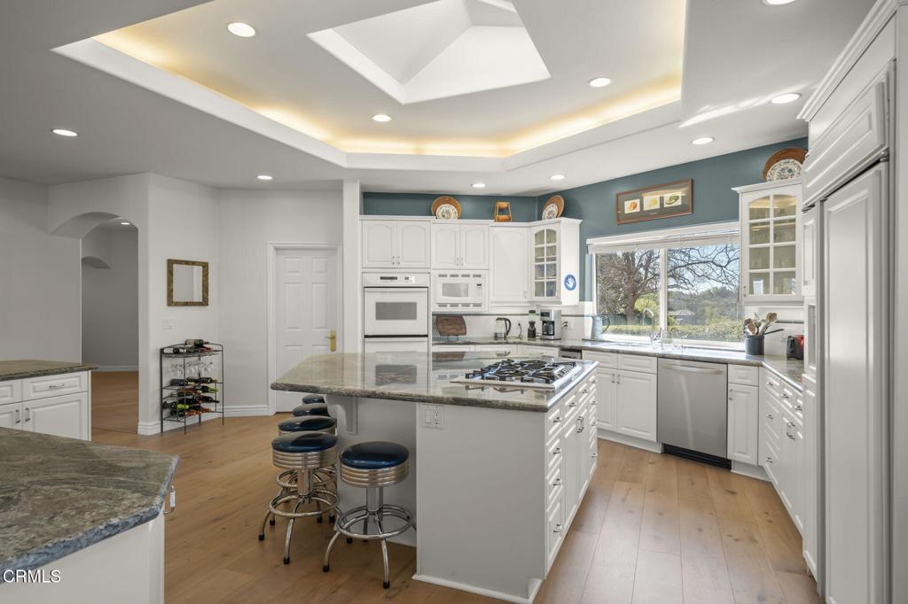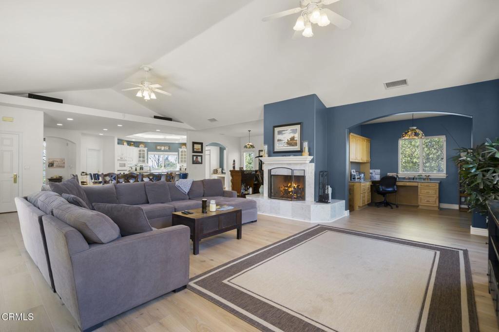 Beautiful large single story home located in the Terra Bella Estates in Camarillo, this spectacular property offers the best of both entertaining and private worlds. Situated high at the end of a small cul-de-sac, this 4,109 square foot home features 4 bedrooms and 4 bathrooms, including a plush master suite with two walk-in closets. Extraordinary attention to detail in the design of this custom home includes vaulted and beveled ceilings throughout, arched entryways, and step-up living areas. The gourmet kitchen opens to a great room which boasts a marble adorned fireplace, an office nook, and ample natural lighting. The 1 acre lot features a custom freshwater pool and spa providing the perfect ambiance for entertaining. Two shaded pergolas as well as an outdoor Viking grill and refrigerator will persuade you to indulge in the lap of luxury. Owned solar panels. If you like cars, check out the 4 car garage.