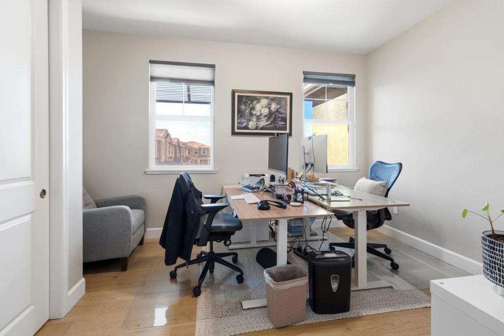 Discover contemporary luxury at 651 Cinnamon Circle, a stunning 2-bedroom, 2.5-bath townhome built in 2018. Overlooking a serene community greenbelt and playground, this tri-level residence blends high-end finishes with an unbeatable Silicon Valley location. Sophisticated Living Spaces: the open-concept second floor features a bright great room with engineered wood flooring and a sleek, chef-inspired kitchen. Highlights include quartz countertops, a walk-in pantry, and custom soft-closing cabinetry. Step outside to your private balcony that is entertaining. Comfort & Versatility: the top floor offers two spacious en-suite bedrooms and a convenient laundry area with stackable appliances. On the ground level, the attached 2-car tandem garage has been elegantly finished into a bonus room ideal for a secluded home office, gym, or creative studio. Unmatched Commute & Lifestyle: Located minutes from Google, Microsoft, NASA, and Stanford, this home is a commuters dream with easy access to Hwy 101, 85, and 237. Enjoy local favorites like Downtown Mountain View, the Stevens Creek Trail, and Shoreline Park just moments away. Don't miss this rare, move-in-ready modern gem!