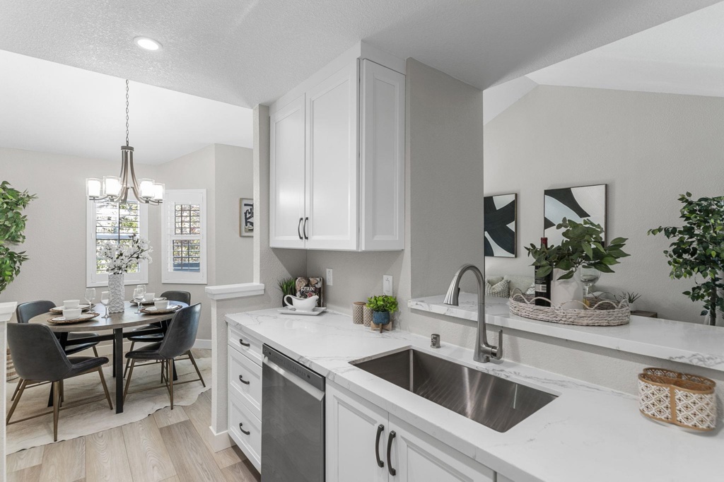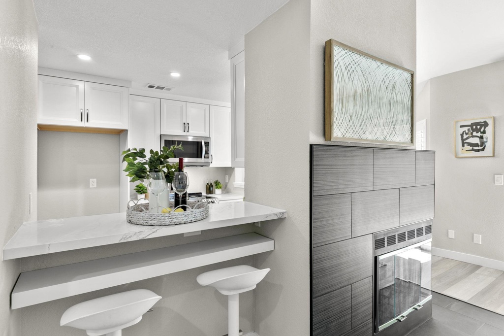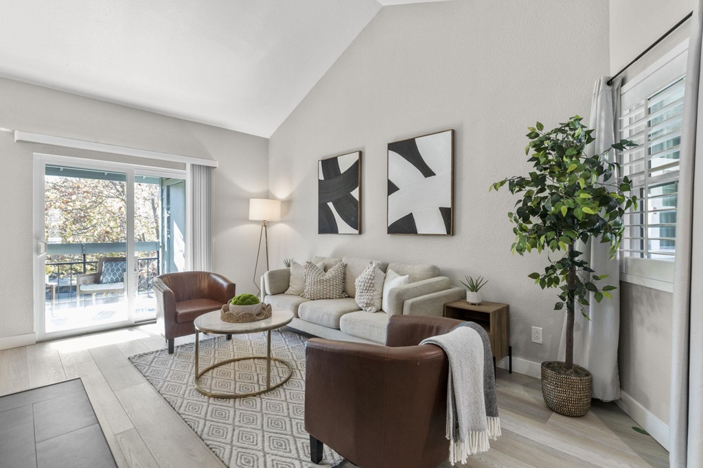THIS IS IT!!!! Stylish, bright, and completely remodeled! This stunning 1-bedroom, 1-bath upper-level home has been thoughtfully upgraded from top to bottom...with over $140k in upgrades! Step inside to discover soaring vaulted ceilings and an open, airy layout. The new kitchen showcases gorgeous Carrara quartz countertops, shaker-style cabinets, and matching LG stainless appliances — perfect for both everyday living and entertaining. The spa-inspired bath also features Carrara counters and a striking quartz wall in the shower, adding a touch of elegance and sophistication. Enjoy fresh finishes including new windows, new heavy duty interior doors, and sliding door, complemented by elegant plantation shutters that provide both style and privacy. A spacious walk-in closet with a built-in custom organizer offers exceptional storage and functionality. New sound absorbing wide plank flooring and contemporary light fixtures elevate the entire space, while a covered balcony extends your living area outdoors — the ideal spot for morning coffee or evening relaxation. With its open design and stylish upgrades, this unit combines comfort, functionality, and elegance in one beautiful package.