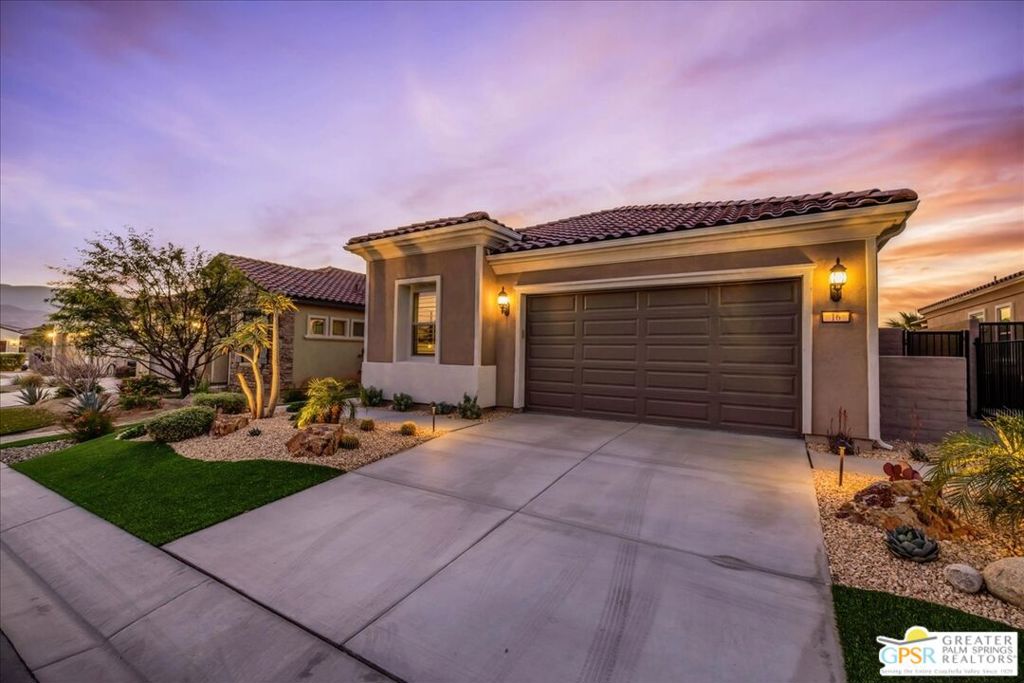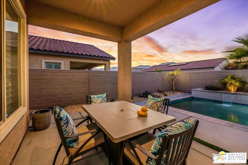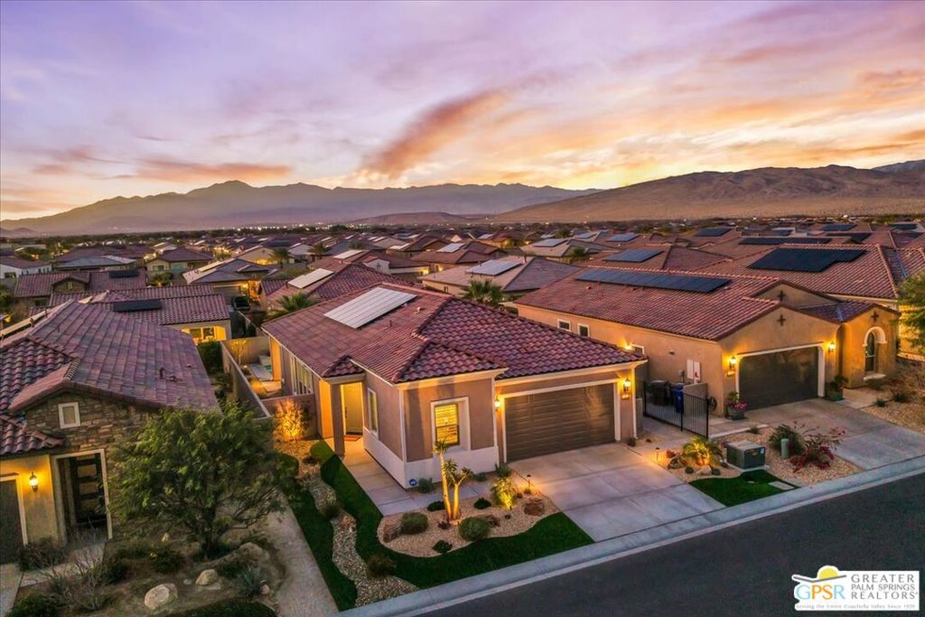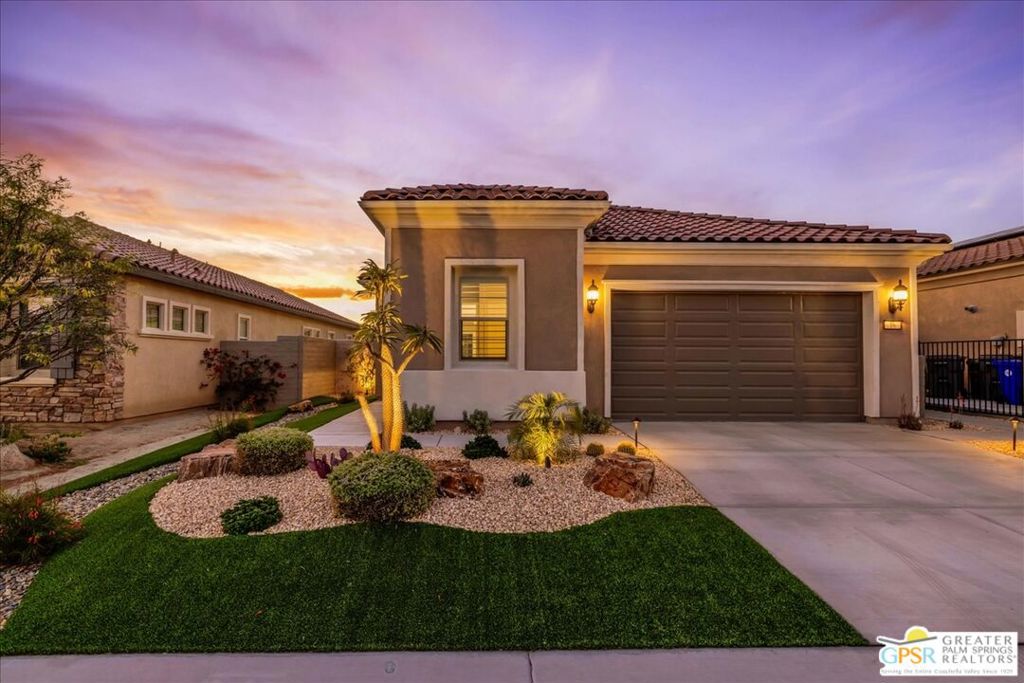 Exquisite Prairie-Style Retreat with OWNED SOLAR and Private POOL & SPA in Del Webb's Premier 55+ Community. Discover the pinnacle of resort-style living in this stunning PHASE 5 PLAN 1 GETAWAY, nestled within the prestigious gated community of Del Webb. Thoughtfully designed with elegance and comfort in mind, this sophisticated residence boasts an open-concept layout with two spacious bedrooms, two beautifully appointed baths, and an array of high-end upgrades. Step inside and be captivated by the seamless blend of style and functionality - custom designer paint, rich porcelain tile flooring, classic wood shutters, and stylish ceiling fans create an ambiance of timeless refinement. The gourmet kitchen, open to the great room, is a chef's delight, featuring luxurious granite countertops, sleek stainless-steel Whirlpool appliances, intricate custom tilework, and hand-selected pendant lighting illuminating the oversized island. The light-filled great room is the heart of the home, where expansive windows bathe the space in natural light, highlighting the custom fireplace and striking display niches with LED accent lighting. Retreat to the lavish primary suite, complete with oversized sliding doors, a spa-like ensuite bath featuring dual vanities, an expansive walk-in shower, and a custom-designed walk-in closet. The guest room, situated on the opposite side of the home, ensures privacy and convenience with easy access to the elegantly finished secondary bath. Step outside to your own private desert oasis, where a full-length covered patio invites year-round relaxation. Take in breathtaking mountain views while basking in the serenity of your Pebble Tec saltwater pool and spa, complete with a tanning shelf, natural stone surround, and tranquil waterfall features. Beyond your doorstep, experience the unparalleled amenities of Del Webb, including a state-of-the-art clubhouse, fitness center, tennis and pickleball courts, and an array of social and recreational activities. Note the HOA Fee now includes cable and internet package! *Furnishings available per inventory under a separate agreement.