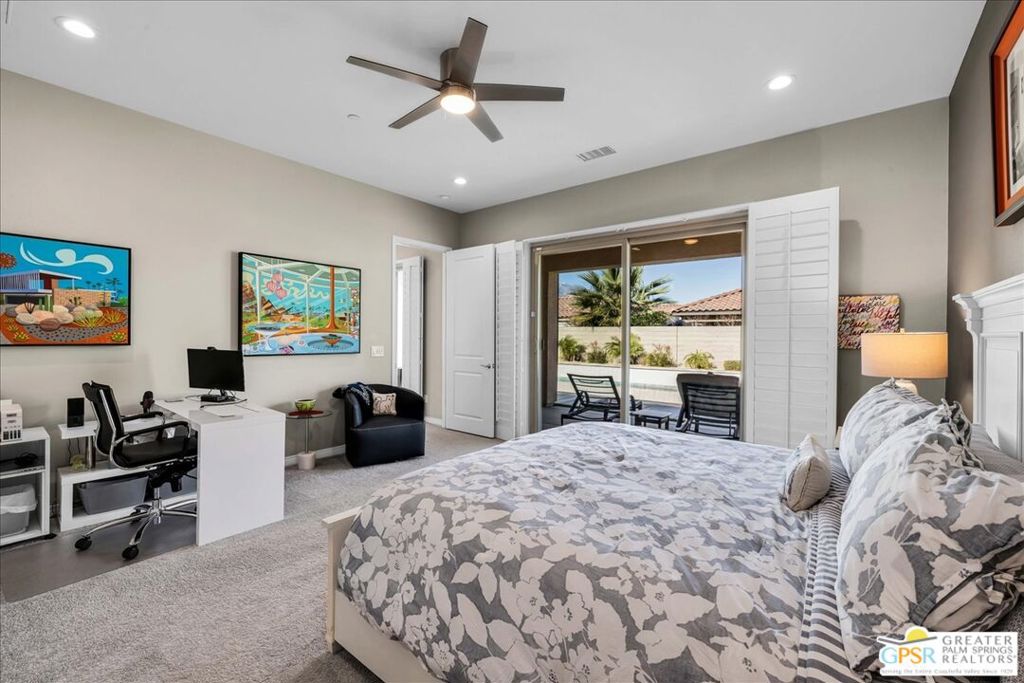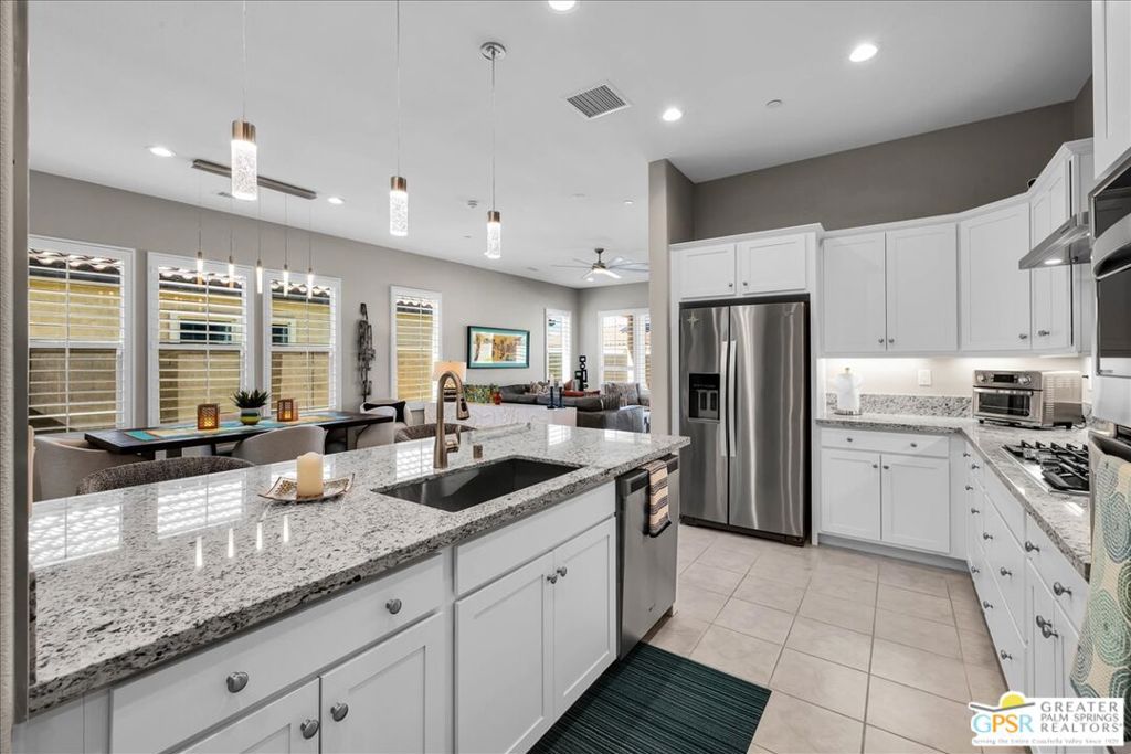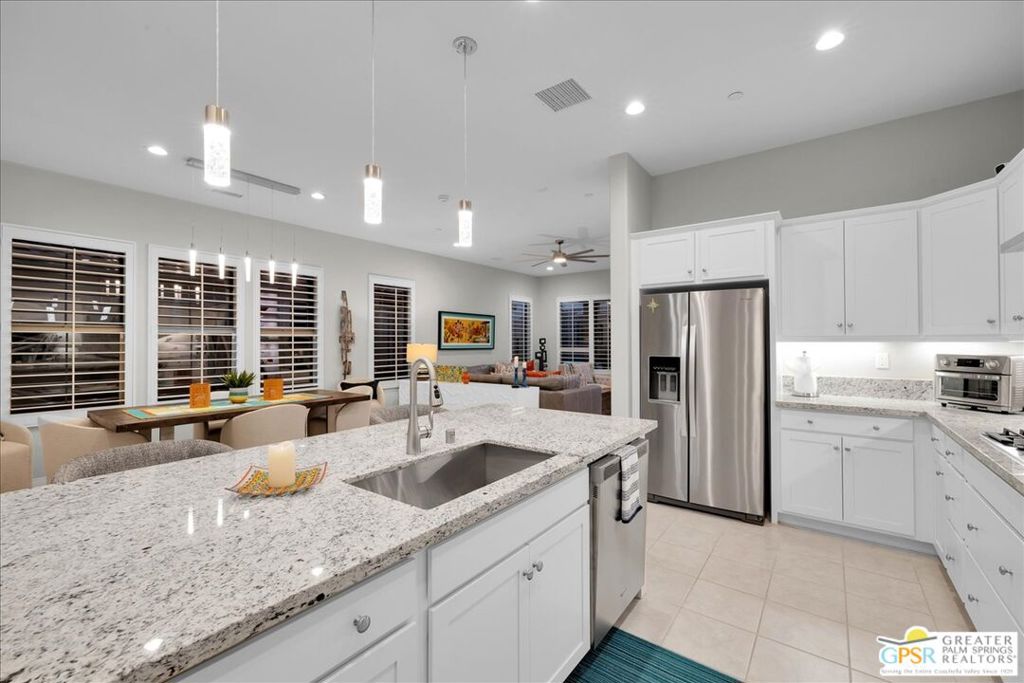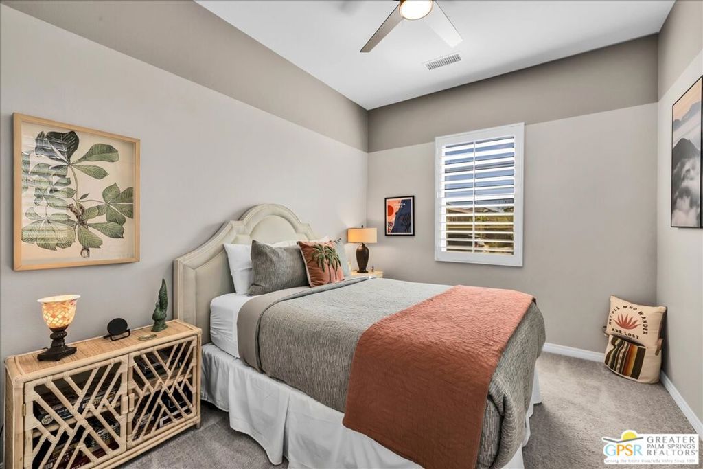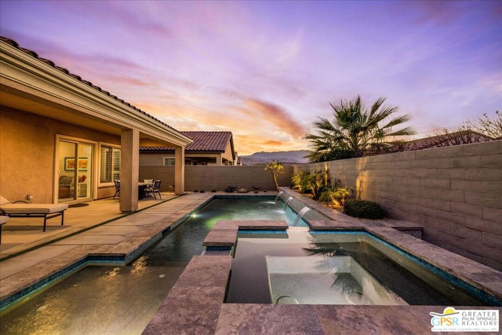 Exquisite Prairie-Style Retreat with OWNED SOLAR and Private POOL & SPA in Del Webb's Premier 55+ Community. Discover the pinnacle of resort-style living in this stunning PHASE 5 PLAN 1 GETAWAY, nestled within the prestigious gated community of Del Webb. Thoughtfully designed with elegance and comfort in mind, this sophisticated residence boasts an open-concept layout with two spacious bedrooms, two beautifully appointed baths, and an array of high-end upgrades. Step inside and be captivated by the seamless blend of style and functionality - custom designer paint, rich porcelain tile flooring, classic wood shutters, and stylish ceiling fans create an ambiance of timeless refinement. The gourmet kitchen, open to the great room, is a chef's delight, featuring luxurious granite countertops, sleek stainless-steel Whirlpool appliances, intricate custom tilework, and hand-selected pendant lighting illuminating the oversized island. The light-filled great room is the heart of the home, where expansive windows bathe the space in natural light, highlighting the custom fireplace and striking display niches with LED accent lighting. Retreat to the lavish primary suite, complete with oversized sliding doors, a spa-like ensuite bath featuring dual vanities, an expansive walk-in shower, and a custom-designed walk-in closet. The guest room, situated on the opposite side of the home, ensures privacy and convenience with easy access to the elegantly finished secondary bath. Step outside to your own private desert oasis, where a full-length covered patio invites year-round relaxation. Take in breathtaking mountain views while basking in the serenity of your Pebble Tec saltwater pool and spa, complete with a tanning shelf, natural stone surround, and tranquil waterfall features. Beyond your doorstep, experience the unparalleled amenities of Del Webb, including a state-of-the-art clubhouse, fitness center, tennis and pickleball courts, and an array of social and recreational activities. Note the HOA Fee now includes cable and internet package! *Furnishings available per inventory under a separate agreement.