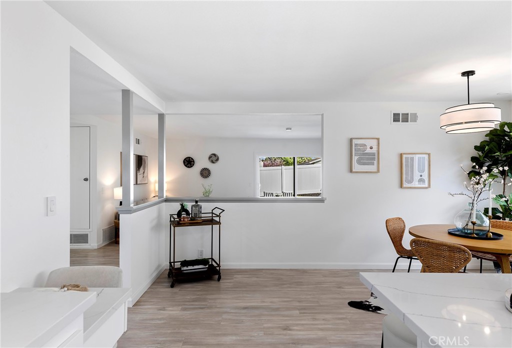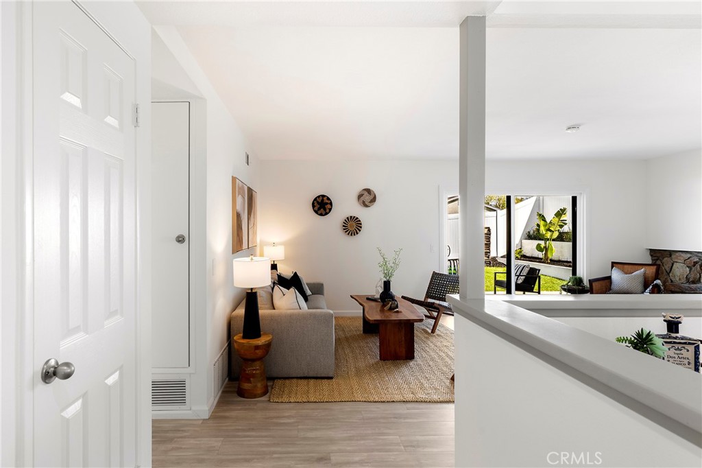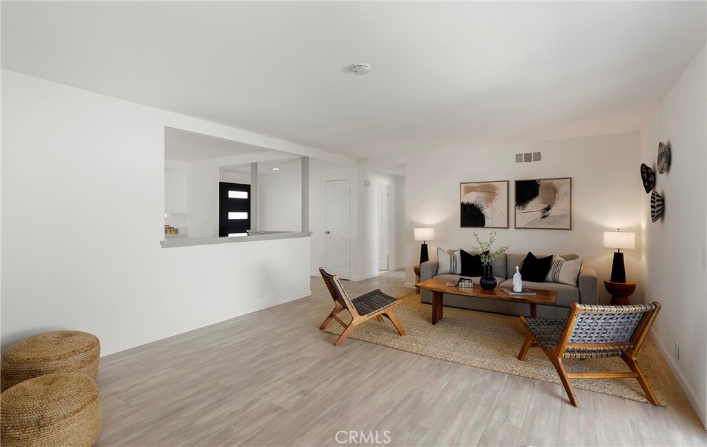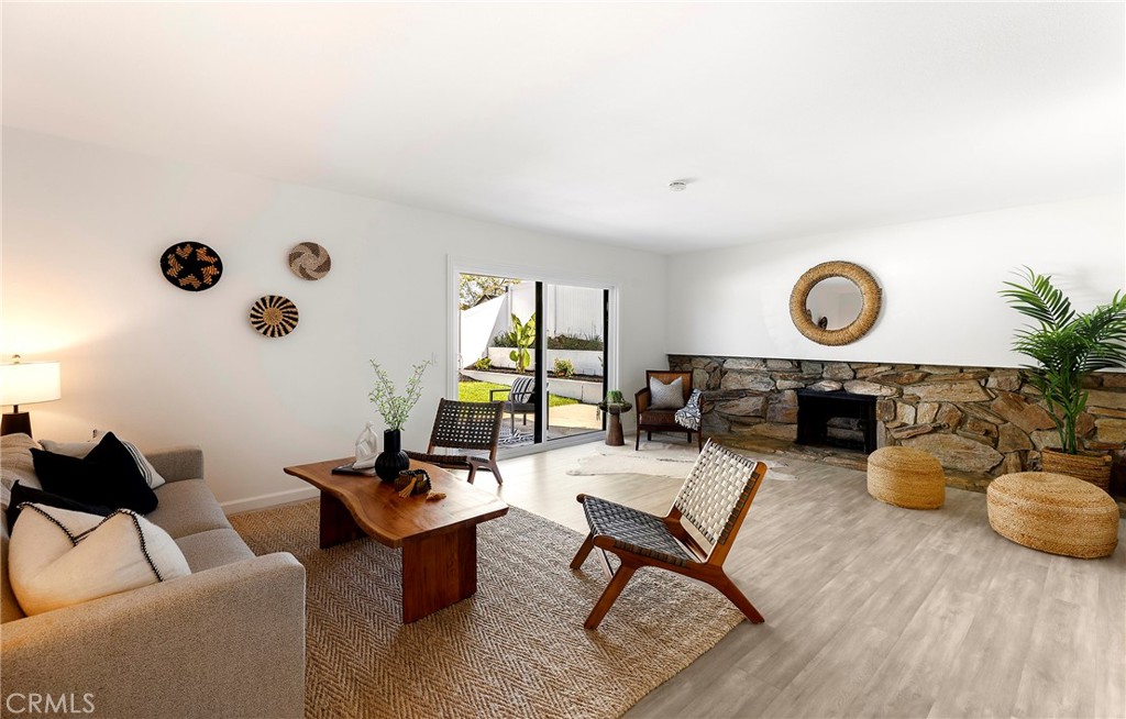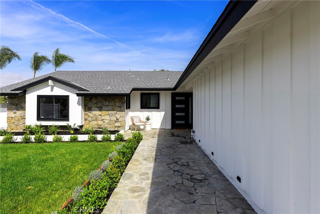 Situated in the heart of Laguna Hills with no Mello Roos or HOA, this thoughtfully updated single-level home offers an effortless lifestyle with a fresh mid-century feel and modern upgrades throughout. Upon arrival, you’ll notice that the home makes an immediate impression with freshly painted exterior, new light fixtures, updated front door and mailbox, and beautifully reimagined landscaping in the front, side, and backyard. A flagstone entry path leads to a private patio with space for dining or lounging—perfect for enjoying evening sunsets. Inside, natural light fills the open living spaces, highlighted by luxury grey wood-style laminate flooring and a spacious living room anchored by a wood-burning fireplace framed in a dramatic flagstone surround. A half-wall pass-through to the kitchen enhances the open-concept feel while preserving wall space for furnishings. Sliding doors extend the living area outdoors to a very private, expansive backyard featuring a lush lawn, fragrant tropical plantings including hibiscus, bird of paradise, star jasmine, boxwood, and lavender, along with fruit trees and an herb garden. New vinyl fencing, a block retaining wall, and a fully redesigned sprinkler system complete the outdoor transformation. The remodeled kitchen is both stylish and functional, featuring crisp white cabinetry with new doors and hardware, quartz countertops, generous pantry and linen storage, and a counter-height island with bar seating for two. The kitchen flows seamlessly into the dining area, where a new mid-century modern double-drum ceiling fixture adds a designer touch. All three bedrooms are comfortably sized and feature new glass sliding closet doors. The primary suite includes a bay window with window seat and an updated en-suite bath. Both bathrooms have been fully refreshed with marble tile, new vanities, resurfaced enclosures, and all-new fixtures. Additional upgrades include: new double-pane windows throughout, a new asphalt shingle roof, refreshed garage with automated garage door and an updated washer/dryer area with a utility sink, recent termite fumigation (2026), and a freshly painted interior. Just a short walk to award-winning schools, steps away from Knotty Pine Park, ideally located near the 5 freeway & Toll Roads, and just miles to Laguna Beach, Irvine Spectrum, shopping, and world-class restaurants, this home offers turn-key convenience and a fun lifestyle beyond!