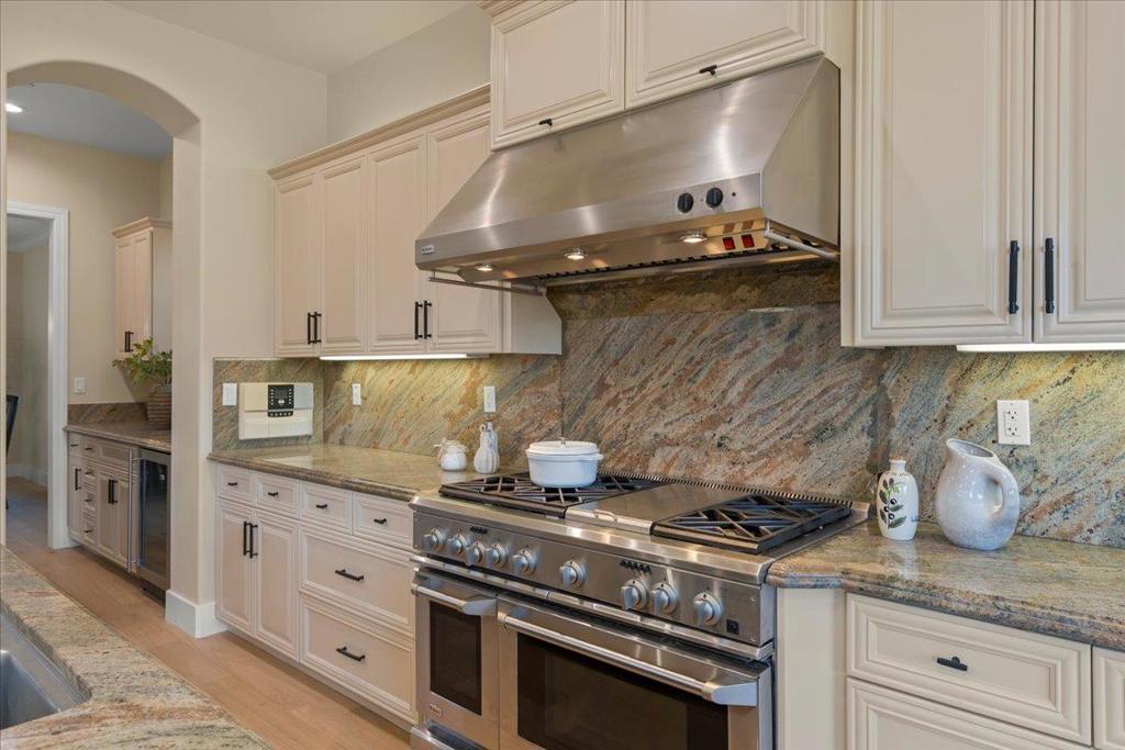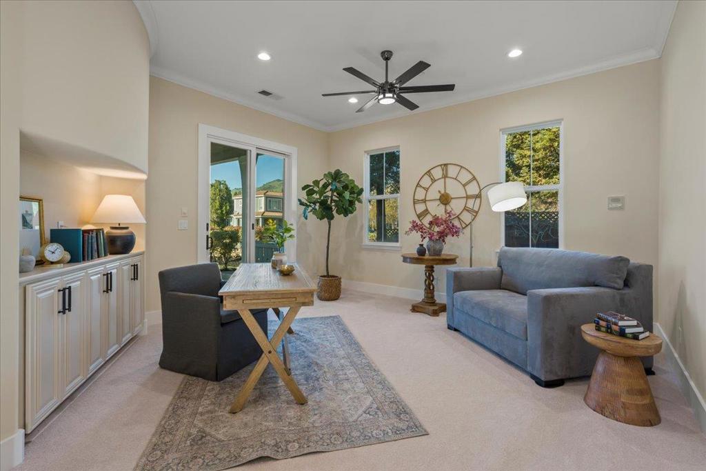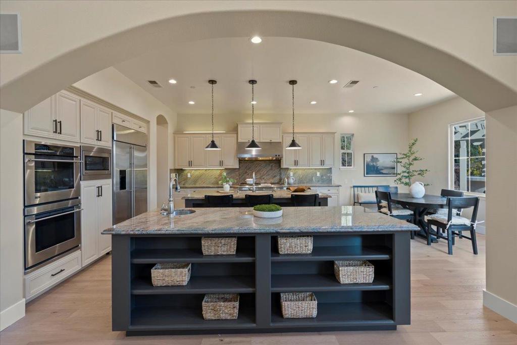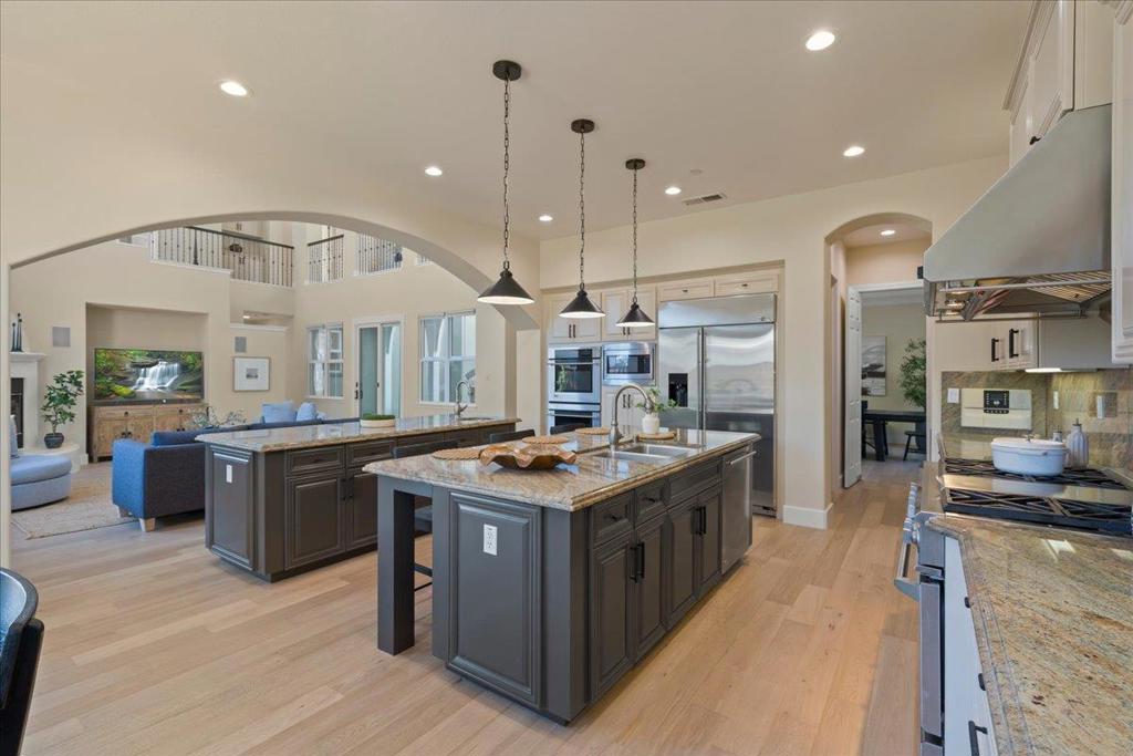 Located in the desirable Alicante neighborhood and adjacent to the community park, this light-filled and beautifully updated home offers an exceptional floor plan ideal for family living and extended guests. The kitchen provides two spacious islands, a large walk in pantry and casual family dining open to the great room. Upgrades include all-new LED lighting and fixtures, new carpet throughout, and new wood flooring on the main level. The main floor features formal living and dining rooms, a spacious home office and a private downstairs suite with ensuite bath, kitchenette with microwave and mini fridge, and access to the rear yard-perfect for guests or multigenerational living. Outdoor spaces are inviting with a private courtyard and office patio with new Renewal by Anderson sliding doors to an outdoor fireplace and loggia and to a private patio off of the office. The rear yard has an outdoor kitchen and raised garden beds. Upstairs the primary suite includes a fireplace, spa-style bath with jetted tub, dual vanities, and a large walk-in closet. An additional ensuite bedroom, two bedrooms with a Jack-and-Jill bath, and a versatile bonus room that could be used as a media room or 2nd family room completes the upper level. A 3-car garage adds convenience and storage.