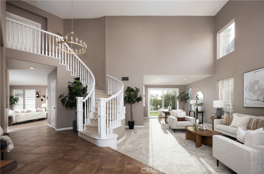 Situated on a premium view lot within the prestigious gated community of Parkridge, this exceptional residence offers the perfect blend of privacy, elegance, and breathtaking scenery. Tucked away on a quiet cul-de-sac and just moments from the community pool and amenities, the home delivers a rare sense of serenity that is truly hard to find. From the moment you arrive, the panoramic, unobstructed views captivate. The upstairs primary suite provides a remarkable vantage point stretching all the way to Catalina Island, with sweeping vistas of city lights, rolling mountains, and the sparkling ocean beyond. Nightly Disneyland fireworks can even be enjoyed from the primary suite windows, creating a setting that inspires both awe and tranquility. Step through the double front doors into a grand entry with soaring ceilings and expansive windows that flood the interior with natural light. The spacious living room offers an inviting space to gather, while the formal dining room, framed by elegant French doors, seamlessly connects indoor and outdoor entertaining. The beautifully upgraded kitchen serves as the heart of the home, featuring granite countertops, crisp white cabinetry, a generous center island, and a picturesque window overlooking the backyard and endless views. A walk-in pantry and sunlit breakfast nook enhance both function and charm. The kitchen opens effortlessly to the expansive family room, complete with a cozy fireplace, built-in bar area, and large sliding doors that invite you outdoors. A main-floor bedroom and full bathroom provide ideal flexibility for multigenerational living or a private home office. The first level is completed by a spacious laundry room and a three-car garage. Ascending the elegant spiral staircase, the primary suite is a true retreat. This oversized sanctuary showcases stunning views from every window and includes a spa-inspired bath with dual sinks, vanity area, walk-in shower, soaking tub, and two walk-in closets. A bonus room or private library adds additional versatility. Upstairs, three generously sized bedrooms, one currently used as a bonus room, and two full bathrooms provide ample space for family and guests. Residents of Parkridge enjoy exclusive access to a community pool, spa, sports court, picnic areas, and beautifully maintained grounds, all within a gated setting and served by highly regarded schools. This is more than a home. It is a lifestyle defined by views, privacy, and timeless elegance.