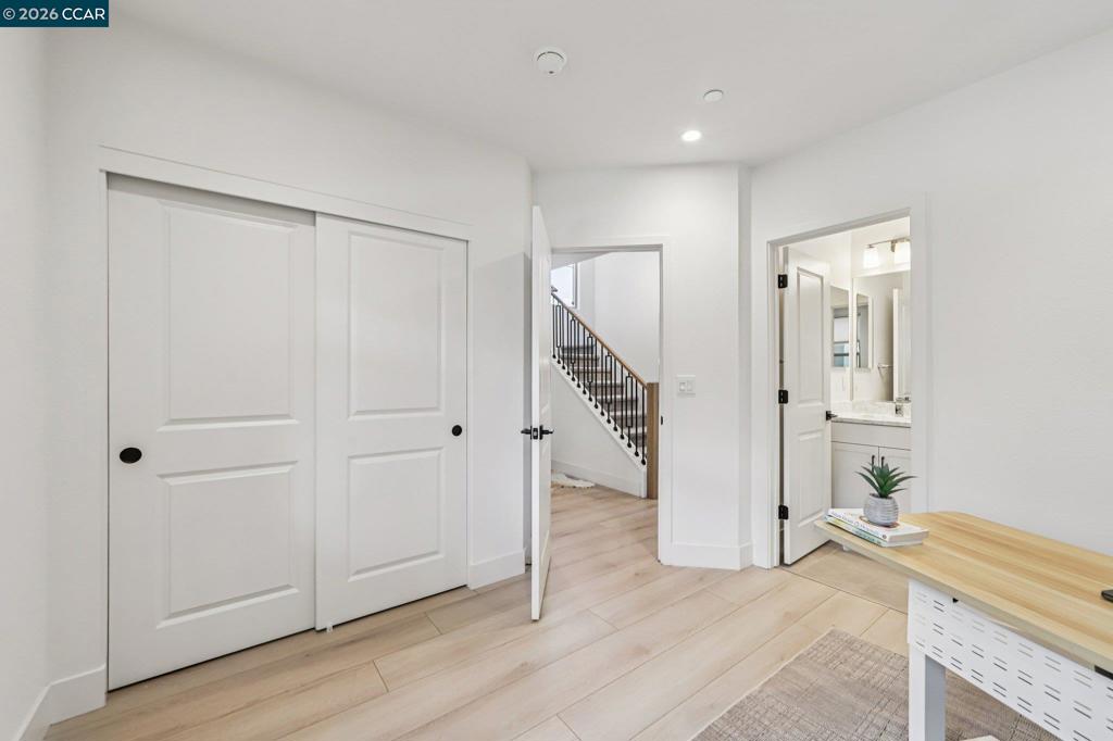 Practically new and beautifully upgraded, this light-filled townhouse-style condominium offers thoughtfully designed living across three levels. As a desirable end unit, it enjoys added privacy, a street-facing location with convenient guest parking, and sits directly next to the community dog park. The entry level features a private bedroom with ensuite bath and direct access to the attached two-car garage, ideal for guests, multigenerational living, or a home office. The main level showcases a stunning kitchen with a waterfall marble island, custom pantry shelving, abundant recessed lighting, and seamless flow into the living and dining areas. A charming office nook, stylish powder bath, and private deck complete the space. Upstairs offers a spacious primary suite, two additional bedrooms, a full bath with double vanity, and a convenient laundry room. Upgrades include owned solar, additional lighting, high-quality window coverings, custom closet shelving in 2 of the rooms, upgraded walk in closets—too many upgrades to mention. Located in the sought-after SummerHill community just one block from BART, with easy freeway access and close to Bay Club. A must-see