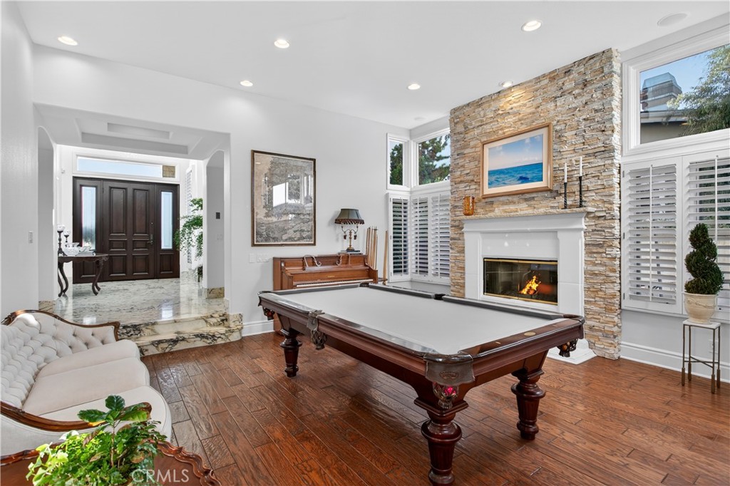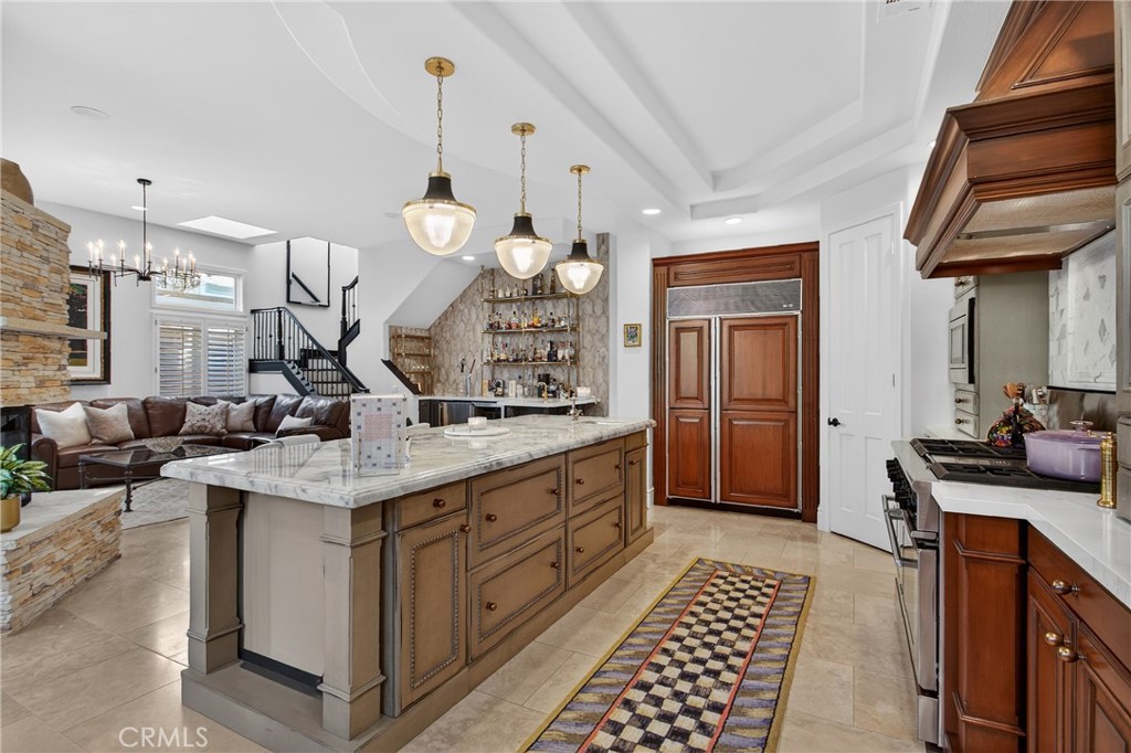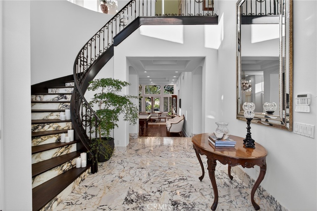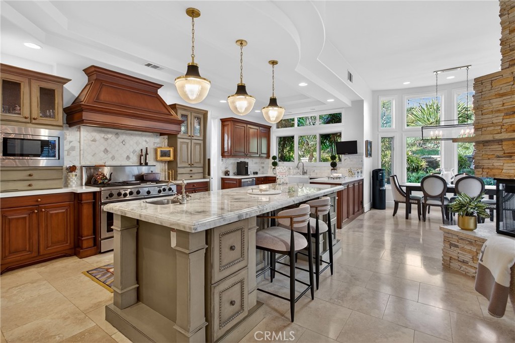Tremendous opportunity to own one of the best homes to ever hit the market in prestigious Bear Brand Ocean Ranch! Owned by a custom builder, no expense has been spared in upgrades! Meticulously upgraded throughout, this 5-bedroom, 5 ½ bath estate spans approximately 4,200 square feet on a generous 9,360 square foot lot. This property is a showcase of thoughtful design and execution at every turn. Upon entry, a dramatic custom Calacatta Viola marble foyer is complemented by a luxurious staircase with gorgeous wrought iron that sets the tone for the home’s elevated aesthetic. The living room boasts walnut-stained oak hardwood flooring. The adjacent oversized kitchen features custom wood cabinets and center island with Cristallo quartzite countertop, 6-burner professional range and griddle, Bosch dishwasher, Sub-Zero 48” refrigerator with custom wood panel front, Kohler Apron-front sink, walk in pantry and much more! The kitchen is open to a great room and breakfast nook separated by a stacked stone, 3-way fireplace. A sophisticated custom wood bar featuring brass bistro shelving, a Viking wine refrigerator, and a Marvel dual-tap kegerator completes the space. Even the adjacent powder room impresses, finished in honed marble with a fully integrated custom sink, Rohl fixtures, and designer agate and glass tile accents. A main-level bedroom offers added flexibility, complete with an en-suite bath, custom upgrades and a walnut vanity. Throughout the home, designer millwork, decorative wood beams, and curated Restoration Hardware lighting create a sense of understated elegance. Upstairs, the primary suite is complemented by a limestone fireplace and a beautifully modified closet with bespoke cabinetry. The primary bath features Rohl fixtures and an oversized freestanding soaking tub with heated back. Two additional bedrooms, each with their own bathroom, frame an office which could also be a bonus room. All bathrooms throughout the home reflect the same level of craftsmanship, including honed marble flooring, integrated marble vanities, Carrara marble showers, handmade tilework, and artisan finishes. A brand-new tankless water heater ensures modern efficiency. Just moments from Salt Creek Beach, the Ritz-Carlton Laguna Niguel, Waldorf Astoria Monarch Beach, and Dana Point Harbor, this is more than a home — it is a masterfully curated coastal statement in one of South Orange County’s most coveted guard-gated communities. A truly “must-see” property.