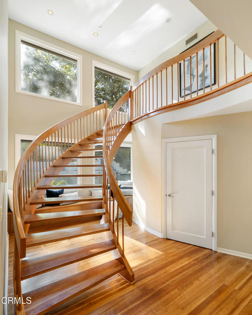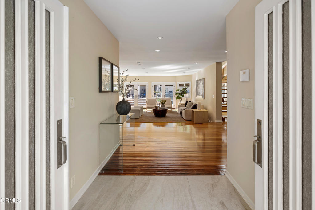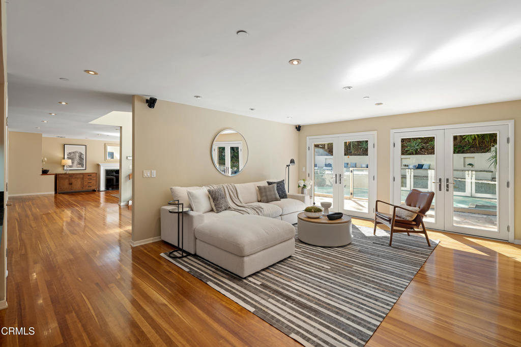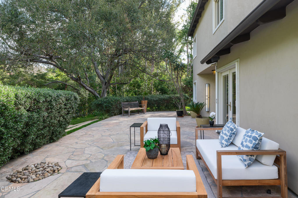 This sophisticated estate with contemporary flair offers a stunning guest house and is gracefully set on a quiet, tree-lined street in Pasadena's coveted Langham area. Exuding timeless elegance, the home has been thoughtfully curated with exquisite finishes and artisanal craftsmanship, offering a lifestyle defined by beauty, comfort, and effortless indoor-outdoor living. From the moment of arrival, a serene California sensibility unfolds, where light, nature, and luxury exist in perfect harmony.Situated on nearly half an acre of manicured grounds, the residence features four bedrooms, four bathrooms, a private office, and a guest house. The grand living room is a captivating showpiece, anchored by a dramatic fireplace and framed by elegant French doors that open to an enchanting outdoor sanctuary. The verdant backyard reveals a resort-like setting with a shimmering swimming pool, spa, and cascading water feature flowing through a natural stone bed, creating a tranquil and magical atmosphere.The sun-drenched family room continues the seamless connection to the outdoors with direct access to the pool and gardens. A custom-built office offers a refined space for work or reflection. At the heart of the home, the chef's kitchen is an entertainer's dream, featuring an expansive island, Sub-Zero and premium stainless-steel appliances, and bespoke cabinetry. A powder room, laundry room, and inviting main-level suite with pool access complete the first floor. Recent updates include fresh interior and exterior paint, revarnished wood floors, and a fully resurfaced swimming pool.Upstairs, the primary suite is a private sanctuary with a sitting area, French doors opening to a balcony overlooking the grounds, and a spa-inspired bath. Two generously sized guest bedrooms and a full bathroom complete the upper level.Outdoors, the exceptional grounds include a spectacular guest house with soaring ceilings, French doors, kitchenette, and bath. Mature trees, multiple seating areas, a gazebo with barbecue, and limestone pathways create a peaceful retreat. A three-car garage and ample additional parking complete this truly remarkable property.