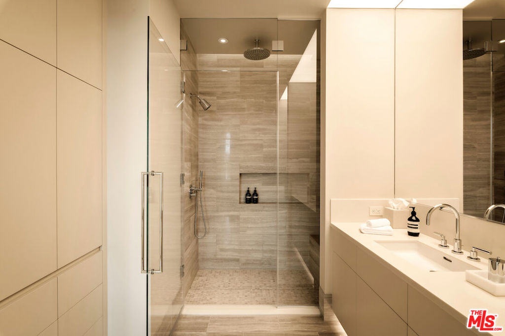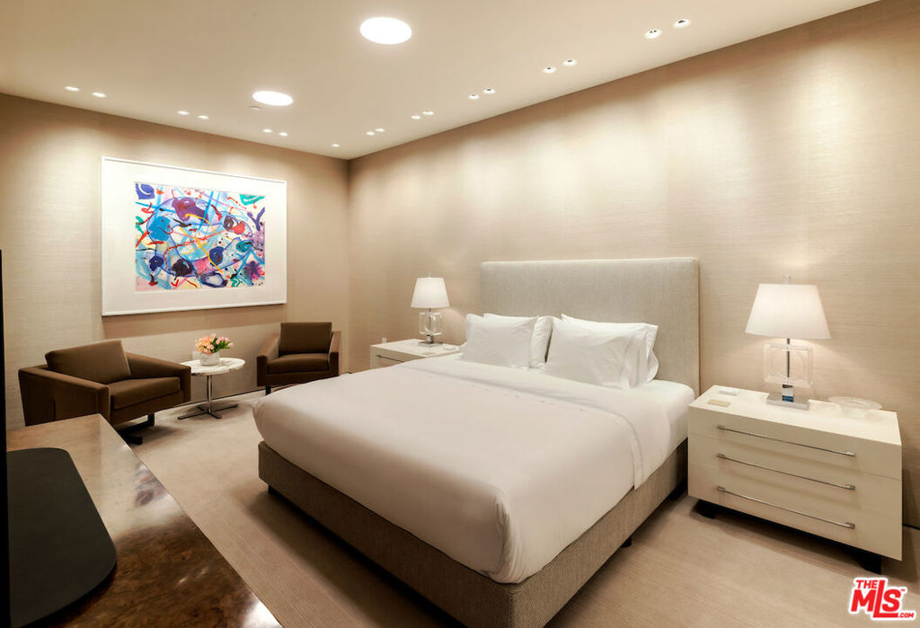 Designed as an art piece from the exterior and an art showcase from the interior, Unit 5A stands alone within the newly constructed and highly coveted 8899 Beverly. Envisioned by famed architecture firm Olson Kundig, the striking building follows the group's emphasis on craftspeople and individual artists to make each property unique, ultimately telling an authentic story reflective of a project's locale. Thoughtfully influenced by Los Angeles, the complex has reimagined the mid-century design of the original property while creating iconic residences that will timelessly reflect the surrounding neighborhood. Spanning nearly 3,200 square feet in the sky, Unit 5A has been meticulously enhanced with artwork in mind, decorated with neutral tones and a custom lighting system, ideal for showcasing a personal art collection or hosting a gallery presentation. Swiss-made Victrocsa sliding glass walls not only allow for access to the various terraces with stunning views of the Hollywood Hills but also allow natural light to flood the space. Just in case, Lutron smart-system shades in white wrap the entire corner residence, allowing for the optimal amount of natural light at all times. Eleven-foot high ceilings and imported wood floors flow throughout the residence and into the open, yet flexible, entertainment area encompassing the main living and dining areas. Adjacent to the main entertainment area is the high-design kitchen, notably furnished with white oak cabinets and Calacatta Gold marble surfaces, which pair beautifully with the top-shelf appliance suite, featuring Sub-Zero, Miele, and Gaggenau. Featuring a primary suite and secondary bedroom, each has been remastered to include an elevated level of finishes. Within the primary suite, custom white oak millwork and linen curtains adorn the bedroom, travertine stone defines the spacious bathroom, and dual custom closets provide chic wardrobe storage. The secondary bedroom features custom integrated closets and a modern ensuite bath with sleek Corian countertops, while a versatile flex room wrapped in sisal with plush wool carpeting provides a cozy retreat for a media room, office, or third bedroom with its own ensuite bath. Rounding out this exceptional residence is a private two-car auto stable with gunmetal brick floors and white oak wood panels, a laundry room, and a practical powder room. In a rare offering for luxury condominium living in Los Angeles, the residence also includes two additional valet parking spaces providing an extraordinary total of four dedicated parking spaces, an unparalleled convenience for hosting and everyday living alike. Resident benefits include 24-hour lobby staff, luxury concierge, and a fully equipped fitness center with private studio space. Outdoor seating, fireplaces, and an outdoor kitchen allow for enjoyment of the lushly landscaped retreat by Coen + Partners, reflected in the resort-style pool and oversized spa. Additionally, just steps away from the building are some of Los Angeles' finest fashion boutiques, art galleries, gourmet markets, and highest-rated restaurants.Completing this remarkable offering, Unit 5A is available fully furnished, presenting a rare opportunity to step into a meticulously curated living experience where every detail from furniture to finishes has been considered and executed to the highest standard.