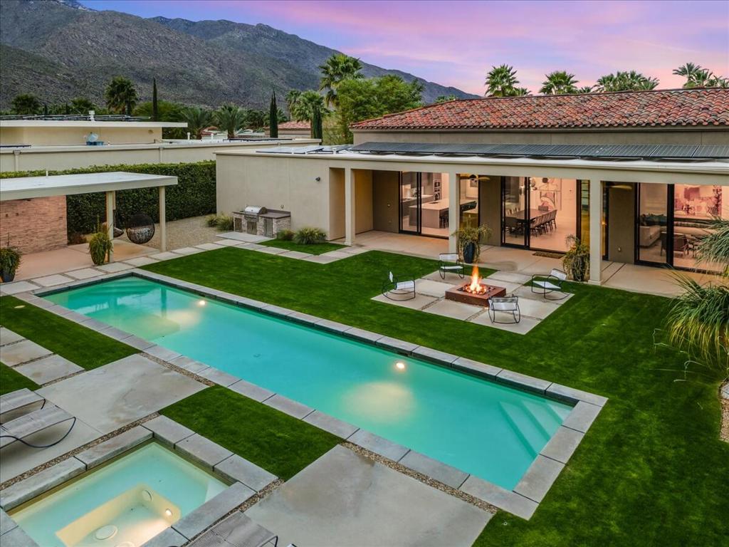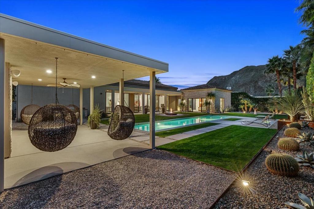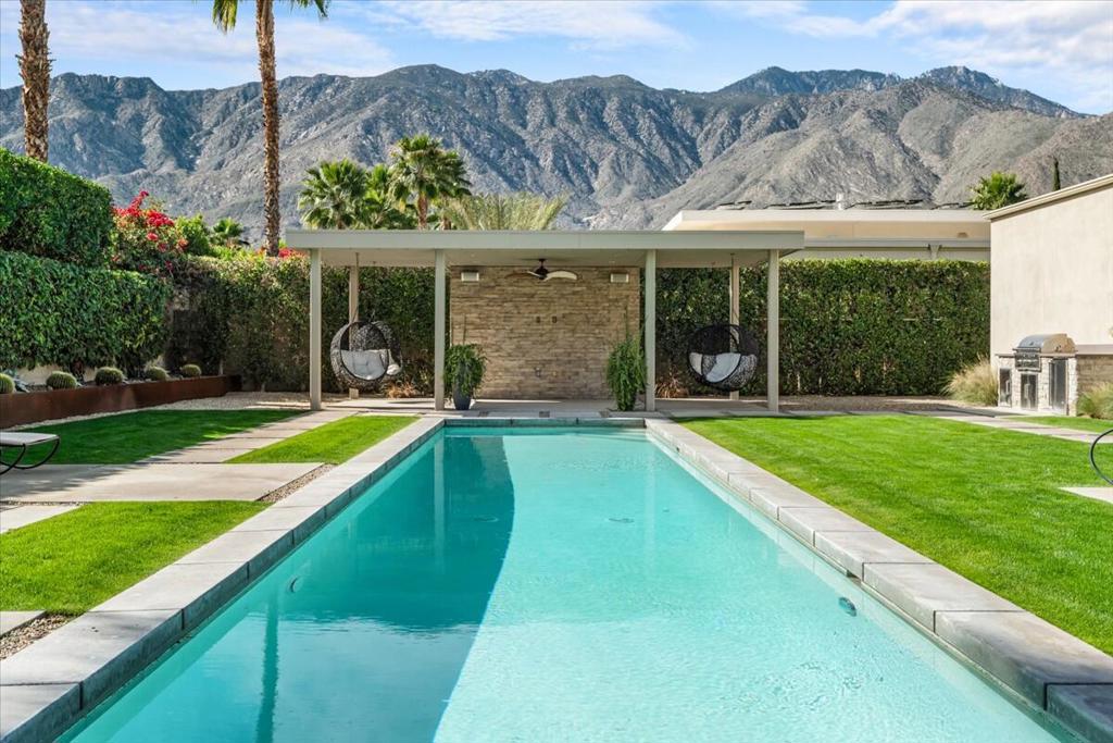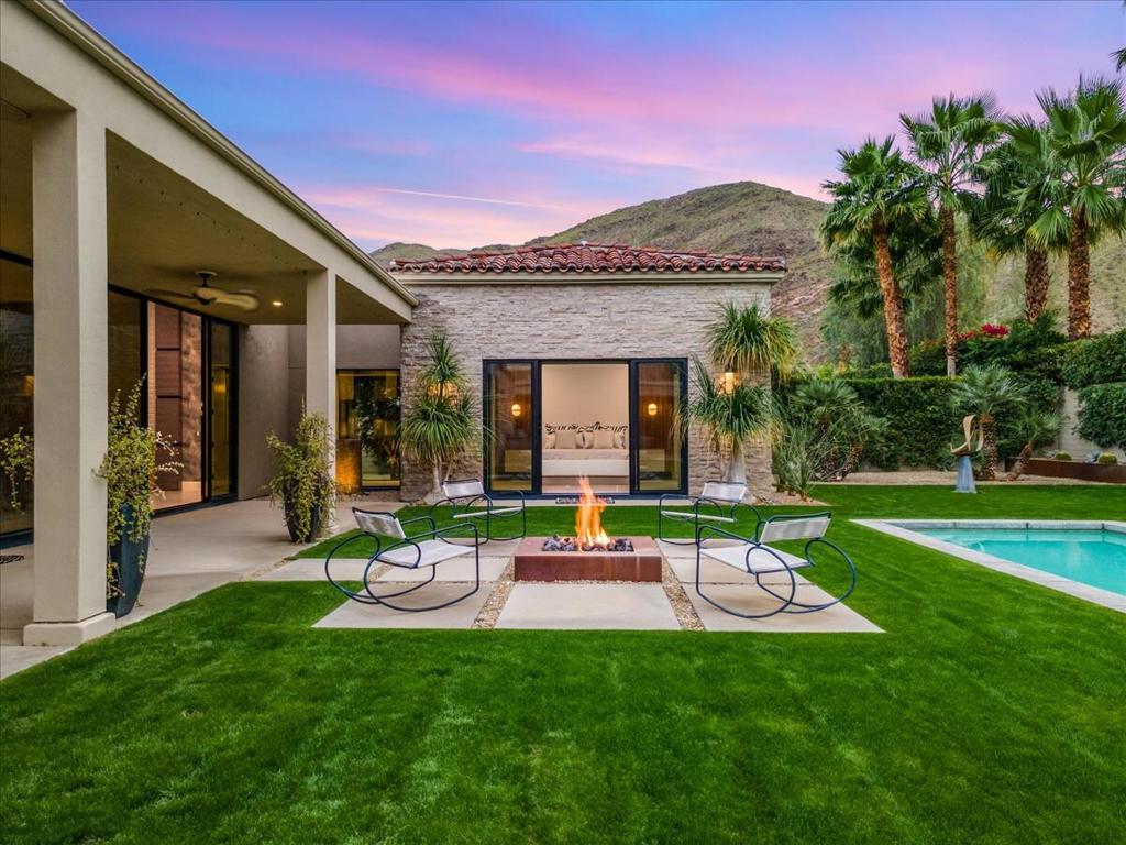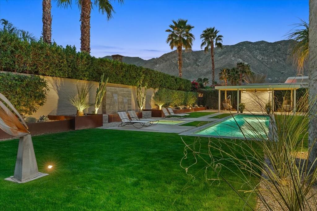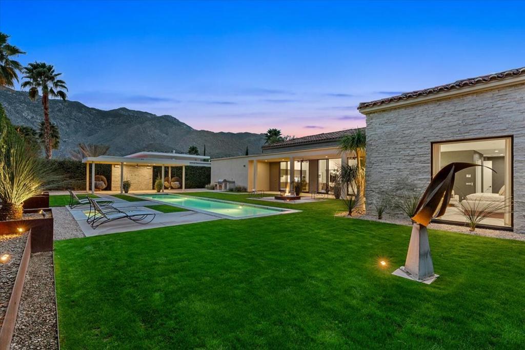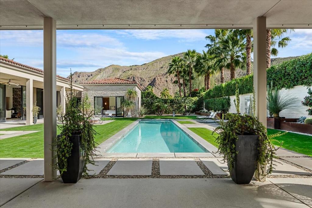 Designed by celebrated architect, Anthony Poon, this 2013 luxury estate is perfectly situated on a ⅓ of an acre and is surrounded by southern, western and eastern mountain views from inside and outside of the home. Located in south Palm Springs in the prestigious guard gated development of Monte Sereno, this brilliant home with a south facing resort backyard, was built for the quintessential Palm Springs lifestyle. The great room with towering ceilings and 3 sets of Fleetwood glass doors, open to the breathtaking sanctuary for a seamless indoor/outdoor entertaining flow! Step outside to a swimmer's pool, spa, firepit, grand water feature, misting system, expansive covered patio, cabana, built-in bbq, views and lush green landscaping! The timeless Epicurean kitchen includes dual islands with stainless appliances and two separate beverage coolers. This very desirable Modern Villa plan has a lavish primary suite which includes direct access to the backyard, large walk-in closet with dual entry, sophisticated built-ins and electric blinds. The spa bathroom has a two person shower with dual shower fixtures, separate stand alone soaking tub and a picturesque window. The two other suites are strategically separated away from the primary suite. For a movie night at home, the separate media room can accommodate a group of friends comfortably. There is an oversized **4 CAR GARAGE** with additional built-ins for storage, a 2nd refrigerator, and two electric storage lifts for even more storage! This energy efficient home has a 40 PANEL OWNED and FULLY PAID SOLAR SYSTEM and 2 TESLA BATTERIES. Located on fee land (land that you own). May be sold furnished including the art!