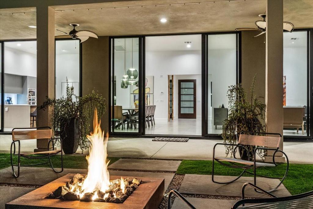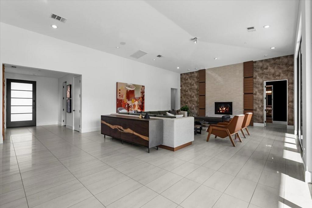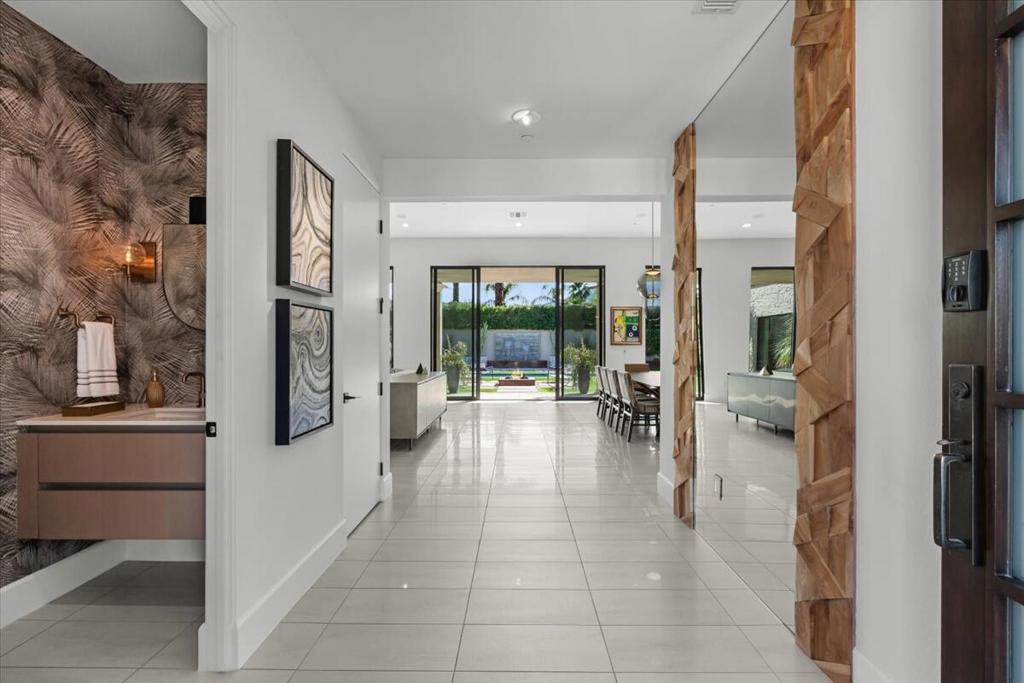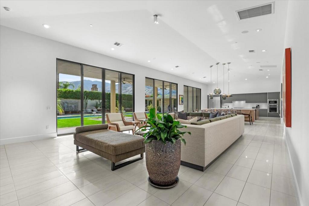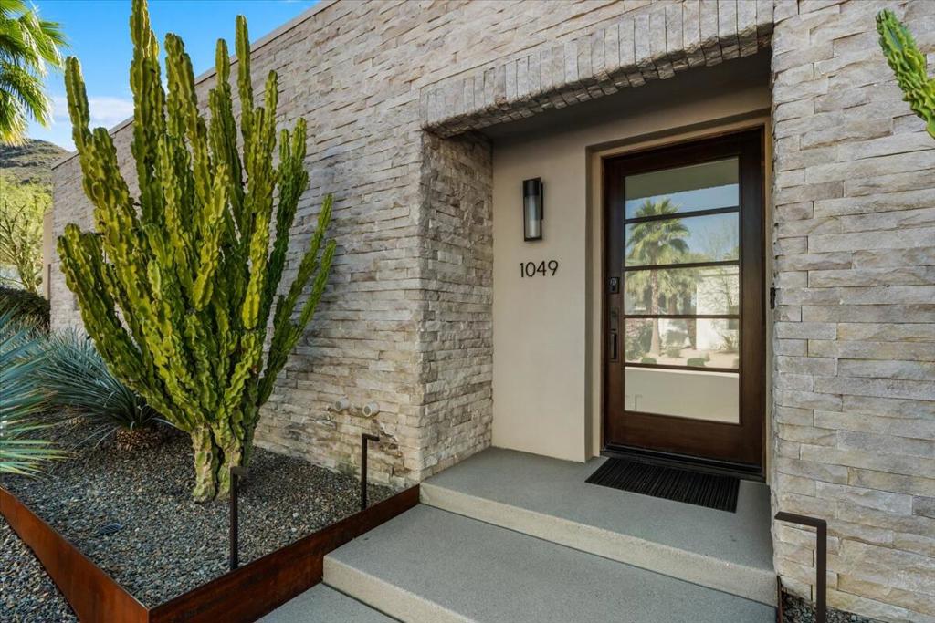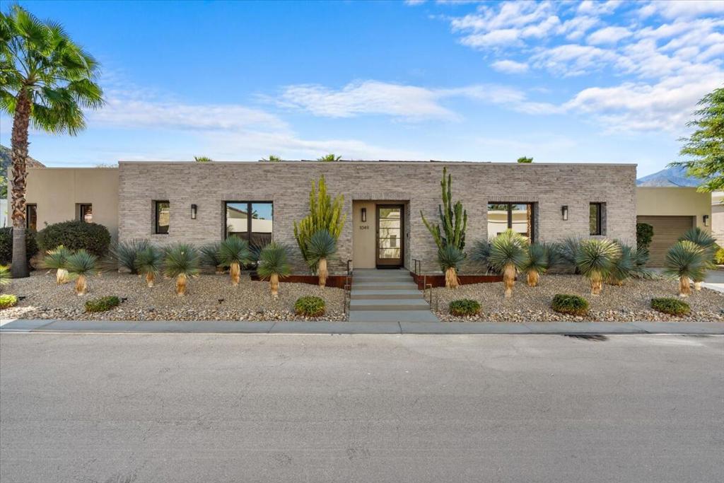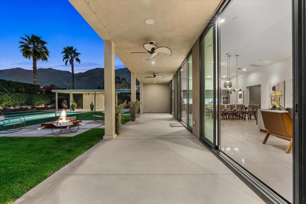 Designed by celebrated architect, Anthony Poon, this 2013 luxury estate is perfectly situated on a ⅓ of an acre and is surrounded by southern, western and eastern mountain views from inside and outside of the home. Located in south Palm Springs in the prestigious guard gated development of Monte Sereno, this brilliant home with a south facing resort backyard, was built for the quintessential Palm Springs lifestyle. The great room with towering ceilings and 3 sets of Fleetwood glass doors, open to the breathtaking sanctuary for a seamless indoor/outdoor entertaining flow! Step outside to a swimmer's pool, spa, firepit, grand water feature, misting system, expansive covered patio, cabana, built-in bbq, views and lush green landscaping! The timeless Epicurean kitchen includes dual islands with stainless appliances and two separate beverage coolers. This very desirable Modern Villa plan has a lavish primary suite which includes direct access to the backyard, large walk-in closet with dual entry, sophisticated built-ins and electric blinds. The spa bathroom has a two person shower with dual shower fixtures, separate stand alone soaking tub and a picturesque window. The two other suites are strategically separated away from the primary suite. For a movie night at home, the separate media room can accommodate a group of friends comfortably. There is an oversized **4 CAR GARAGE** with additional built-ins for storage, a 2nd refrigerator, and two electric storage lifts for even more storage! This energy efficient home has a 40 PANEL OWNED and FULLY PAID SOLAR SYSTEM and 2 TESLA BATTERIES. Located on fee land (land that you own). May be sold furnished including the art!