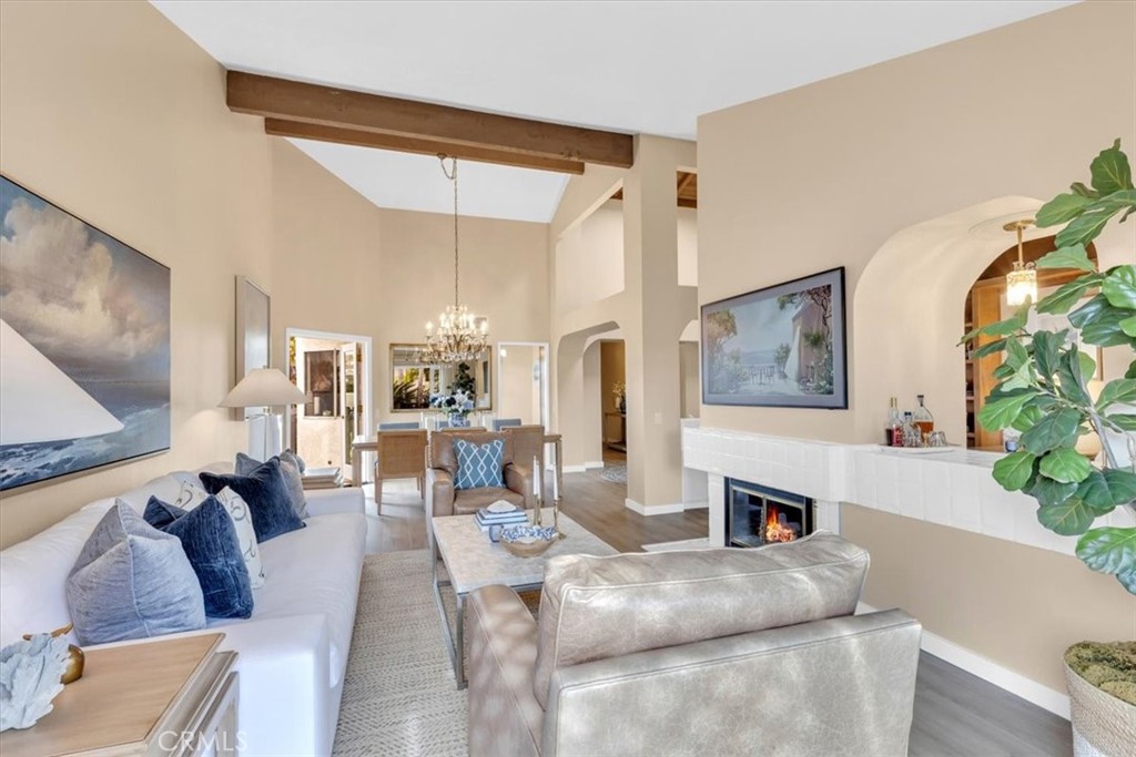 Tucked away in the Villas of Niguel Shores, this tranquil coastal hideaway offers the perfect blend of luxury and serenity. Enter through a charming wrought iron gate into a lush, private courtyard adorned with tropical landscaping and a brick patio. At its heart, a clover-shaped spool with a pergola offering shaded seating, ideal for relaxing or entertaining.A grand wooden door opens into a spacious foyer with blonde wood floors and cathedral ceilings with a skylight flooding the entry with natural light. To the right, a gourmet kitchen boasts granite countertops, built-in refrigerator, dishwasher, oven, and a generous island with electric cooktop and storage. French doors connect the kitchen to the courtyard and spool—perfect for indoor-outdoor living.Through a pocket door, is the formal dining room featuring a chandelier and French doors opening to a secluded side yard. Adjacent, the elegant living room centers around a sleek gas fireplace with white tile surround creating a warm and relaxing gathering space. French doors open to the back patio, where tropical landscaping, covered deck, and a gas fire pit enhance the coastal ambiance.A partial wall divides the living room from a cozy inglenook with a two-sided fireplace, built-in chestnut shelving. There are additional french doors in the nook to the outdoors, inviting in the ocean breeze.Down the hall, the secondary bedroom includes mirrored closet doors, private entry from the courtyard, and continuous blonde wood flooring. The adjacent guest bath features a tub/shower combo, long counter, and dedicated vanity space.At the end of the hall, the primary suite impresses with a dramatic mirrored accent wall and French doors to the patio. A sliding barn door reveals the ensuite bath with dual sinks, vanity area, and three mirrored closets. A separate door leads to a large soaking tub/shower.Situated on a desirable corner lot, this home enjoys the resort-style amenities of Niguel Shores, including a private ocean bluff with beach access, pickleball and tennis courts, bocce ball, pool and spa, playgrounds, and clubhouse.Steps outside the community are two 5 star resorts within walking distance, Salt Creek Beach, and Downtown Dana Point and Harbor.