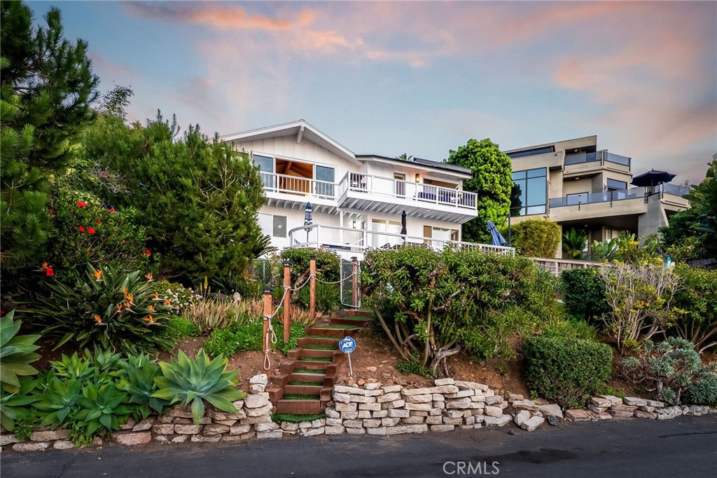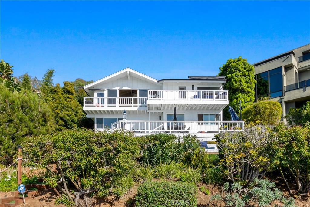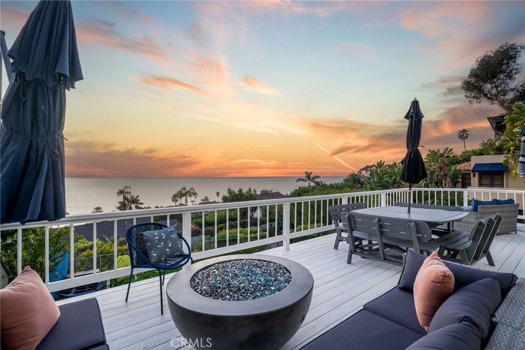 Welcome to 31331 Holly Drive, with seeping 180-degree ocean views, this rare street-to-street South Laguna residence captures the coastline, open Pacific, and unforgettable Catalina Island sunsets from a truly front-row setting. Enter from Holly Drive and exit to Brooks Street below, just minutes from the sand at West Street Beach, a location that perfectly blends privacy, walkability, and iconic scenery. This fully renovated coastal modern spans two levels cascading toward the Pacific, with sweeping ocean views and golden sunsets from nearly every room. Vaulted natural wood ceilings, a fireplace, wide-plank oak floors, and full-wall glass sliders blur the line between indoors and out, opening to a spacious ocean-view deck with fire pit. Front row for Catalina Island sunsets year round. The designer kitchen features a dolomite island, dark shaker cabinetry, and farmhouse sink. The primary suite enjoys its own private ocean-view deck, while the lower level offers two generous bedrooms, two full baths, and an expansive entertaining deck with fire pit. A dedicated studio with glass slider entry, outdoor shower, covered front porch, and detached two-car garage complete the home. Multiple outdoor living zones, endless Pacific views, and one of Laguna's most coveted stretches of coast.
