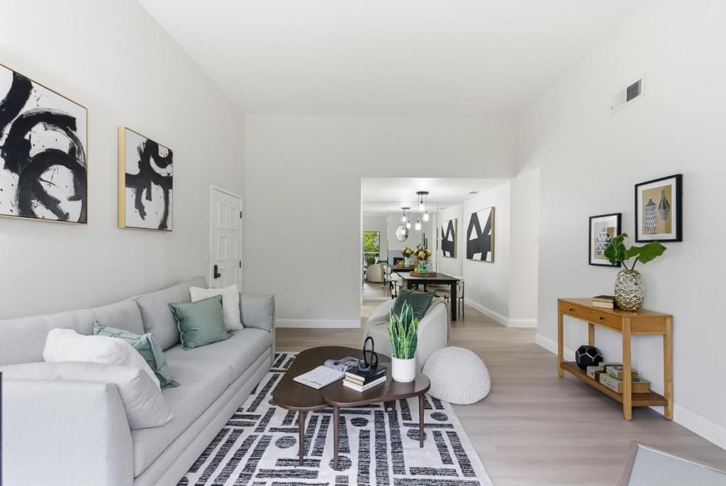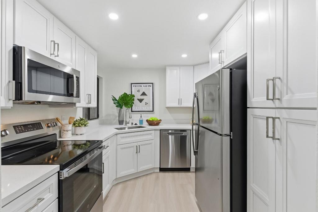 Welcome to this beautifully updated end unit in Hamilton Place where high ceilings & modern finishes create an inviting, contemporary feel. The home features new laminate flooring, fresh paint throughout & stunning quartz countertops in the kitchen and bathrooms. The kitchen offers a sleek, modern design with recessed lighting, new cabinetry, stainless steel appliances, and a space saving microwave above the range. Both bathrooms are upgraded with spa like rainfall showerheads and the master includes a handheld wand for a luxurious experience. The spacious primary suite includes a generous walk-in closet, while the in-unit laundry & central A/C add everyday comfort & convenience. Enjoy peaceful moments on your private balcony overlooking the bright, lush greenbelt. Hamilton Place is known for its prime central location just minutes from eBay, the Pruneyard, light rail station & major highways including 880, 17, & 85 . Shopping, dining, & outdoor recreation are all nearby, with Los Gatos Creek Trail, Trader Joes, Whole Foods, & community pools within easy reach. After a day of activities, you will appreciate the convenience of your own garage and carport, located right across from each other. Don't miss the opportunity to own this beautifully updated home in a fantastic location!