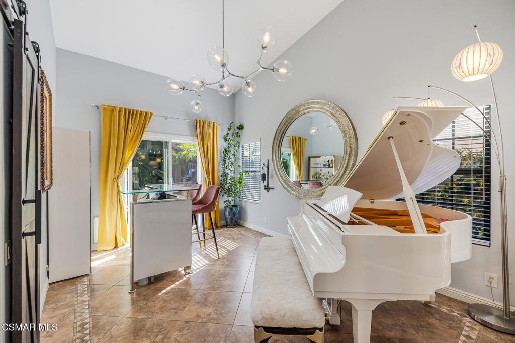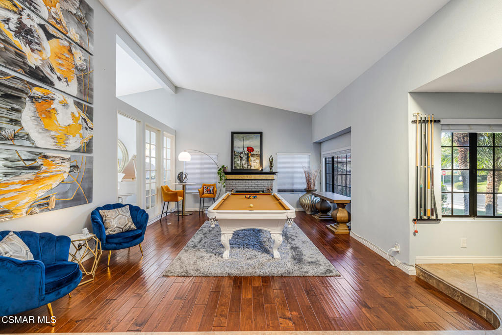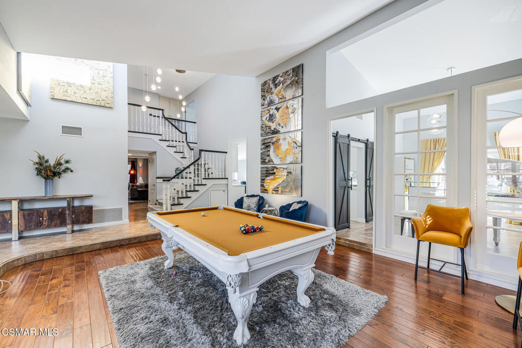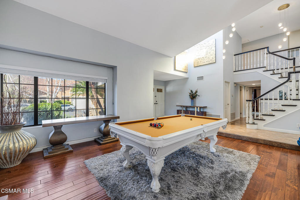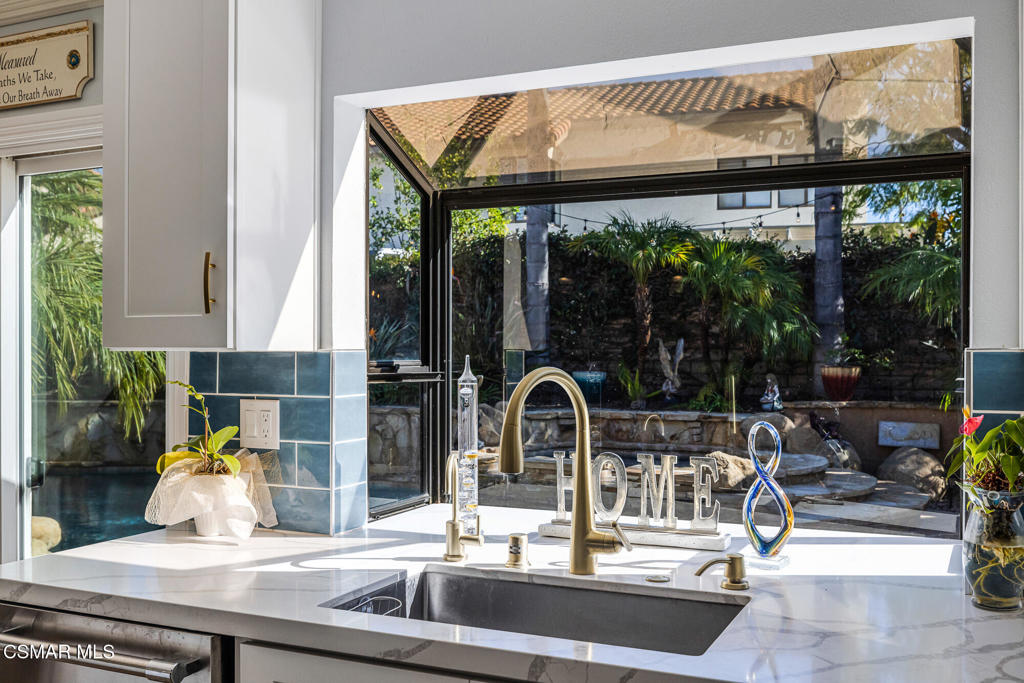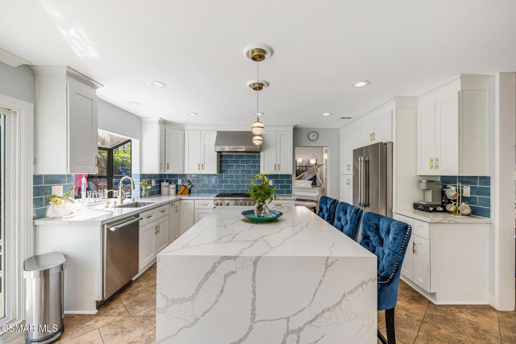 Discover this beautifully appointed 5-bedroom, 3-bath ''resort style'' pool home with over 3,000 square feet of well-designed living space, nestled within the desirable Buttercreek/Mountain Meadows community. From the moment you step through the double door entry, you'll appreciate the thoughtful layout, soaring ceilings and seamless flow between formal and casual spaces. Rich wood-like flooring anchors the main living areas, while expansive windows fill the home with natural light. The remodeled gourmet kitchen is the true centerpiece, featuring quartz countertops, a dramatic waterfall-edge island, and soft-close custom cabinetry. The Thermador stainless steel appliances are every chef's dream including a 4-burner stove top with large griddle surface. The kitchen is perfectly positioned, open to the family room and adjacent to the formal dining room for effortless entertaining. Whether hosting holidays or enjoying everyday meals at the breakfast counter, this home was designed for gathering. The flexible floor plan includes a main-level bedroom and full bath, ideal for guests or multigenerational living. Upstairs, retreat to the spacious primary suite that is flooded with light, complete with a private sitting area, grand walk-in closet and spa-inspired bathroom to complete your sanctuary. Custom built-out closets throughout the generous sized upstairs rooms provide exceptional organization and storage. Step outside to your private backyard oasis featuring a sparkling in-ground pool with a baja shelf and inviting spa, or relax under the pergola with the electric fireplace glowing while you watch the game late into the evening. Making this your new address will feel like living in a 5-Star hotel and all you have to do is step out the sliding glass door. With a 3-car attached garage, individual laundry room, central air and heat, and access to HOA amenities (including a community pool), this home offers both luxury and convenience. Beautifully appointed, well laid out, and move-in ready this is Moorpark living at its finest.