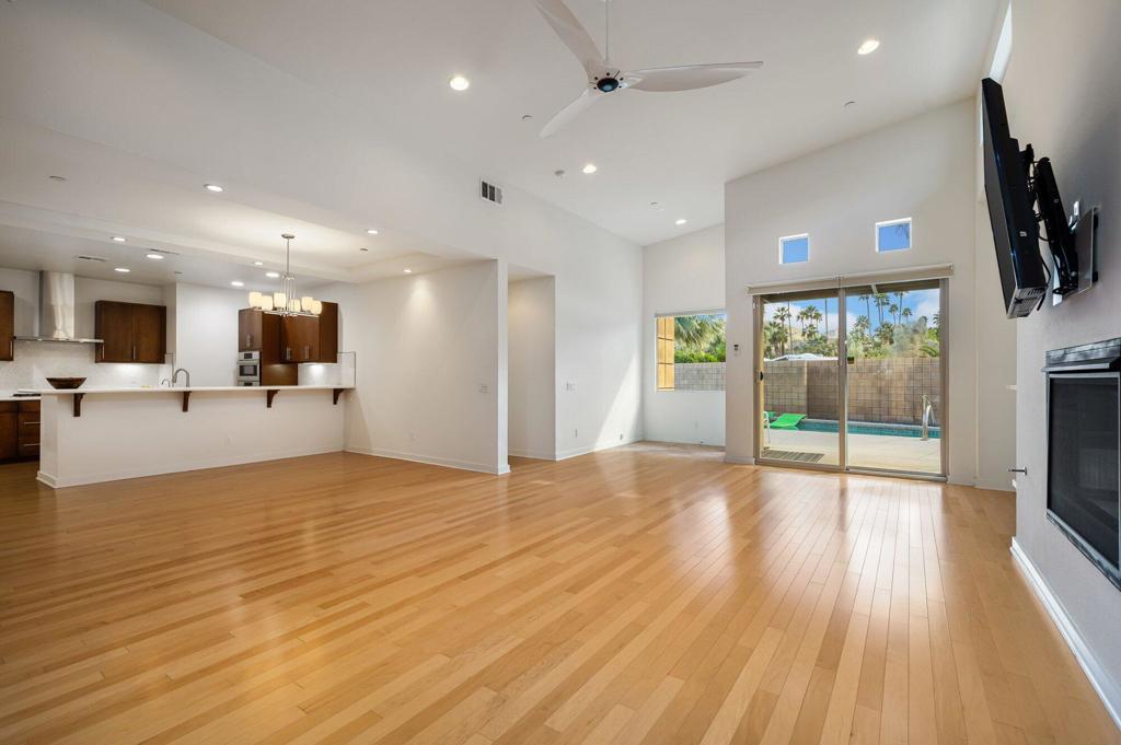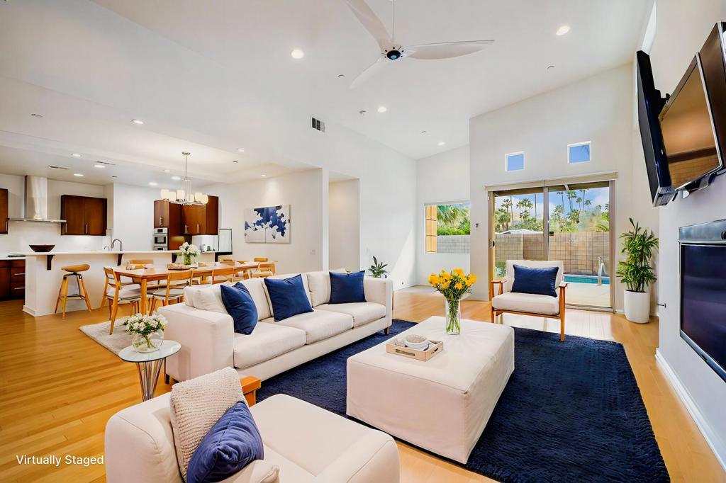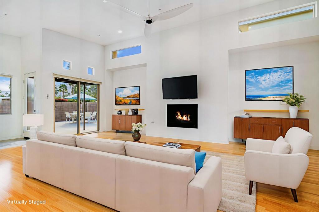 Bordering the iconic Twin Palms neighborhood in Palm Springs, this is a rare offering within the boutique Oceo community--where only nine single-family homes exist. Designed by renowned architect Jim Cioffi, AIA, this home sits on an expansive lot that stretches from Oceo Circle South to Twin Palms Drive--an uncommon footprint that creates exceptional space and separation between neighbors. The primary views overlook the established, single-story homes of Twin Palms, enhancing both privacy and architectural charm.A marble and French limestone entry sets a sophisticated tone, opening to a dramatic great room defined by soaring ceilings, clerestory windows, warm wood floors, and expansive sliding glass doors. The seamless indoor-outdoor flow is quintessential Palm Springs--anchored by a south-facing, professionally restored saltwater pool and spa that enjoy sun all day long. Panoramic San Jacinto Mountain views frame the backdrop, while a generous wraparound patio invites effortless outdoor entertaining.The main-level primary suite is a private retreat with direct pool access and stunning mountain views. Its marble-clad bath features a sunken soaking tub, oversized walk-in shower with dual shower heads, dual vanities, custom cabinetry, and a spacious walk-in closet. Also on the main level: a dedicated dining area with wet bar, a sleek modern kitchen equipped with BOSCH built-in microwave and oven, BOSCH lighted vent hood, five-burner gas cooktop, oversized KitchenAid refrigerator, pantry, powder room, and a separate laundry room with sink. A gas fireplace with logs adds warmth and ambiance to the living space.Upstairs, two junior ensuite bedrooms offer high ceilings, private baths, and expansive views. One suite features a sitting area, large walk-in closet, and access to a south-facing sun deck showcasing sweeping 180-degree vistas of Twin Palms' celebrated mid-century architecture and surrounding mountains.Built in 2015 and lovingly maintained by its original owner--never rented--this home blends modern efficiency with timeless design. Features include owned solar, dual-zoned Carrier HVAC, a Bradford White 75-gallon water heater, Hague Watermax filtration system, custom Hunter Douglas blinds, authentic Big Ass Fans throughout, wood flooring, and an attached two-car garage. Approximately $20,000 in thoughtful upgrades further elevate the home's comfort and style. Low HOA's of $312/mo.