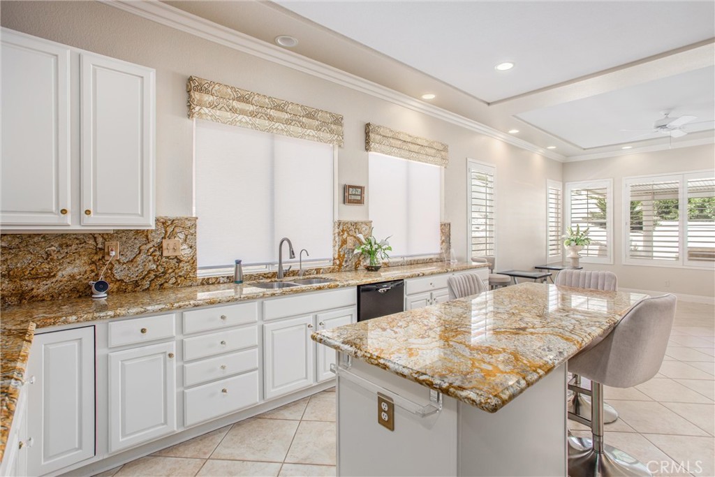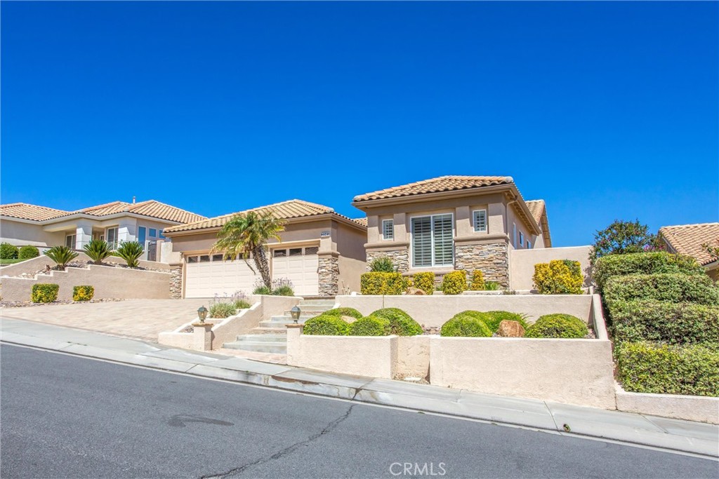 Welcome to this stunning Wisteria model located in the highly sought-after Sun Lakes Country Club, a premier 55+ resort-style community offering abundant amenities. This is the largest single-story floor plan in Sun Lakes, featuring 2 bedrooms, a den/office, and 3 bathrooms. The open-concept layout is enhanced by natural light and sweeping views of majestic San Gorgonio Mountain, creating a warm, airy atmosphere. Enjoy a private backyard oasis with a built-in BBQ, as well as a spacious front porch perfect for relaxing. The kitchen offers generous counter space, granite countertops and ample cabinetry, ideal for both everyday living and entertaining. The primary suite is a true retreat with upgraded plantation shutters, and a luxurious bathroom featuring a soaking tub, walk-in shower, dual sinks, and a large walk-in closet. A thoughtfully placed guest bedroom and full bath provide comfort and privacy for visitors. ALL FURNITURE AVAILABLE. Additional features include: 3-car garage Fully equipped laundry room with sink and extra storage Access to world-class community amenities: 2 golf courses, multiple pools and spas, pickleball and tennis courts, ballrooms, billiards, fitness center, library, and restaurants. All of this just minutes from Morongo Casino, Cabazon Outlets, and Palm Springs. Schedule your private showing today!