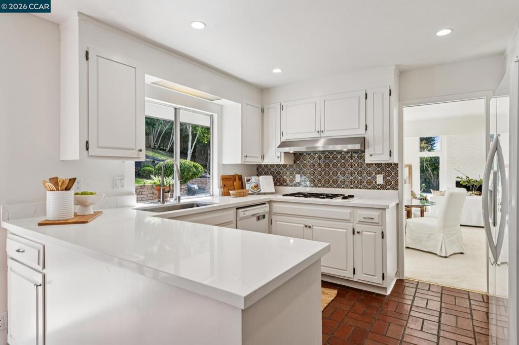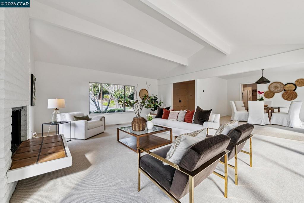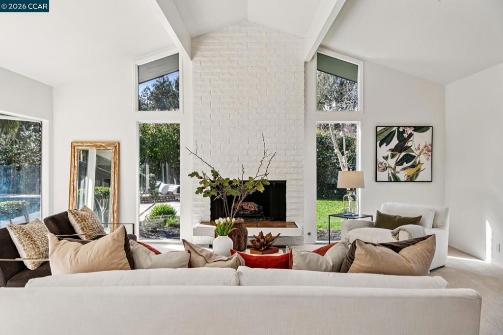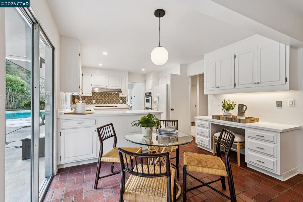 Located on a wide, tree-lined street in the coveted Orinda Downs neighborhood, this 5-bedroom, 3.5-bath home blends privacy, flexibility, and room to live & work comfortably. The main level is designed for easy living and includes a sun-filled living room w soaring ceilings, brick fireplace, and expansive walls of glass with views of the pool, patio, and oak-covered hillside. An adjacent formal dining room flows seamlessly for gatherings both big and small. At the heart of the home, the kitchen and family room create a relaxed, social hub featuring fireplace, built-in bar, & sliding doors that open directly to the backyard, pool, & cabana—perfect for indoor-outdoor entertaining. A large laundry room offers abundant cabinetry, desk space, a convenient 1/2 bath, and easy access to the mudroom and spacious three-car garage. Upstairs, 3 spacious bedrooms share a hall bath, while a 4th bedroom features an en-suite bathroom. The private primary retreat is expansive & calming with ample closet space and a large bathroom. The backyard is a true standout: a large patio for entertaining, generous lawn for play, pool, and cabana provide ample space for both entertainment & play.