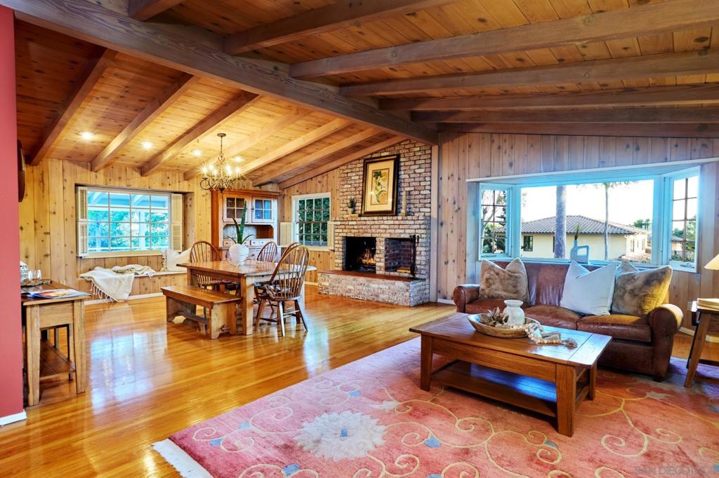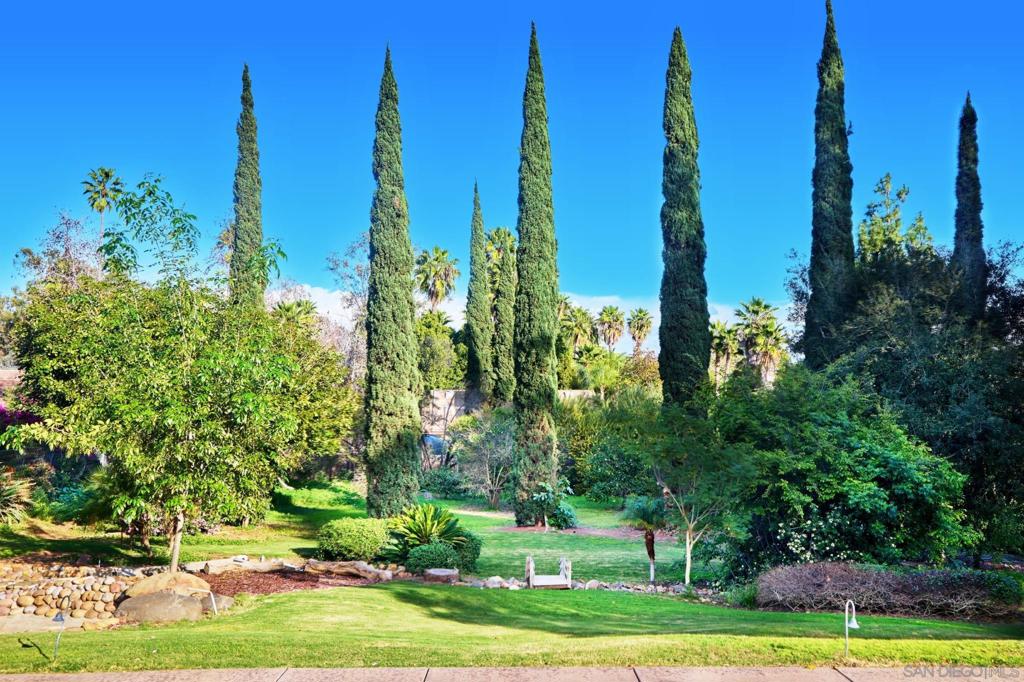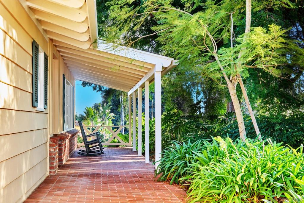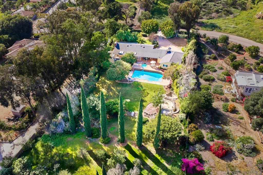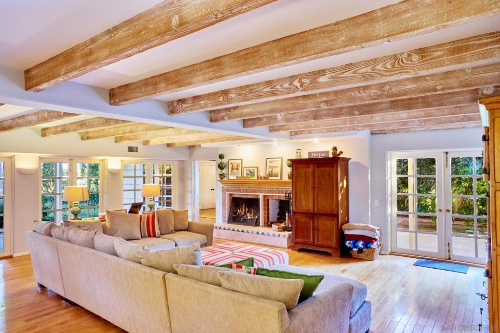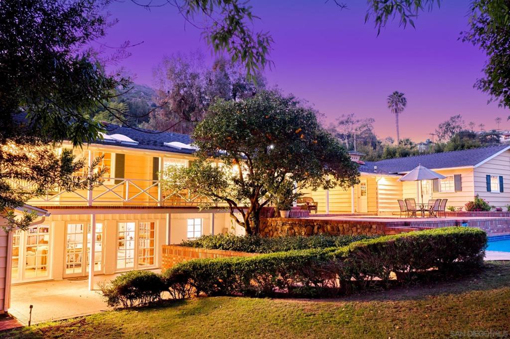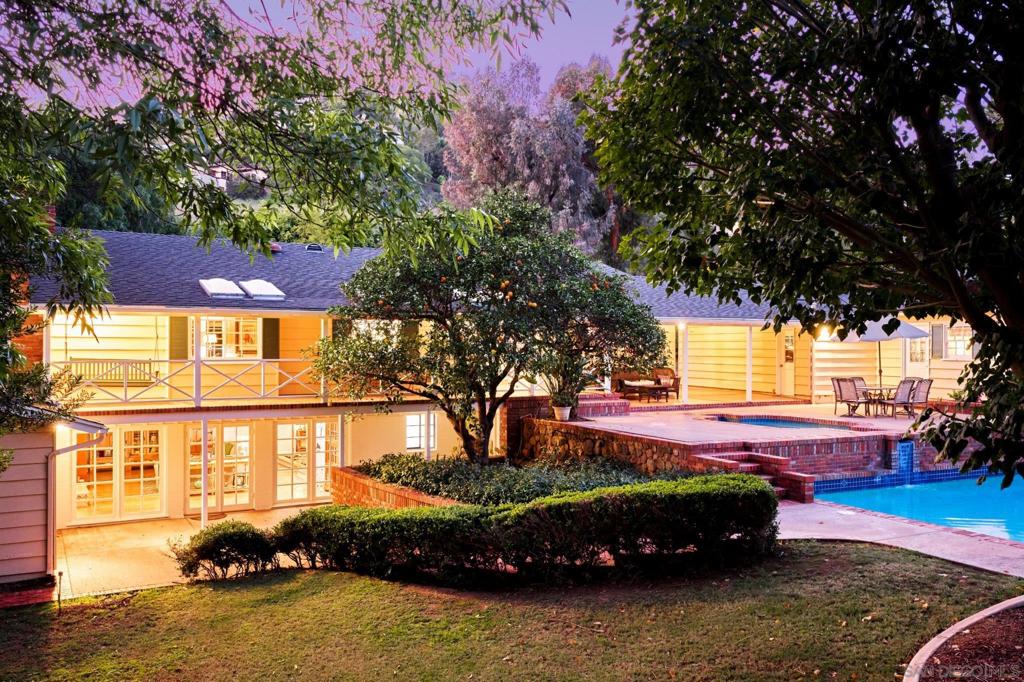 Behind verdant trees, privacy hedges & distinguished fern-green gates lies a sprawling 1950s ranch overlooking festive brick patio, swimming pool, spa & one-acre meadow of manicured lawn, flowers, citrus & towering cypress trees. Interior includes original hardwood floors in perfect condition, beamed vaulted ceilings, two hearty brick fireplaces & an abundance of natural light spilling through numerous French doors & windows. Picturesque breezeway connects the house to the 3-car garage & guest quarters.