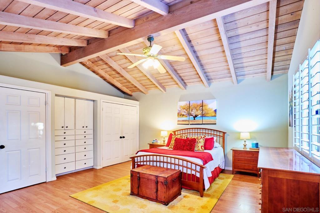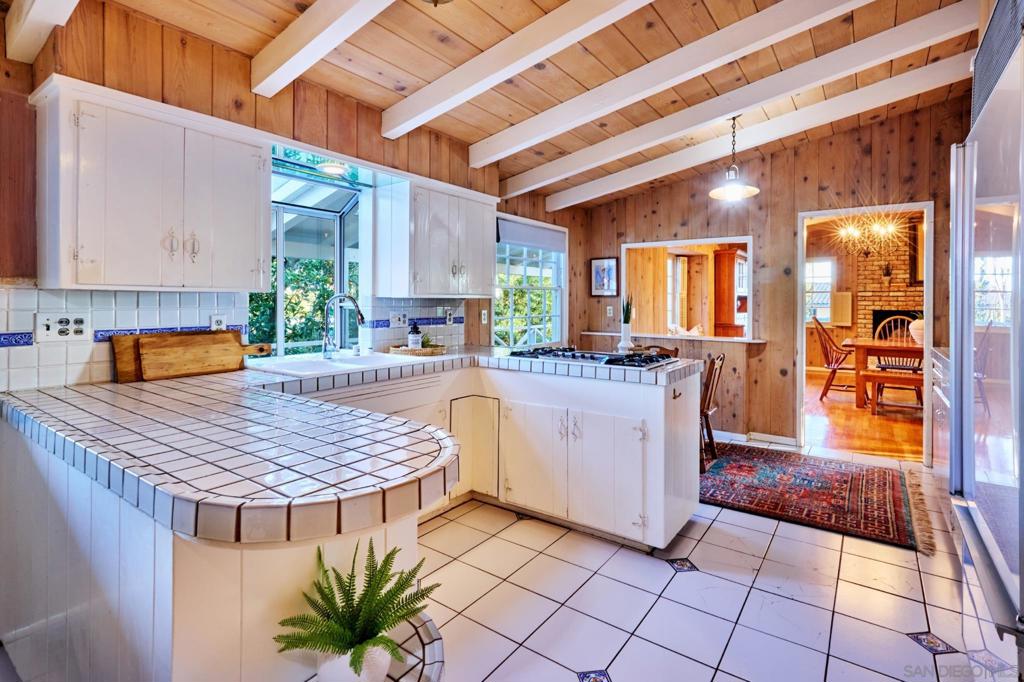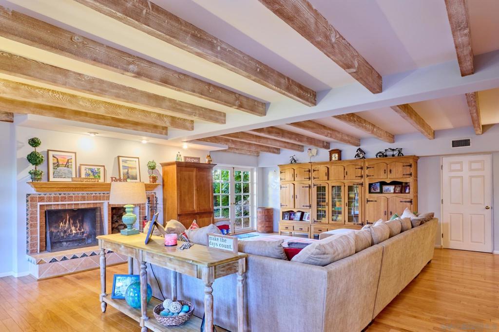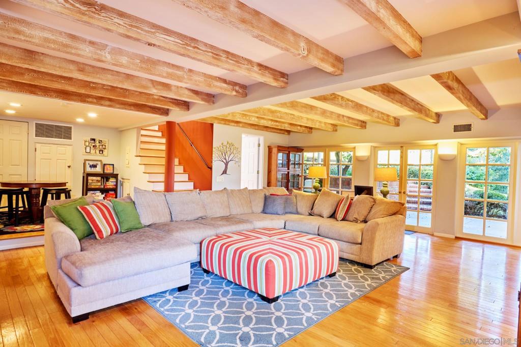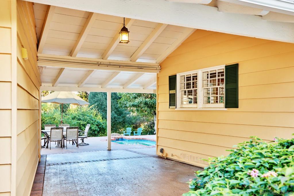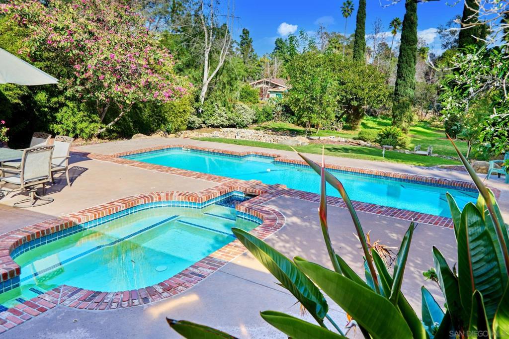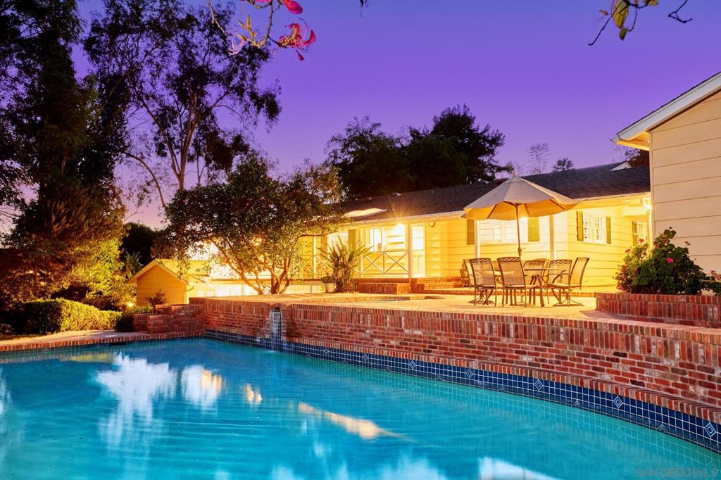 Behind verdant trees, privacy hedges & distinguished fern-green gates lies a sprawling 1950s ranch overlooking festive brick patio, swimming pool, spa & one-acre meadow of manicured lawn, flowers, citrus & towering cypress trees. Interior includes original hardwood floors in perfect condition, beamed vaulted ceilings, two hearty brick fireplaces & an abundance of natural light spilling through numerous French doors & windows. Picturesque breezeway connects the house to the 3-car garage & guest quarters.