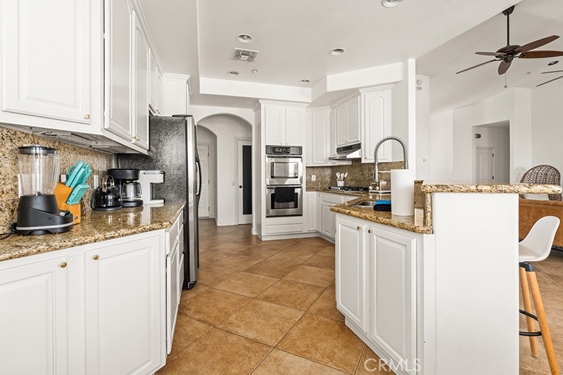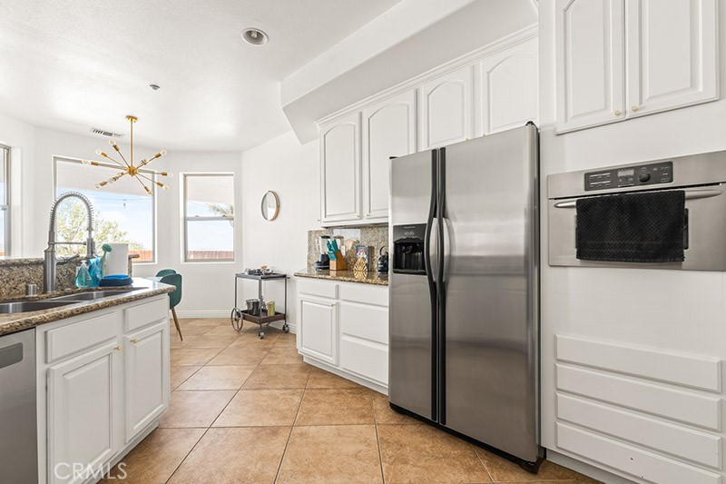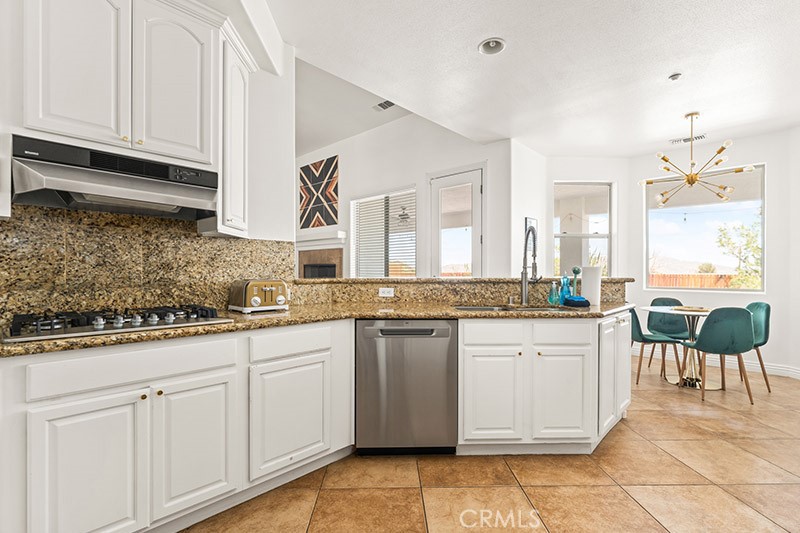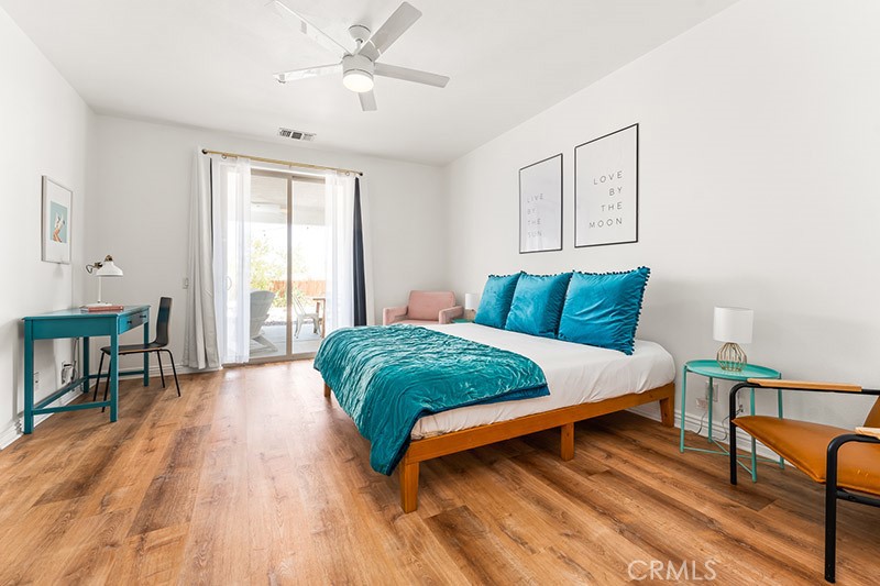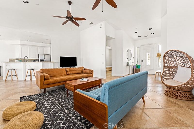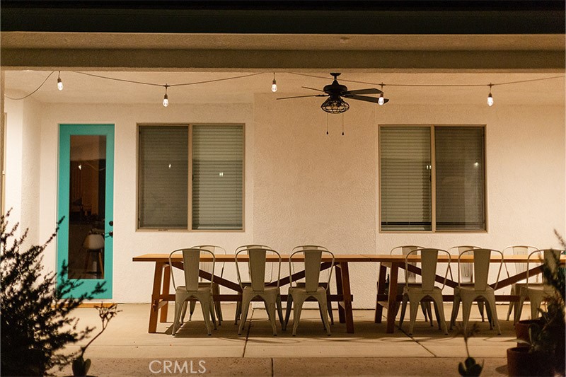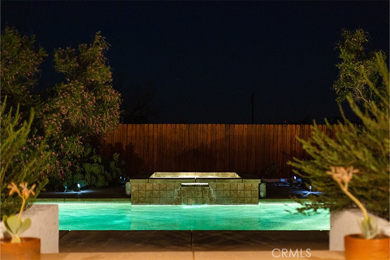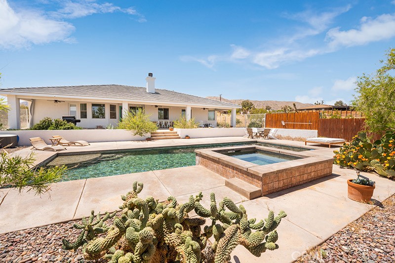 Welcome to resort style living at this gorgeous furnished mezmerizing pool home! Less than 10 minutes from the JTNP, blocks from the village, and surrounded by accessible hiking trails, this stunning modern Mediterranean home has everything you could desire. 4 bedrooms, high ceilings, an open floor plan, updated interior and perfect backyard pool oasis await you on over an acre of land. Walk thru the entry and feel inspired in this bright and stylish single level home. The family room impresses with a wood burning fireplace and open concept kitchen with a peninsula, full suite of built in stainless steel appliances, granite countertops, and an eating nook overlooking the backyard. There are two primary en suites, one featuring a massive jetted tub, separate shower, double sinks, and a walk-in closet! The home also boasts 2 more bedrooms and a full bathroom in addition to a formal dining room (currently in use as a 5th bedroom), pantry, and laundry room. The massive attached garage is easily accessed from inside of the home to make bringing in your groceries a breeze. This home was repainted inside and out including cabinets, has updated appliances and flooring (no more carpet), new electric water heater, PLUS features an owned solar system to keep your electric bill low. Drop your bags and head straight to the generous backyard where you can sit on the large covered patio with a glass of wine, roast marshmallows on the firepit, experience a soothing sound bath by one of Joshua Tree's many healers and musicians, or serve a fantastic meal. Watch the kids play in the oversized heated in-ground pool until bedtime when you sneak out for a dip in the spa. Beautifully landscaped and fully fenced, you'll only want to leave this oasis to tinker in your giant garage with plenty of space for a workshop or storing your desert toys. Close to hiking trails and other landmarks like the Joshua Tree National Park, Integratron, Pappy & Harriet's, Pioneertown, JTRC, and popular off roading areas. It is already a highly successful, 5-star short term rental and is perfect for your primary residence, second home, or investment property! Come enjoy your stunning pool and spa in your backyard oasis today.