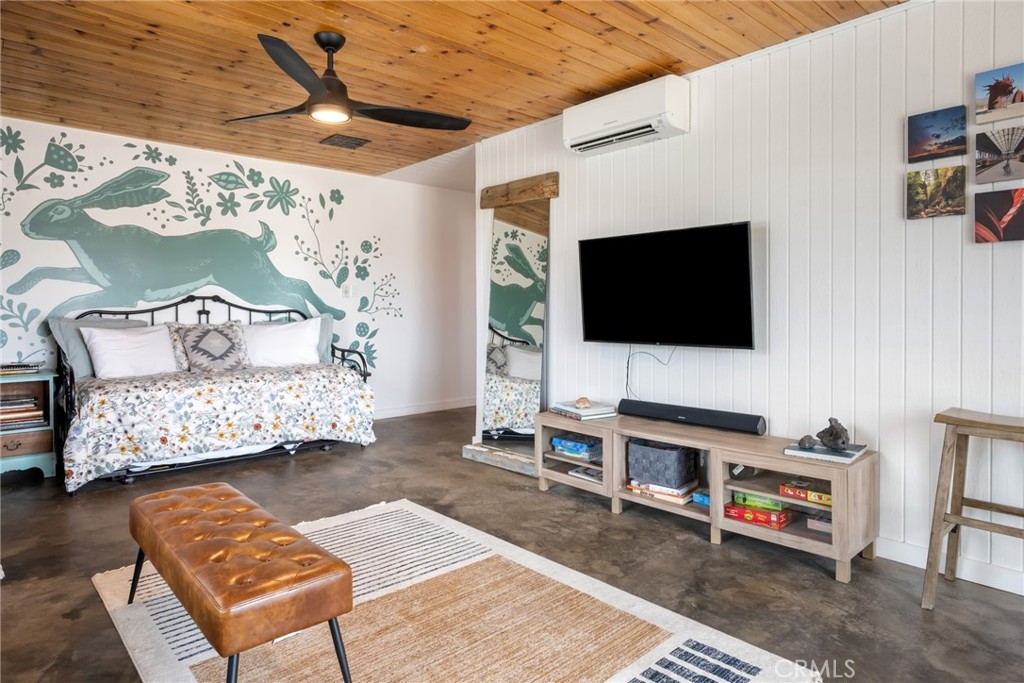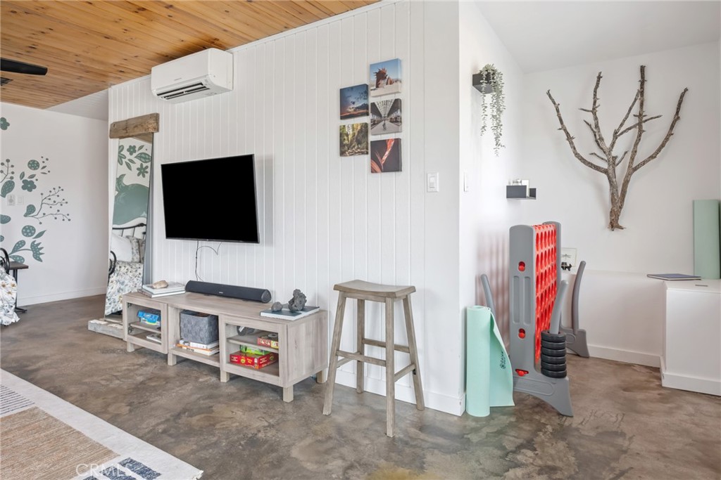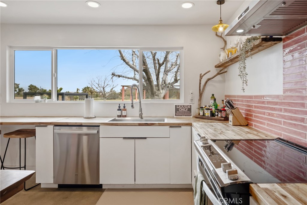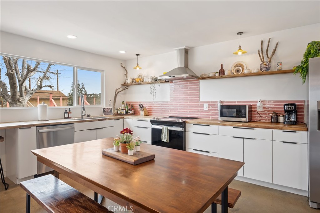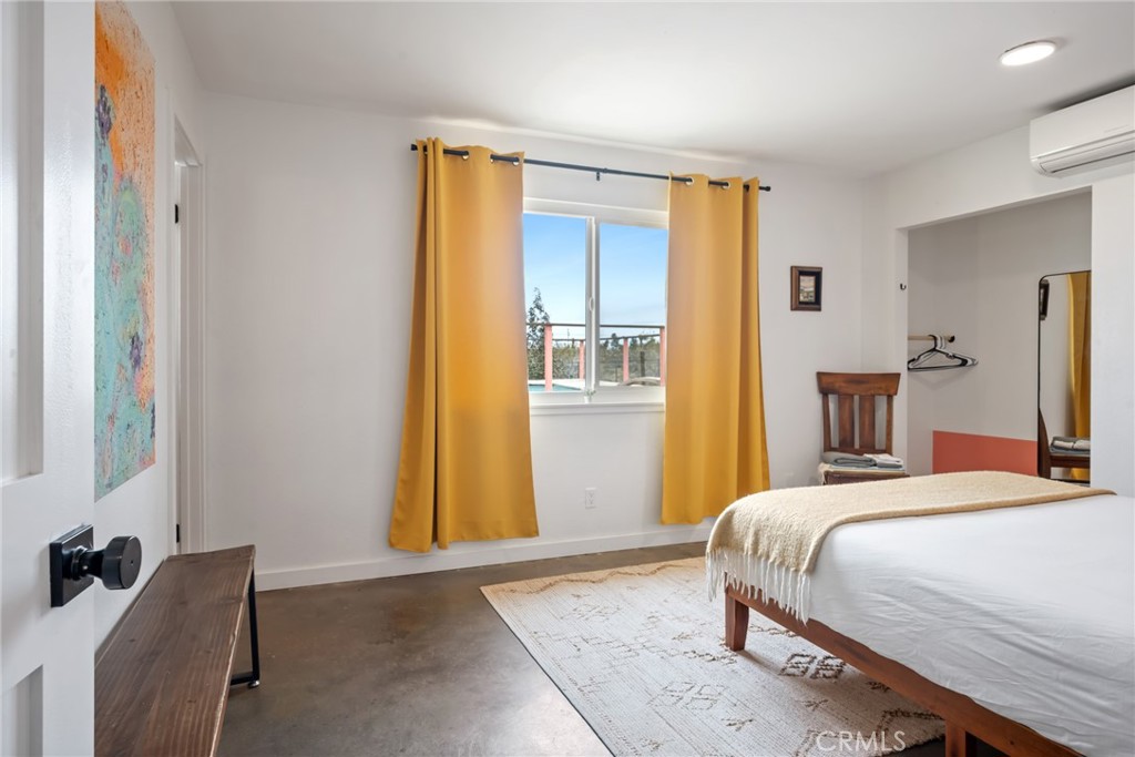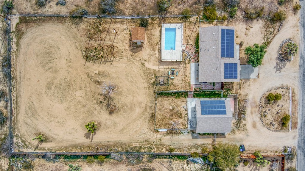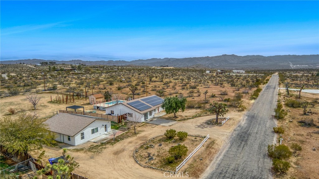 Rare opportunity to own two fully renovated homes on one expansive 1.08-acre lot, showcasing panoramic views of the Joshua Tree mountain range. This exceptional property is ideal for owner occupancy or investment, with a successfully proven short-term rental history as an Airbnb “Guest Favorite,” boasting a 4.9-star average rating and over 115 reviews. The main residence spans 2,005 sq ft and offers 4 bedrooms and 2 bathrooms, thoughtfully updated with modern finishes throughout. The newly remodeled bathrooms showcase beautiful tilework, stylish vanities, and contemporary hardware. The open-concept kitchen flows seamlessly into two distinct living areas, creating an ideal space for entertaining or relaxing. Highlights include quartz countertops, a pantry, updated recessed lighting, and newer electric appliances. The fully renovated ADU offers approximately 960 sq ft, featuring 2 bedrooms and 1 bathroom—perfect for extended family, guests, or rental income. Both units are equipped with efficient mini-split AC/heating systems for year-round comfort. Step out back to enjoy a 10-person above-ground pool, expansive deck, and spacious lot ideal for gatherings or other projects. Pull into the large circular driveway providing parking for up to 10 vehicles, with space for an RV or oversized vehicle. Additional features include solar panels for energy efficiency and a location that’s hard to beat—just 15 minutes to Joshua Tree National Park and 15 minutes to Pioneertown.